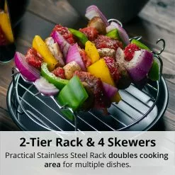Bake, fry, grill, reheat, roast, and toast your favorite meats, breakfasts, desserts, vegetables, and more faster than ever with the Aria 5 Qt. Premium Ceramic Air Fryer! It reaches 400° in seconds using the most powerful air frying technology to cook faster than a traditional convection or microwave oven without the need for extra oil or grease, reducing the fat in your food by up to 80%! Roast mouth-watering chicken wings, sauté sizzling vegetables, grill tender salmon, or bake rich desserts instantly to enjoy and share anytime in this stylish premium black air fryer. The large size allows you to cook for your entire family. The ceramic dishwasher safe basket and crisping rack are PTFE-free, PFOA-free, and BPA-free for extra safety and durability that is easier to clean. The non-toxic, Teflon-free air fryer construction provides excellent heat conduction for even results and won’t peel, flake, or release harmful fumes! The included accessory set includes a two-tier stainless steel rack that doubles your cooking area and allows for cooking different dishes at once. The set also comes with 3 flat stainless steel skewers that are perfect for vegetables and meats, as well as a solid baking pan that is ideal for cakes, omelets, cookies, quiches, brownies, and more! The extended full-color cookbook has exclusive mouth-watering recipes curated by the champions of ABC’s Family Food Fight so you can get started right away! It also features your favorite recipes including vegan and keto options from TV chef Mario Fabbri! Finally, enjoy all your meals in comfort knowing that Aria products have a lifetime warranty and friendly customer service. Endless culinary adventures await with the Aria 5 Qt. Air Fryer Oven!
