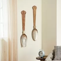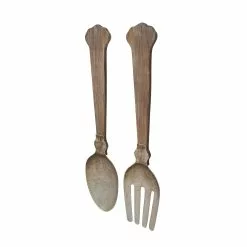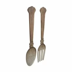 Set a farmhouse culinary tone inside the kitchen or food hall with this two-piece wood and metal wall utensil set crafted from natural fir wood and hammered iron. The spoon and fork flatware’s neutral golden brown wood tone and muted silver finishes work with almost any color palette and wall texture. Easy and ready to hang by metal hardware in back. Suitable for indoor use only. This come in set of spoon and fork utensils wall art. This item comes shipped in one carton.