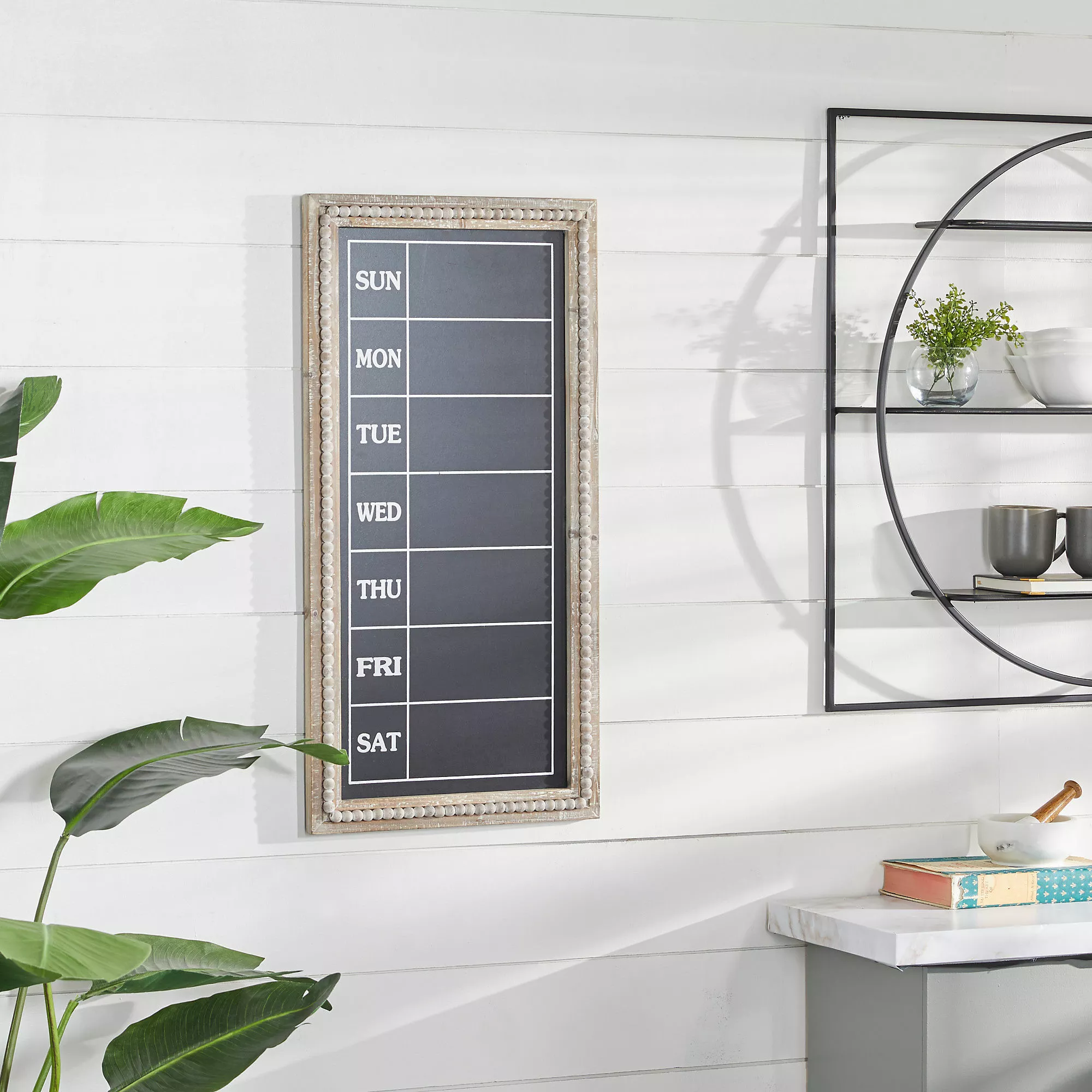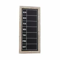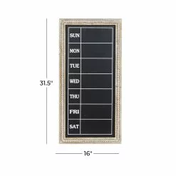 Organize both your home and your week with this traditional style brown wood wall chalkboard with days of the week. This useful and stylish chalkboard features a frame crafted from wood with a natural brown finish. The frame is bordered with decorative distressed white toned beads that add to its vintage charm. The chalkboard itself features a black finish to maximize the visibility of the weekdays that are written in white. Hang this piece on your walls in your office or bedroom to manage your schedule in style. Easily hanging using hanging hardware on the back. This item comes shipped in one carton. Wall decor features weekly calendar Monday to Sunday.