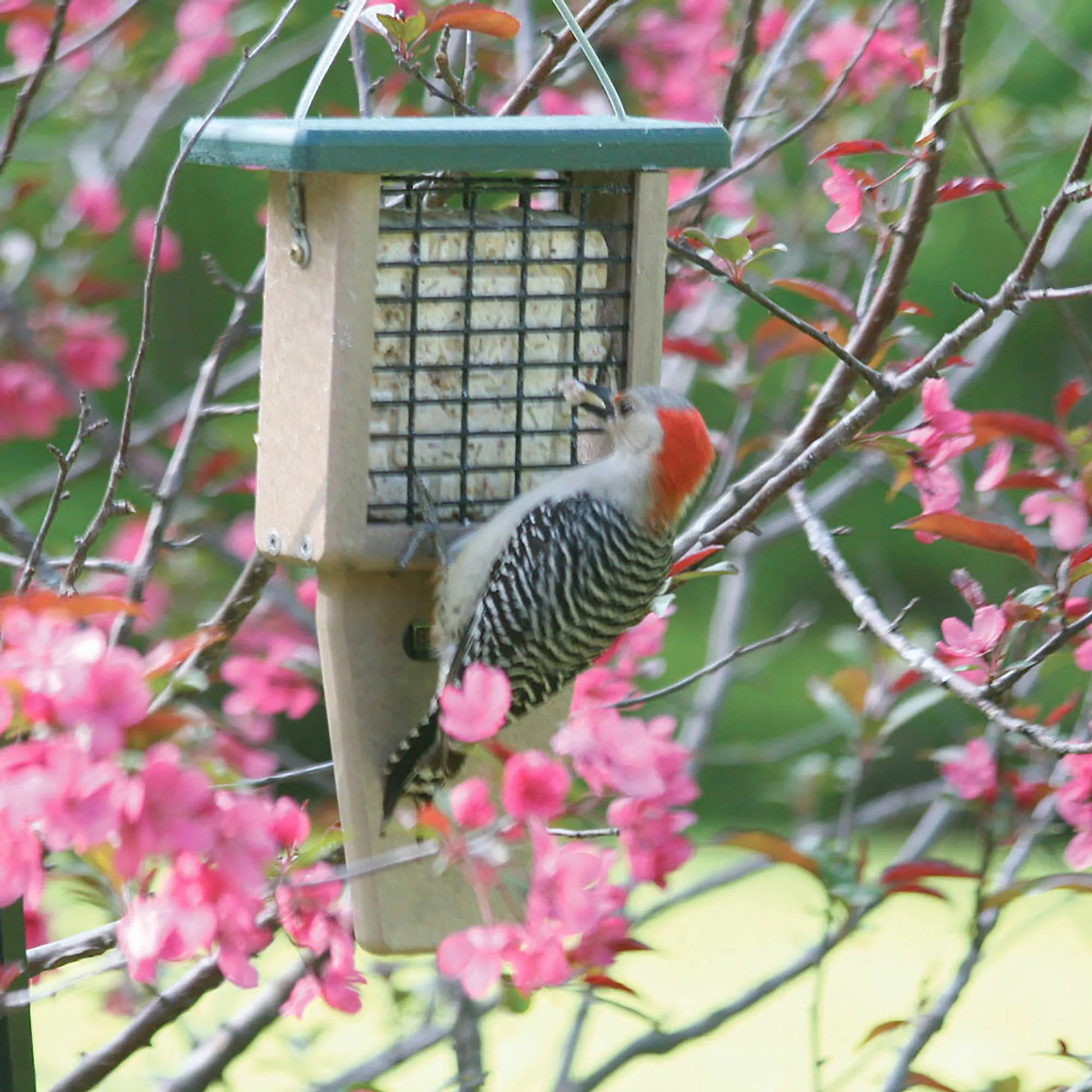This attractive tail prop suet feeder is constructed with recycled poly lumber material It is easy to care for and easy to clean. It holds one suet cake.