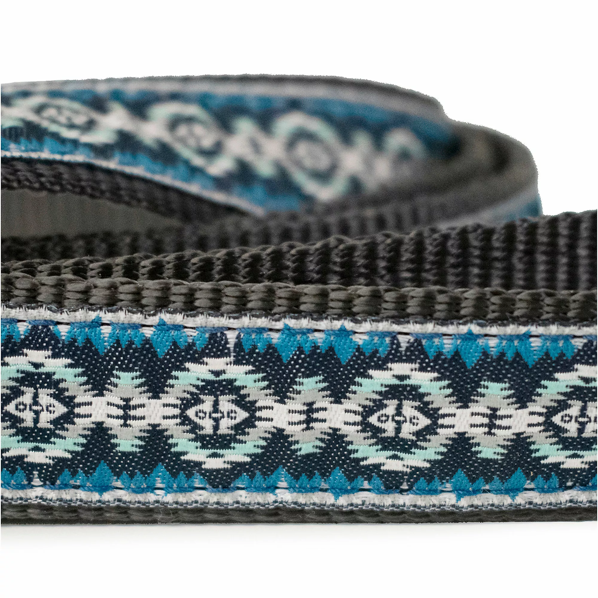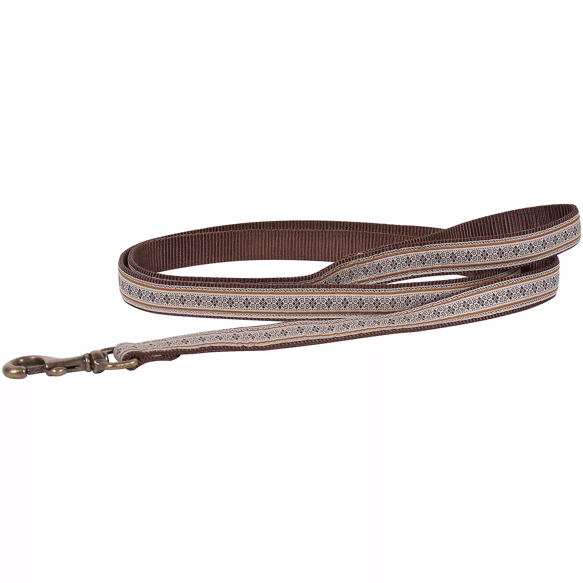 This leash features a polyester jacquard ribbon woven with Pendleton’s Classic Patterns, secured to a nylon webbing. It features a self loop handle with antique brass clip. Also available in a matching collar. Hand wash in cold water only. Air dry.
