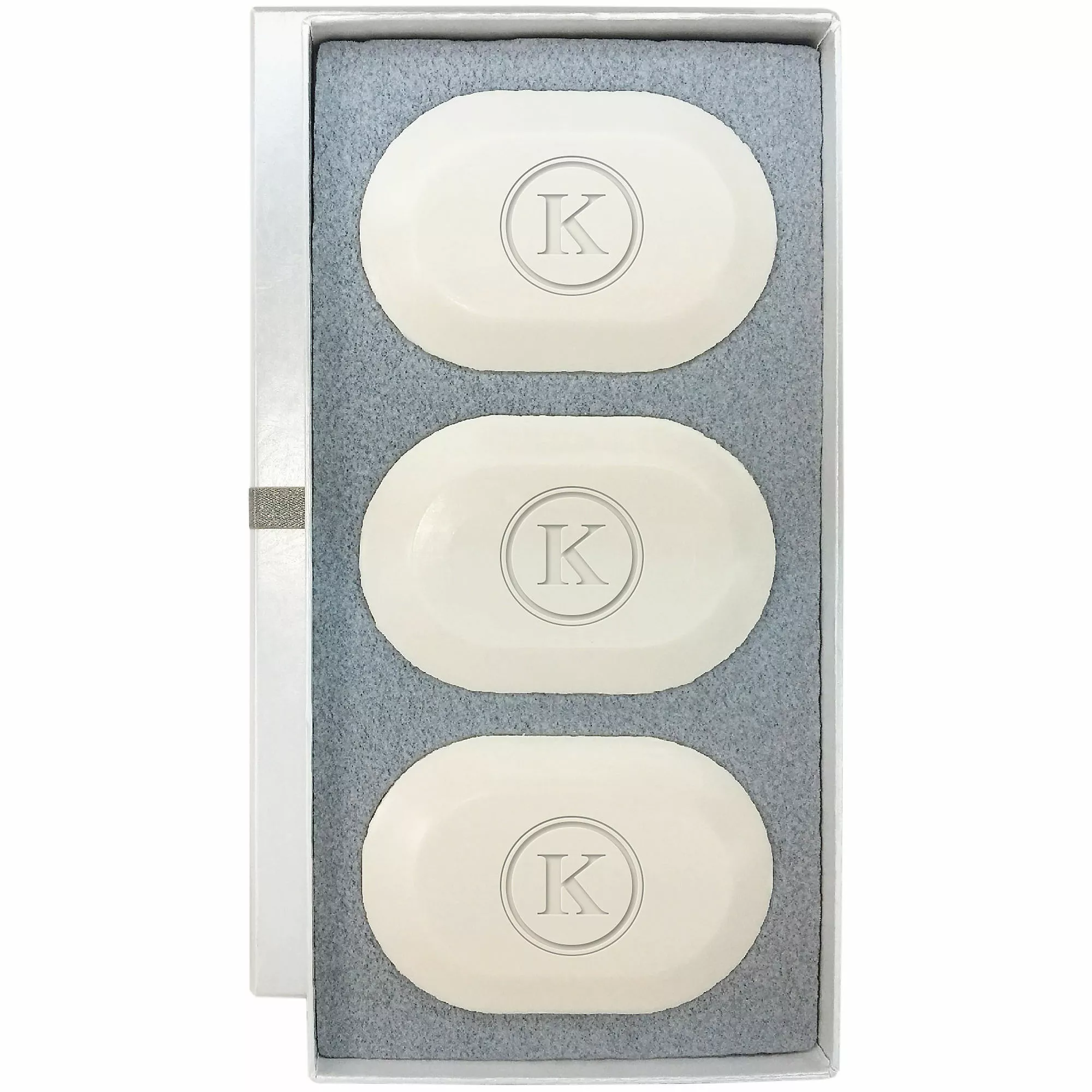 Three 4.5 oz custom carved bars (100% vegetable based, triple-milled, made in Vermont) infused with Aqua Mineral (water-based fragrance, safe for sensitive skin & noses) and presented in a stunning box, with an elegant texture. The soaps are nestled in silver velvet and the entire gift is finished with a silver fabric ribbon.