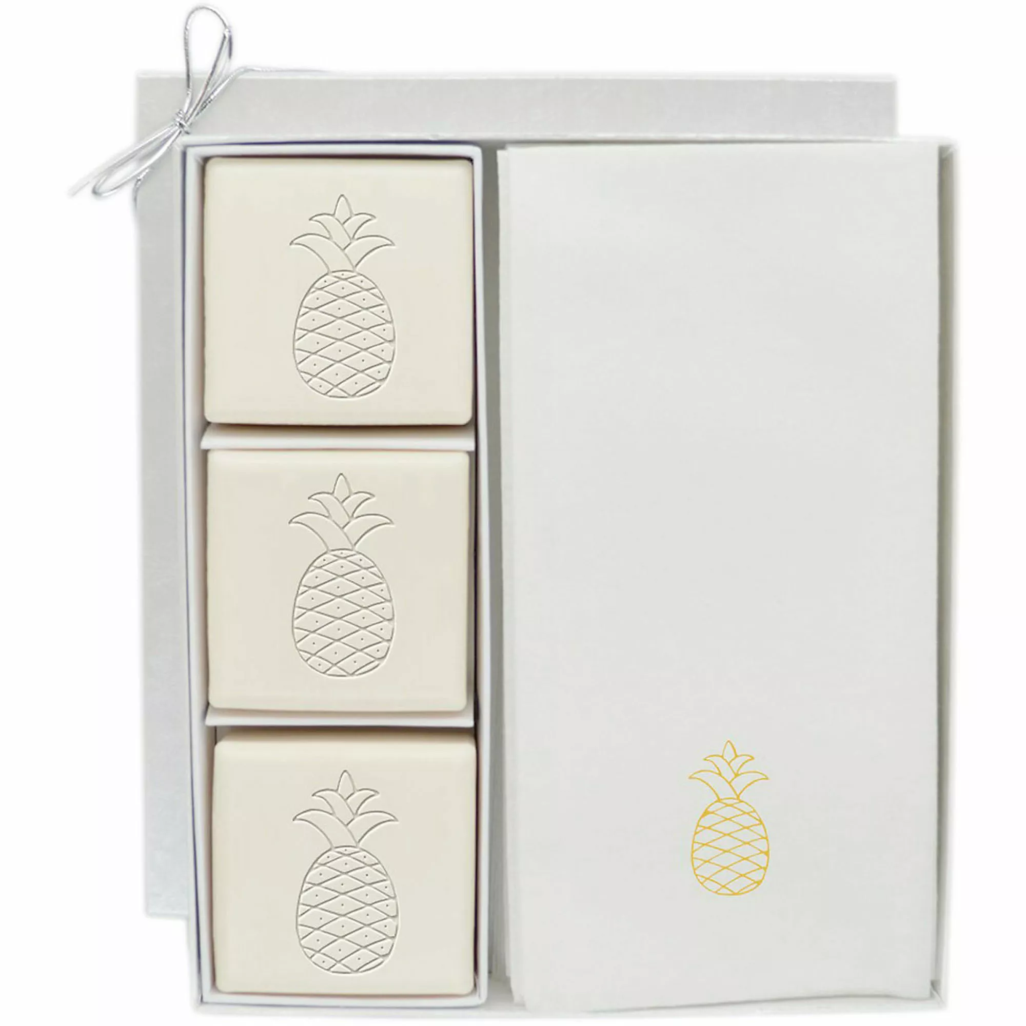 Includes Three- 4oz Square Guest Bars (100% vegetable based, triple-milled, made in Vermont infused with Aqua Mineral (water-based fragrance, safe for sensitive skin & noses) carved to your desire, and 12 Linen Like Towels (air-laid, Made in the USA, disposable) embossed with a nautical anchor in Gold Leaf. Â