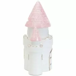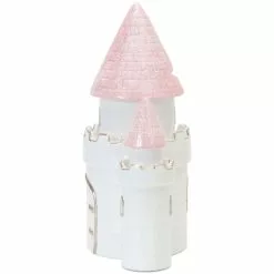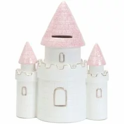 Beautifully glazed castle bank features a hand painted design with gold trim and glitter top. Made of high quality ceramic dolomite for a long lasting classic keepsake. Kids will love learning to save their money as they fill up this special bank.Â