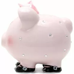 Beautifully glazed pig bank features a hand painted design,silver crown, pink bow and rosy cheeks. Made of high quality ceramic dolomite for a long lasting classic keepsake. Kids will love learning to save their money as they fill up this special bank.