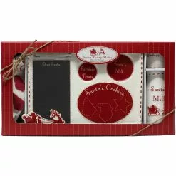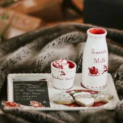 Start a Christmas tradition with this enchanting 3-piece ceramic set with 3 stainless cookie cutters. Platter has a chalkboard center so you can leave a message for Santa (and he can write back). Set includes a message platter, Reindeer Treat Bowl, milk jug, 3 cookie cutters jute bag with recipes and non-toxic soapstone chalk.Â