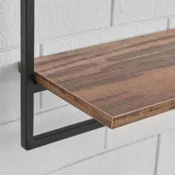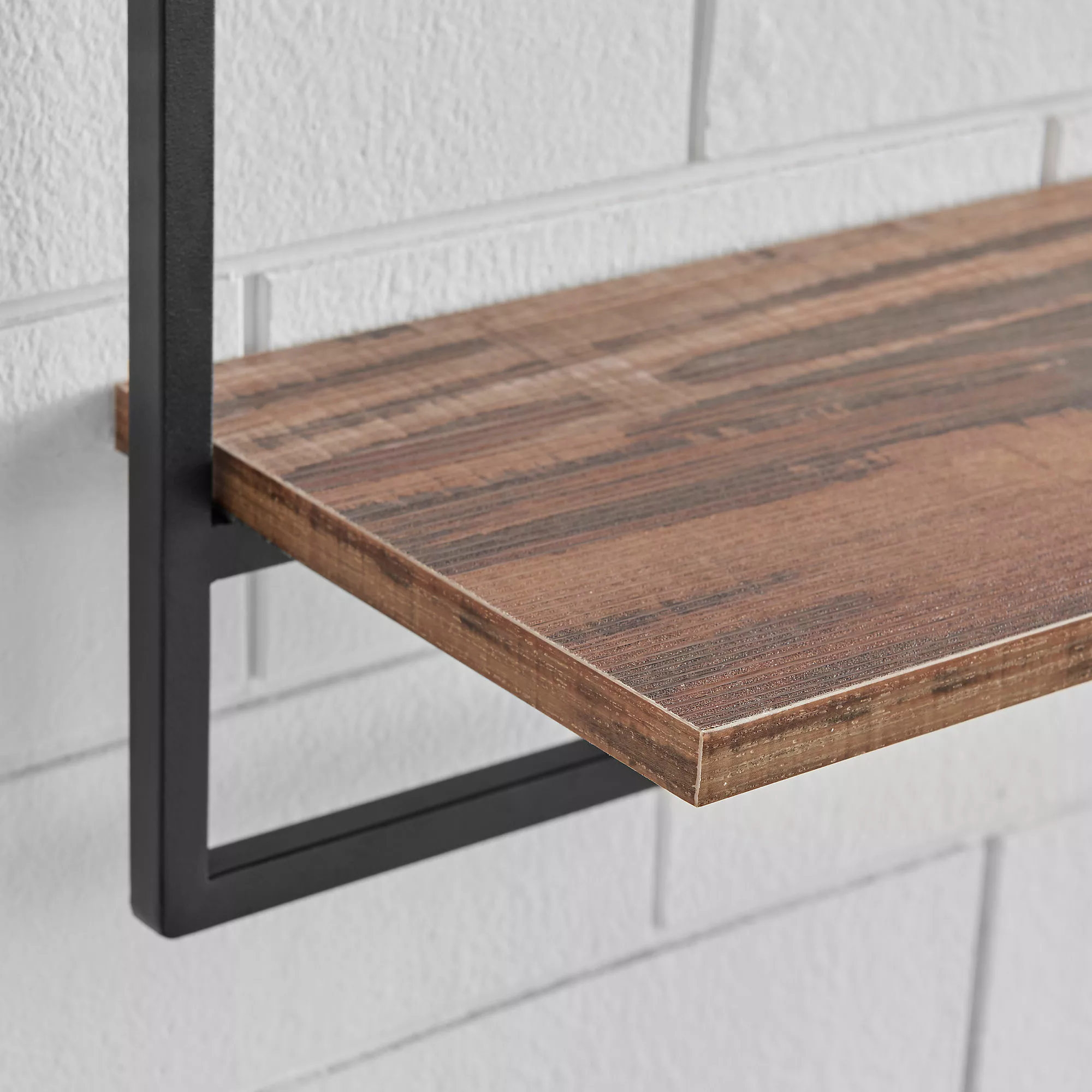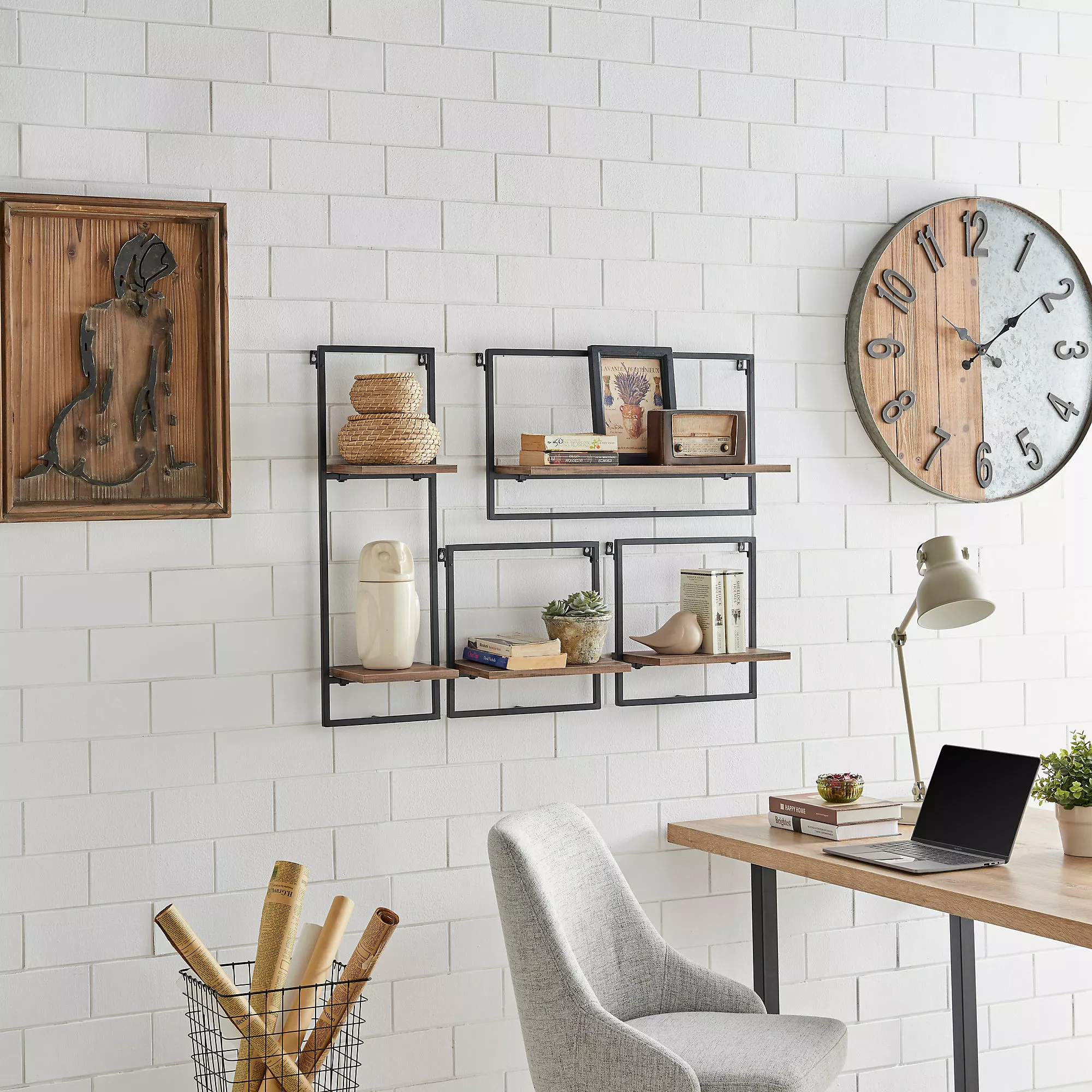 The Danya B 4-Piece Wall Shelf Set creates a multi-dimensional appeal on your wall. Each component frames beautiful shelves in distressed wood finish in an open iron frame. Set includes a long rectangle, a tall double shelf rectangle, and two square frames that can be scattered or placed as a concentrated grid to create a geometric gallery on your wall. Anyway you choose to arrange them you will create an eye-catching wall art out of displayed picture frames, books, decorations and collectibles.