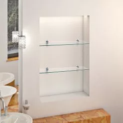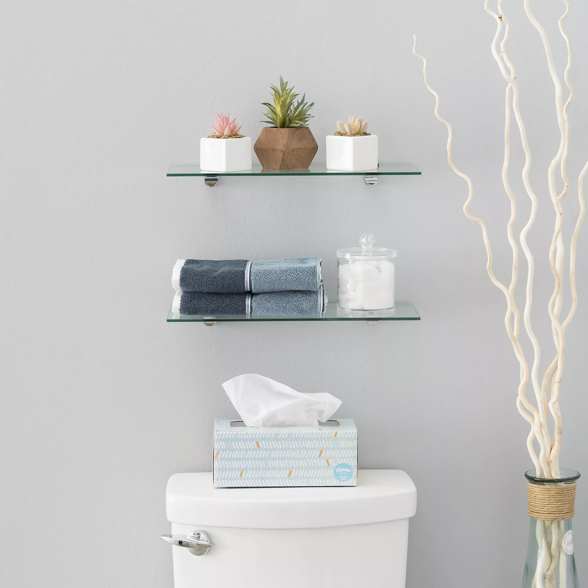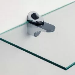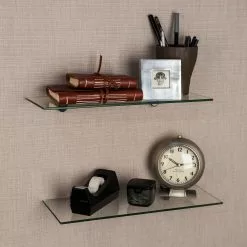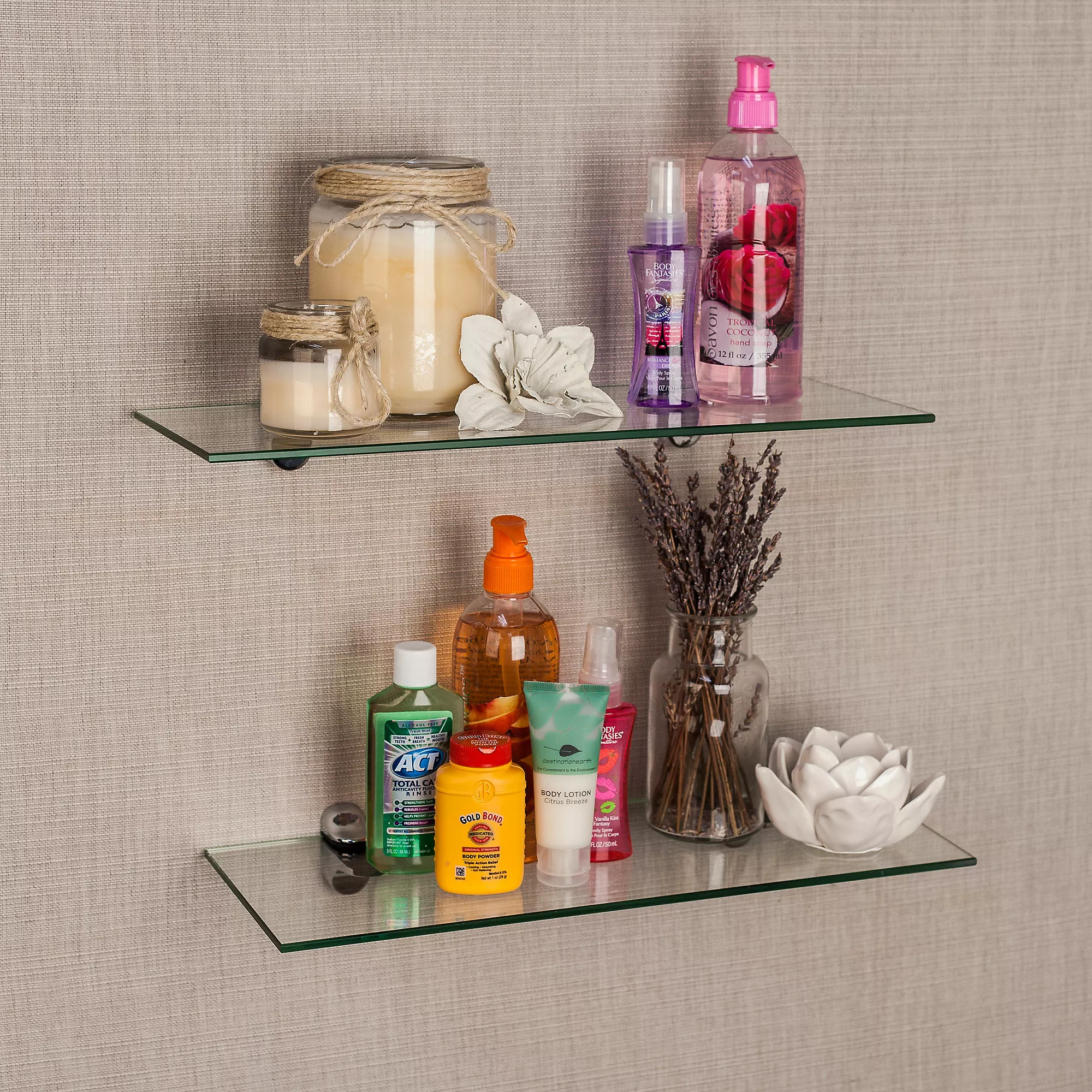 Danya B. Pair of 16″ Clear Glass Floating Shelves with Chrome Brackets can add storage space and a modern look to any room at home or at the office. Each shelf comes with two chrome brackets that mount easily to the wall. Danya B. glass shelves are made of strong tempered glass, also known as safety glass, and finished with highly polished edges.
