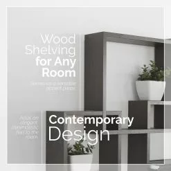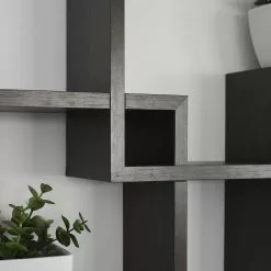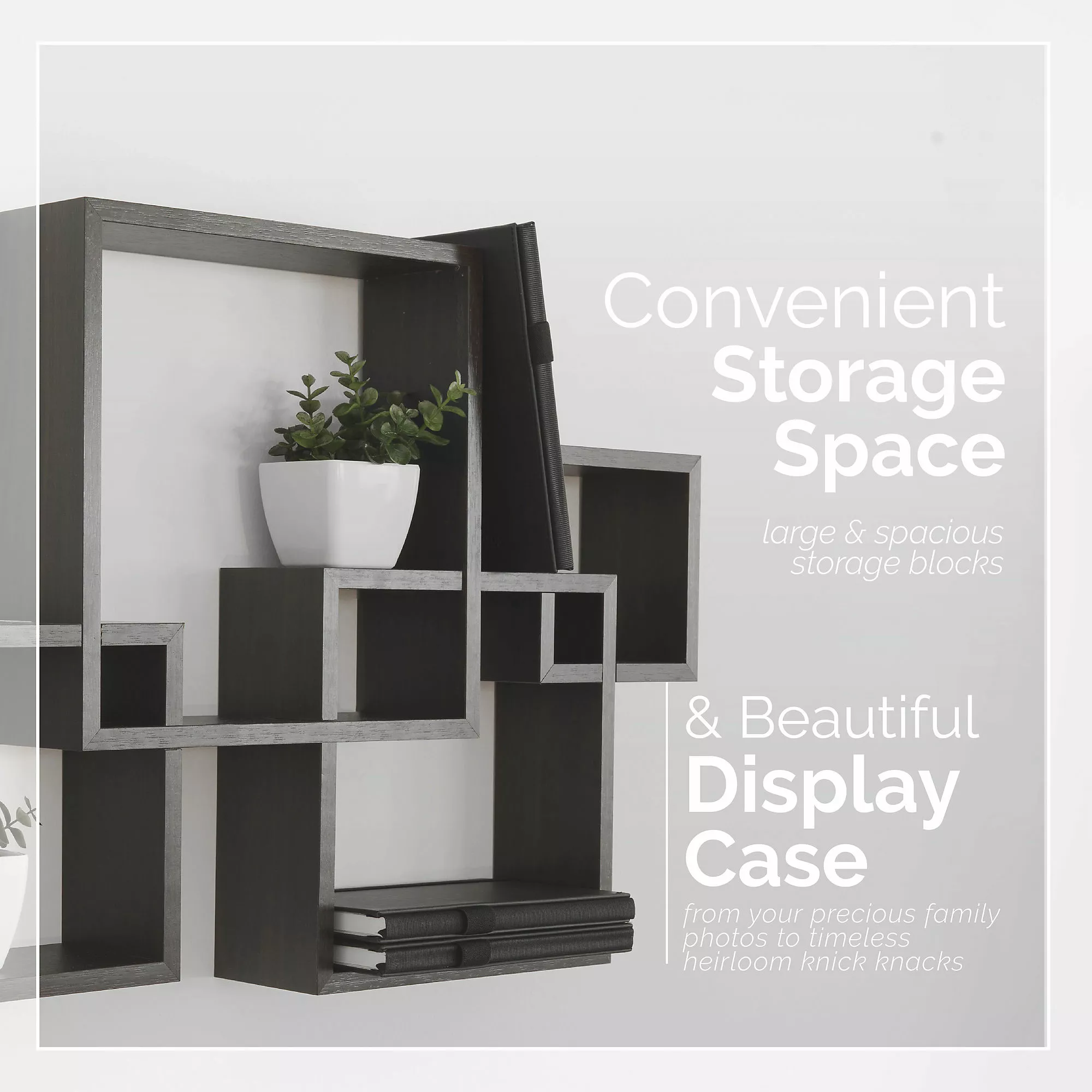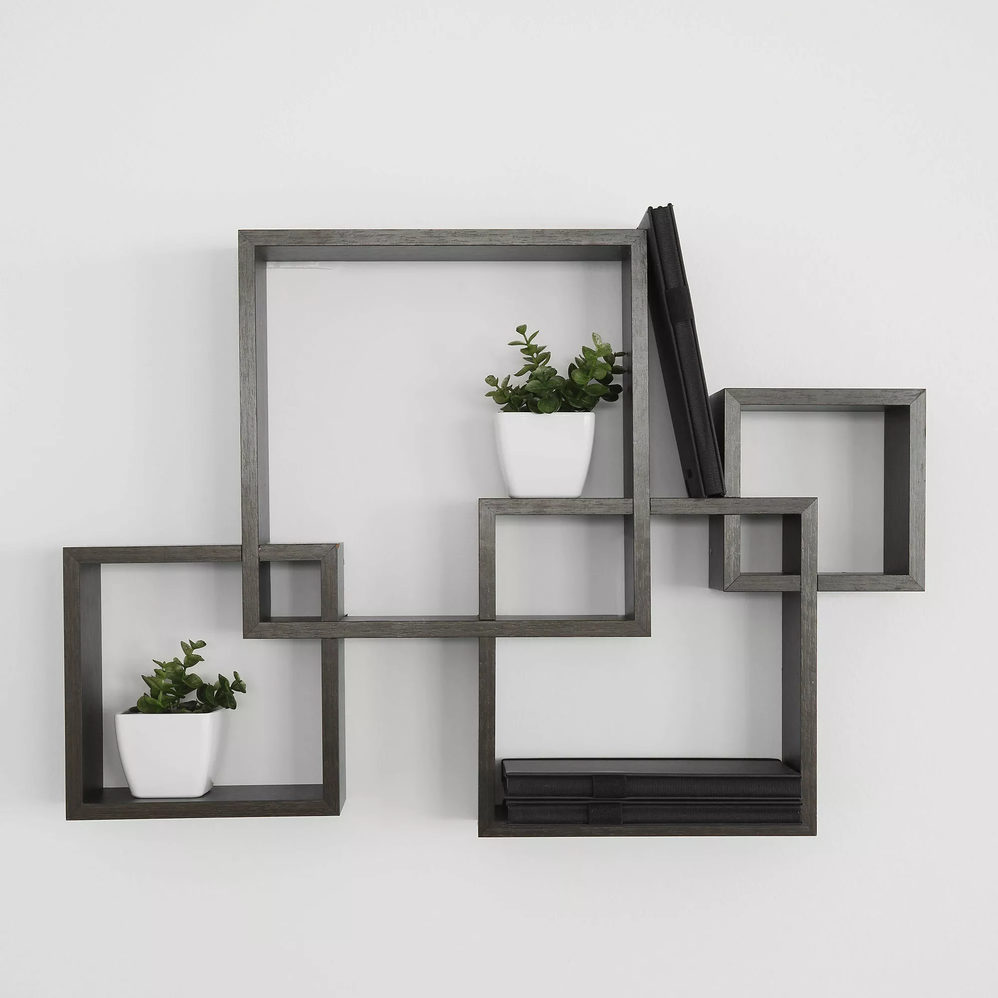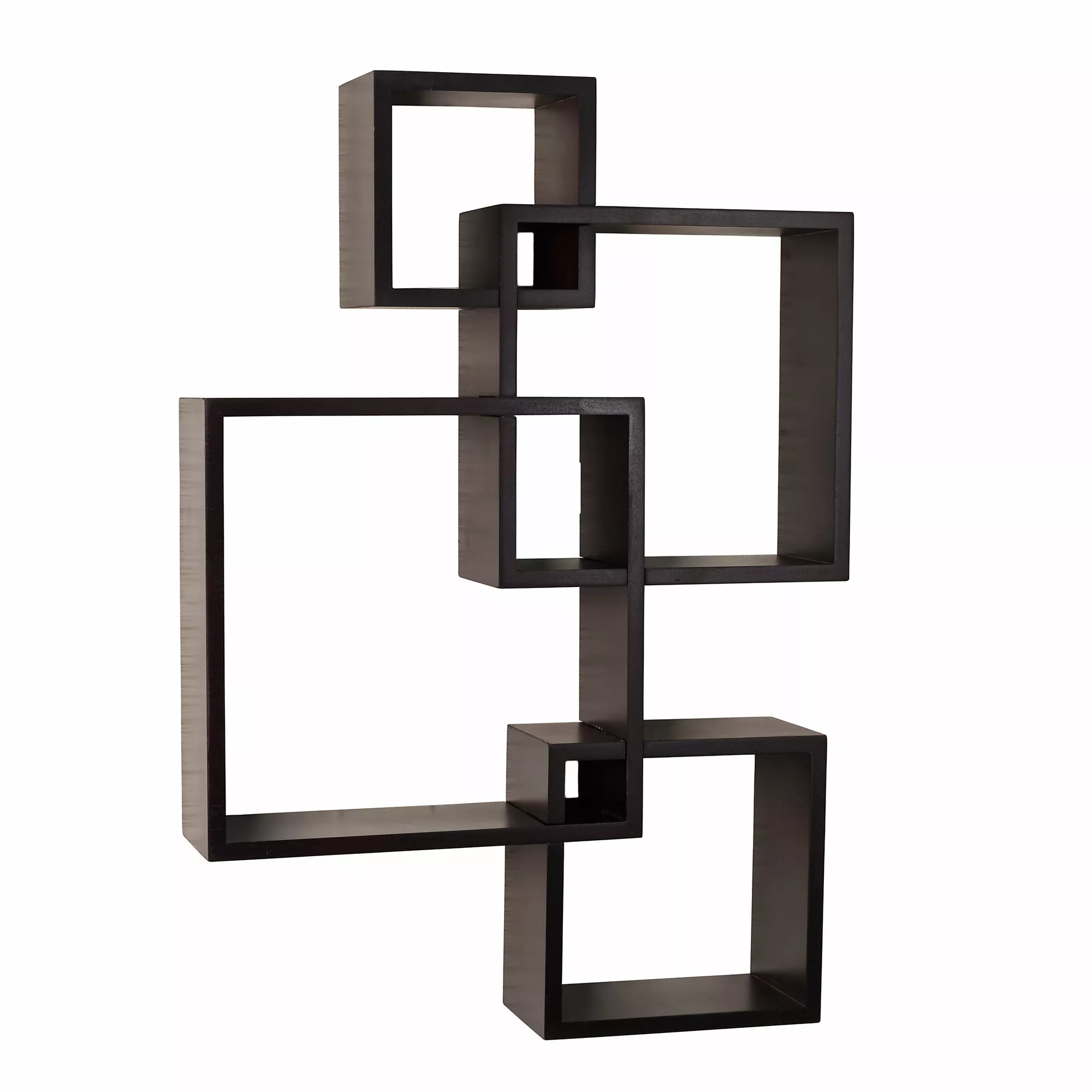 Danya B. fun intersecting cubes wall shelf features four intersecting cubbies plus level display space on top of them. Its contemporary black finish will add a touch of home décor to your walls as you display your favorite photos , accessories and collectibles.Â