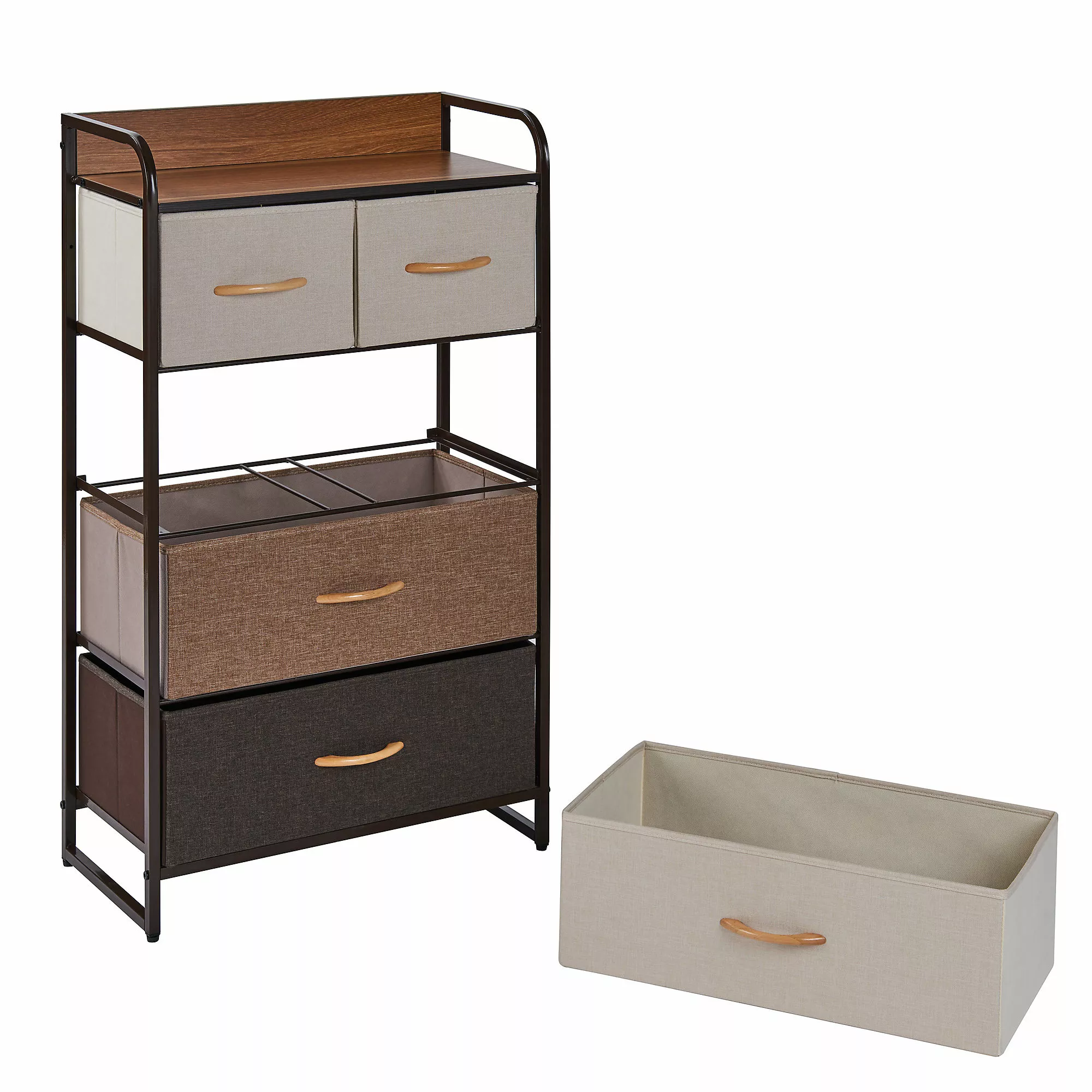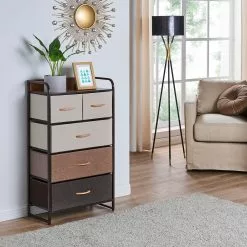 For style and storage space, look no further than the Danya B. Fabric 5-Drawer Storage Chest Dresser. A great space-saving addition to tight spaces, this storage chest features five spacious and lightweight fabric drawers in a stunning gradient of brown and cream colors. Elegant wooden pulls adorn the drawer fronts, while the sturdy black-finished steel offers unfaltering durability. A solid wooden top allows the display of tabletop decor, picture frames, lamps, or other gadgets. The slim yet stately design makes it a great addition to apartment, condos, offices, bedrooms, and dorm rooms with limited spaces. Can be used in combination with the Danya B. Decorative Modern Tall and Narrow Dresser/Chest Storage Tower with 4 Fabric Drawers to have an extended set.