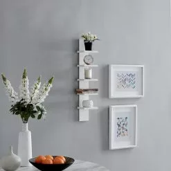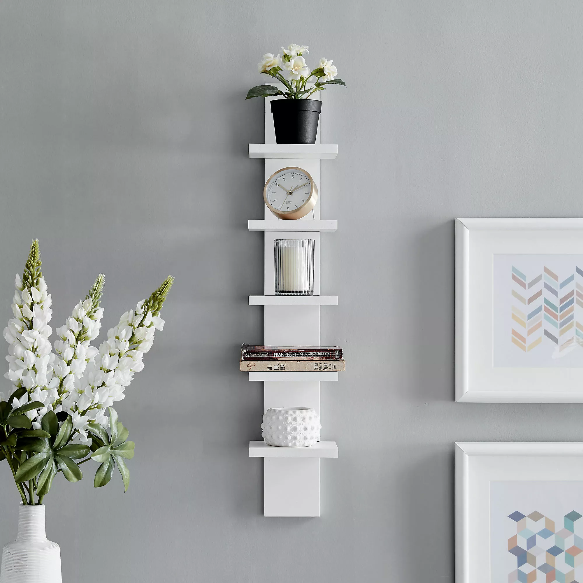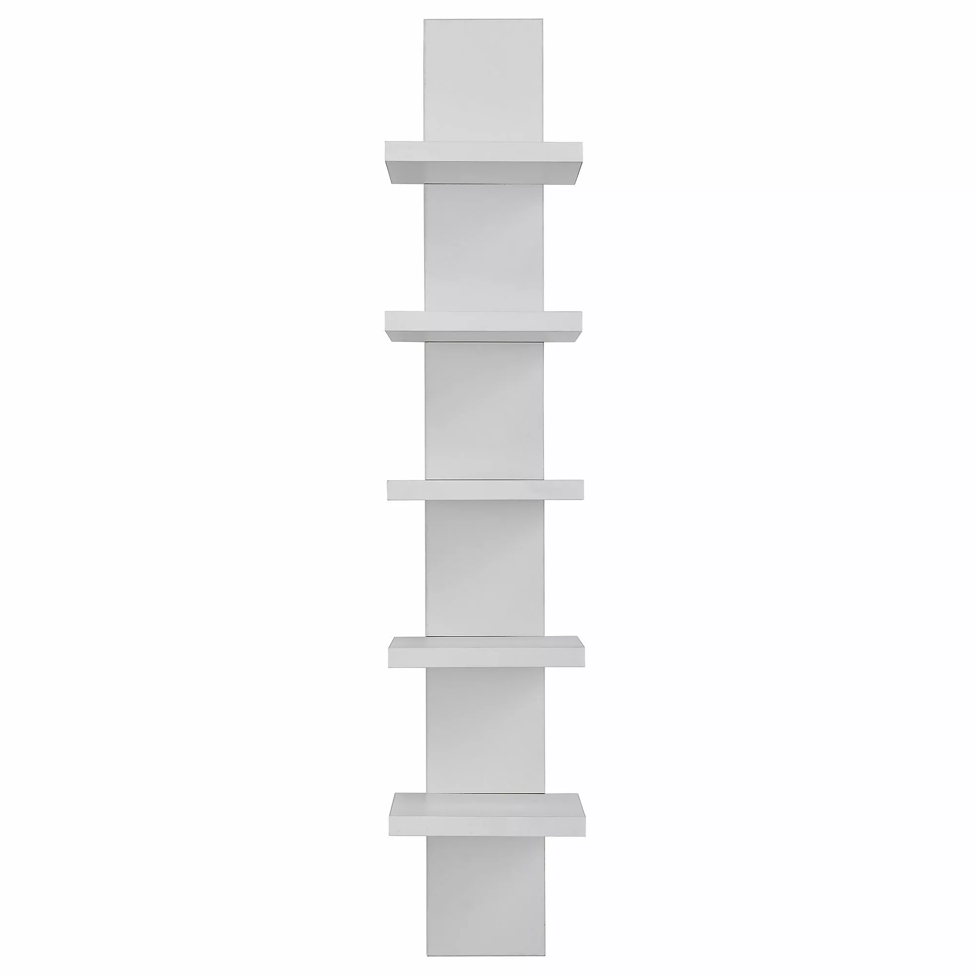 Danya B. Five Tier Wall Shelving is a creative design and space saving solution for small areas. With its contemporary finish, it is an ideal accent for any living space. Minor assembly is required.Â