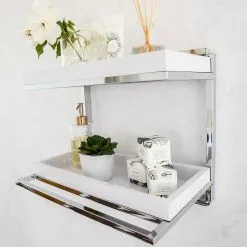 Danya B. Bathroom Accessories and Décor – Keep your bathroom clutter-free with this Wall Mount 2-Tier Chrome Shelving Unit with Towel Rack and White Removable Trays. Sleek and streamlined with a focus on modern functionality, this wall shelf features a minimalist design with its clean lines and unadorned look. A built-in hanging bar keeps your towels within reach, while two removable white trays offer plenty of display space for your bathroom needs. The sleek chrome frame makes this wall shelf a stylish modern accent that’s perfect for today’s urban bathrooms.