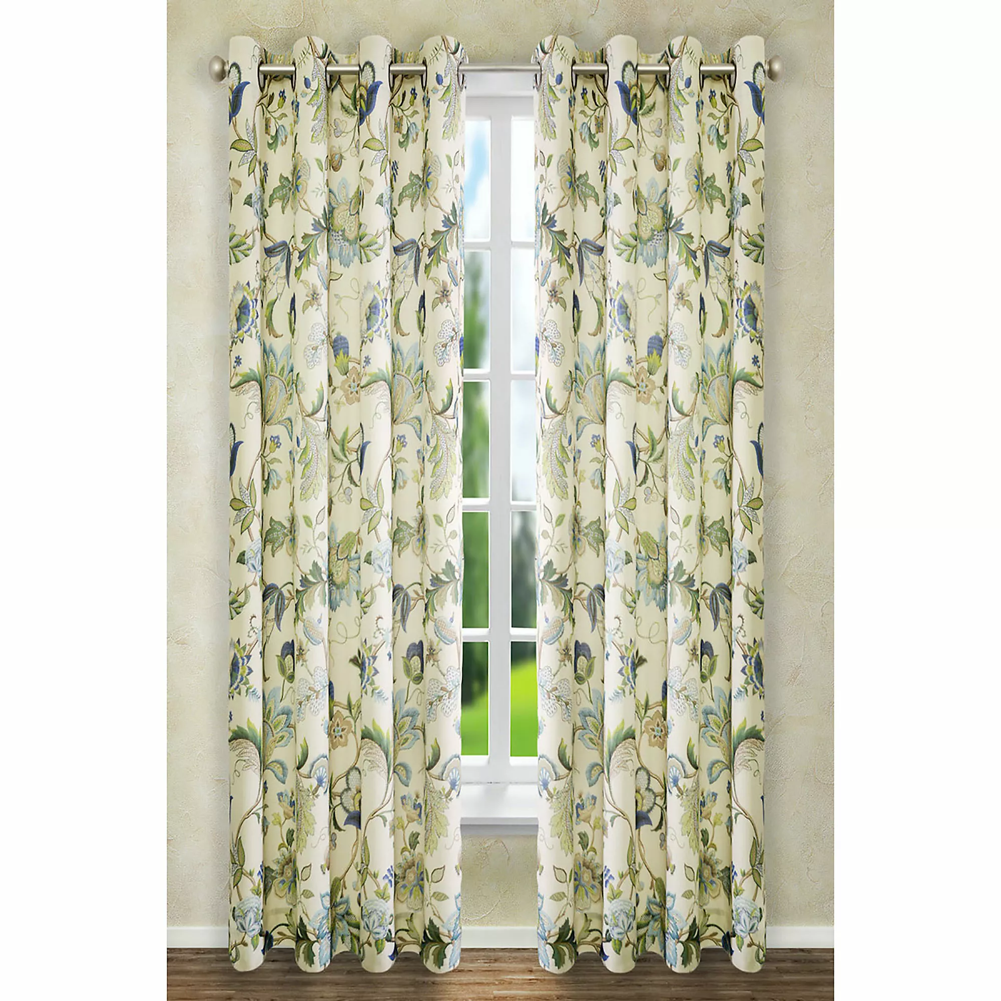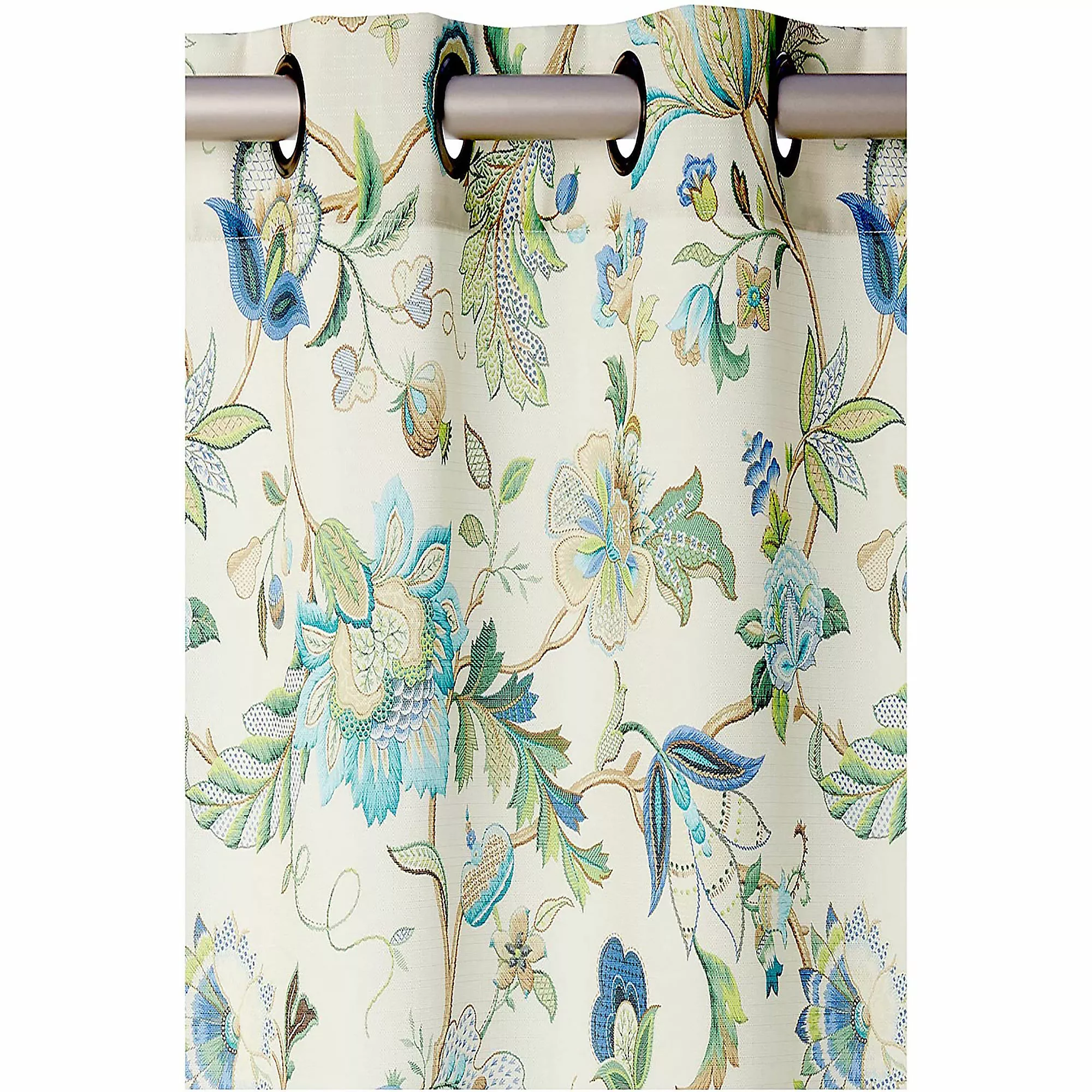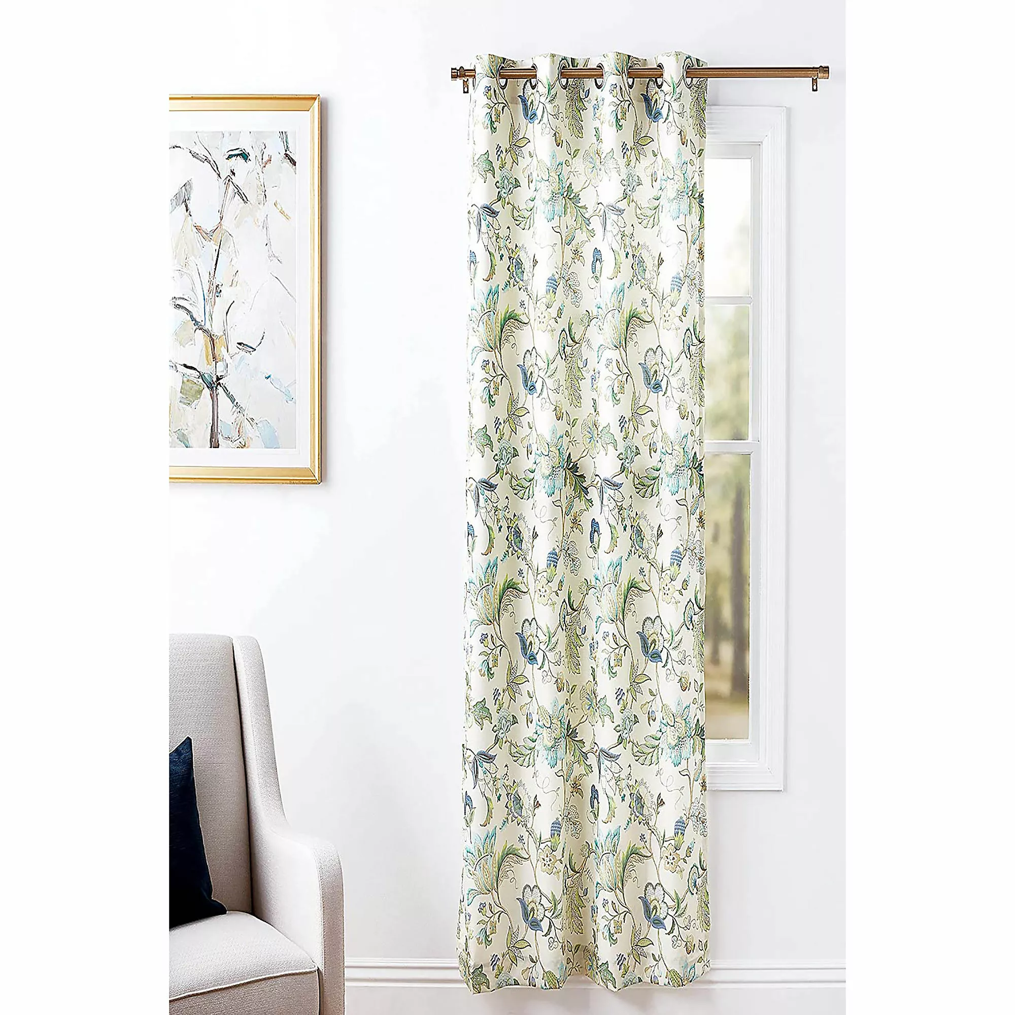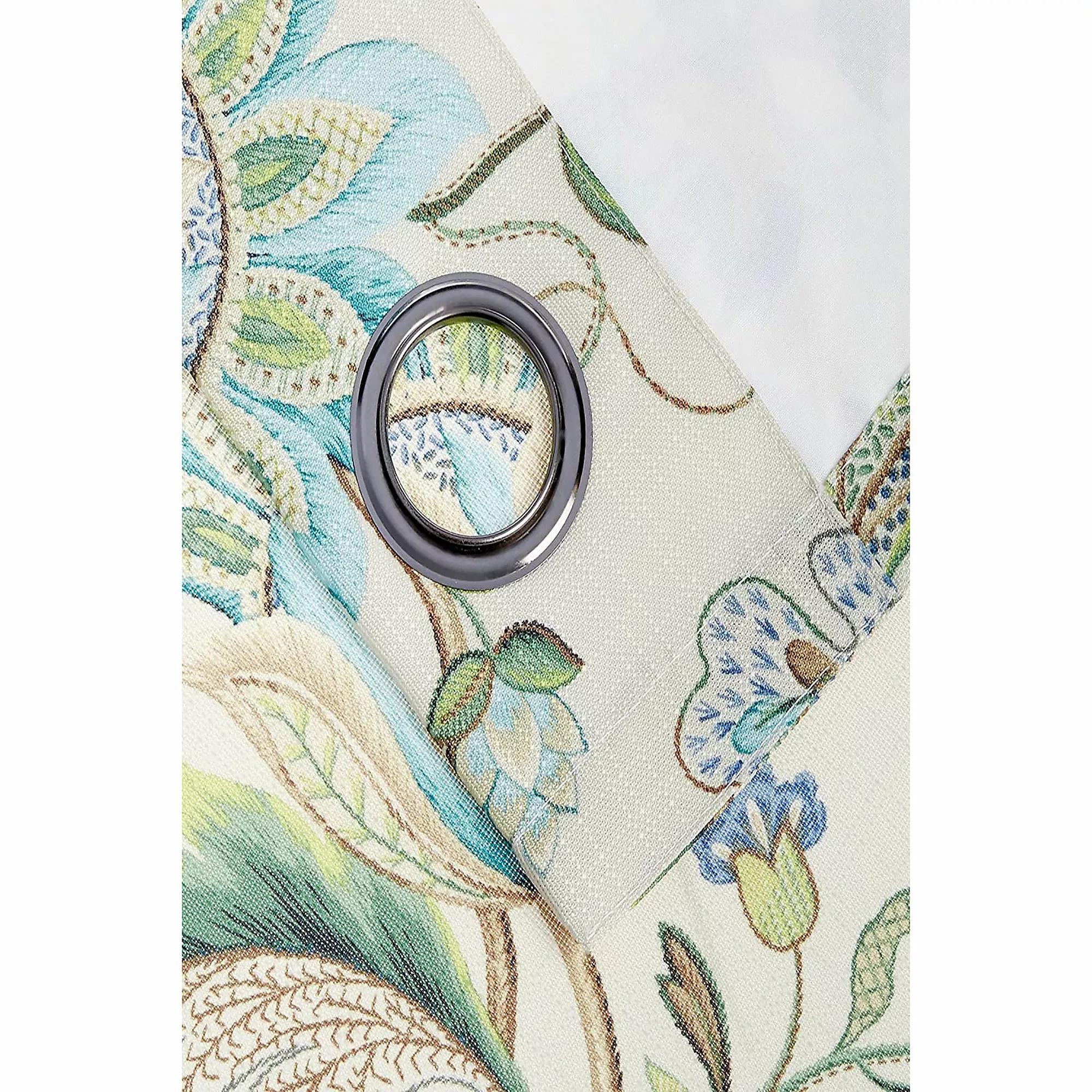 Classic Jacobean floral meets a stylish color pallet for this fashionable window treatment. Made with 100-percent polyester textured high quality fabric creates a smooth draping effect, soft feel, and easy care. Each panel is constructed with 8-grommets sewn into a 3-inch header, full natural colored liner and 3-inch finished bottom hem. Grommets measure 1 5/8-inches inside diameter and simply slide over your standard or decorative curtain rod making them one of the easiest curtains to hang. Sold as a single panel, width is measured overall 50-inches.