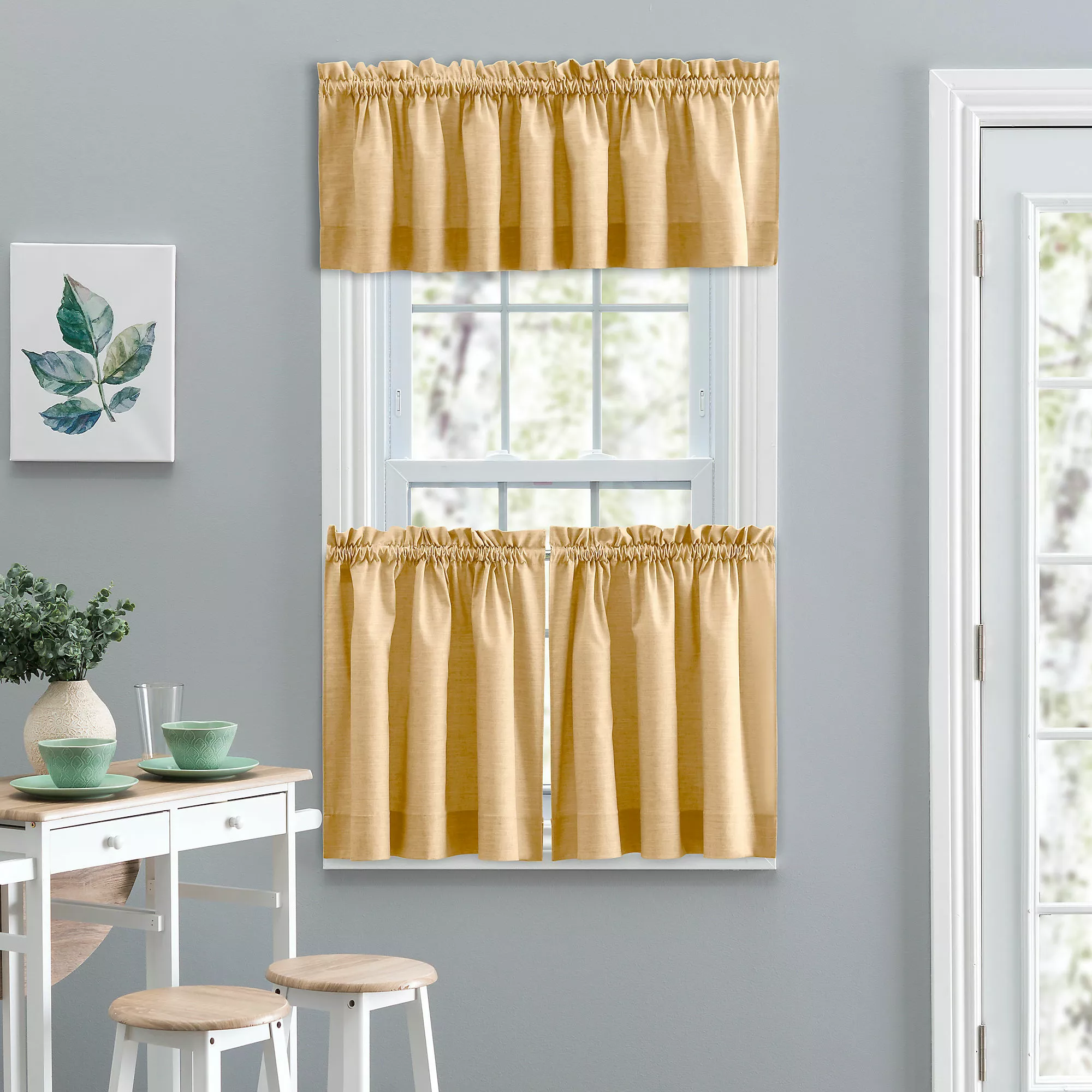 A stunning textured solid that is both relaxed and refined. Beautifully coordinates with any pattern. Made with 50-percent polyester/50-percent cotton duck fabric that creates a smooth draping effect, soft texture and easy maintenance. Tailored Tier curtains are used to cover the lower portion of your windows or used alone on shorter length windows. Each curtain panel is constructed with a 1.5-inch header and 1.5-inch rod pocket. Sold in pairs (2 panels) width measures 56-inches (both 28-inch panels together). For wider windows add multiply panels together.Â