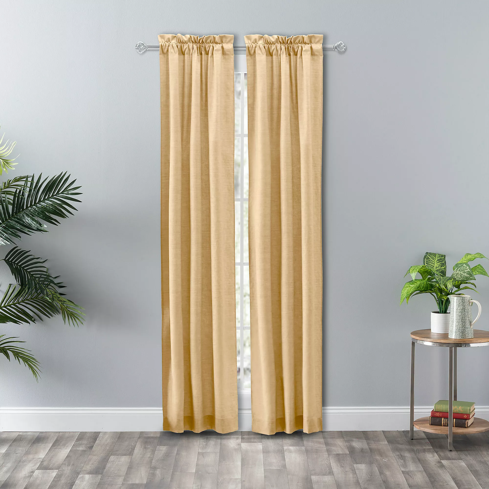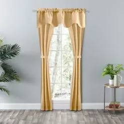 A stunning textured solid that is both relaxed and refined. Beautifully coordinates with any pattern. The tailored panel pair is made with 50-percent polyester/50-percent cotton duck fabric that creates a smooth draping effect, soft texture and easy maintenance. Each curtain panel is constructed with a 1.5-inch header and 1.5-inch rod pocket. Two tiebacks are included for a different look. Width is measured overall 56-inches (both 28-inch panels together). For wider windows simply add multiply panels together.