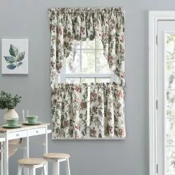Make a colorful, stylish statement in any room with this rich and beautiful floral. Made with 50-percent polyester/50-percent cotton duck fabric that creates a smooth draping effect, soft texture and easy maintenance. Tailored Tier curtains are used to cover the lower portion of your windows or used alone on shorter length windows. Each curtain panel is constructed with a 1.5-inch header and 1.5-inch rod pocket. Sold in pairs (2 panels) width measures 56-inches (both 28-inch panels together), while length measures 36-inches from top stitch down. For wider windows add multiply panels together.Â