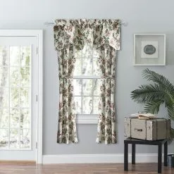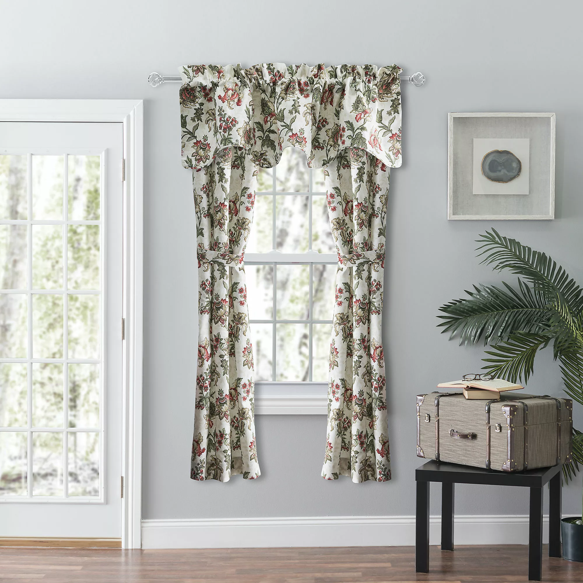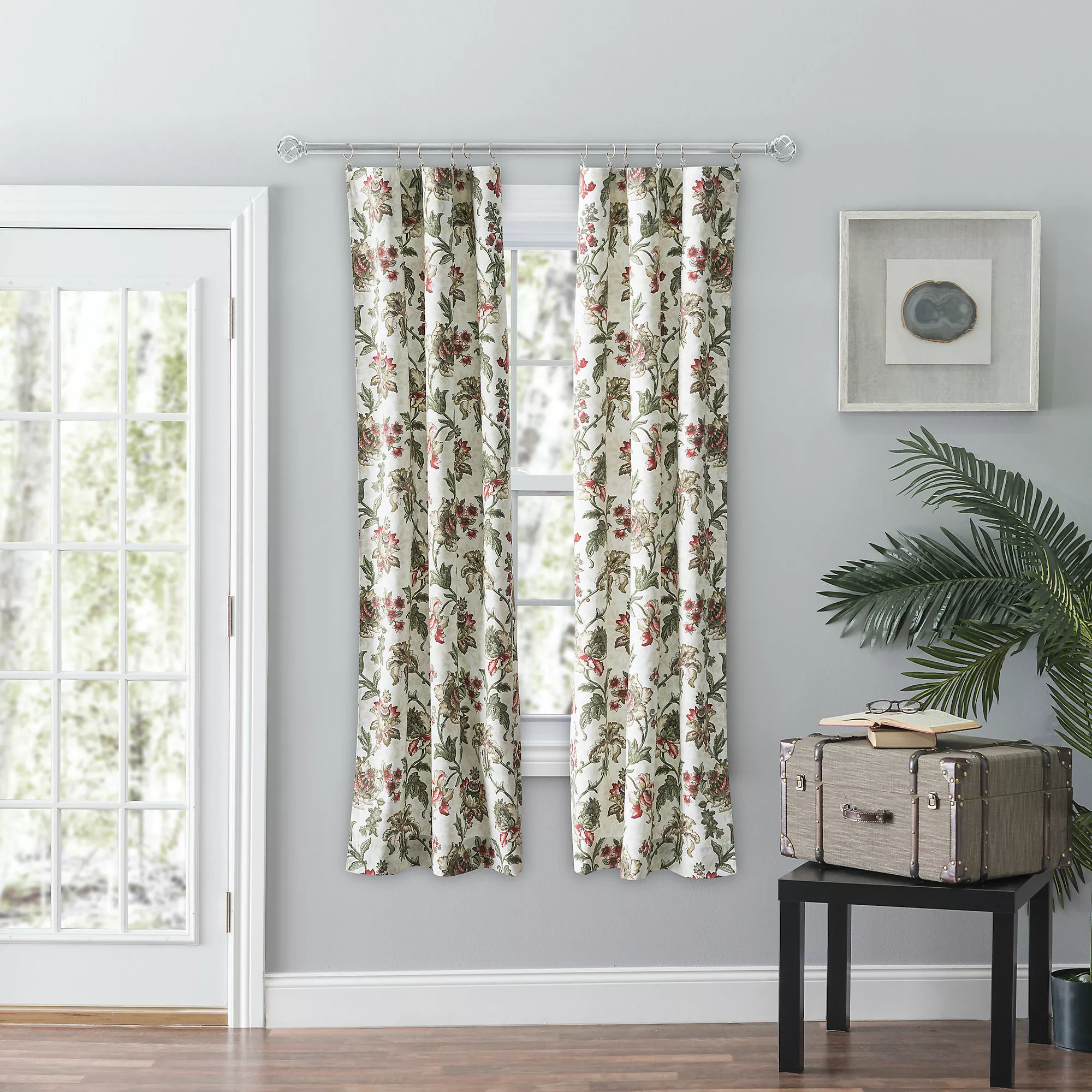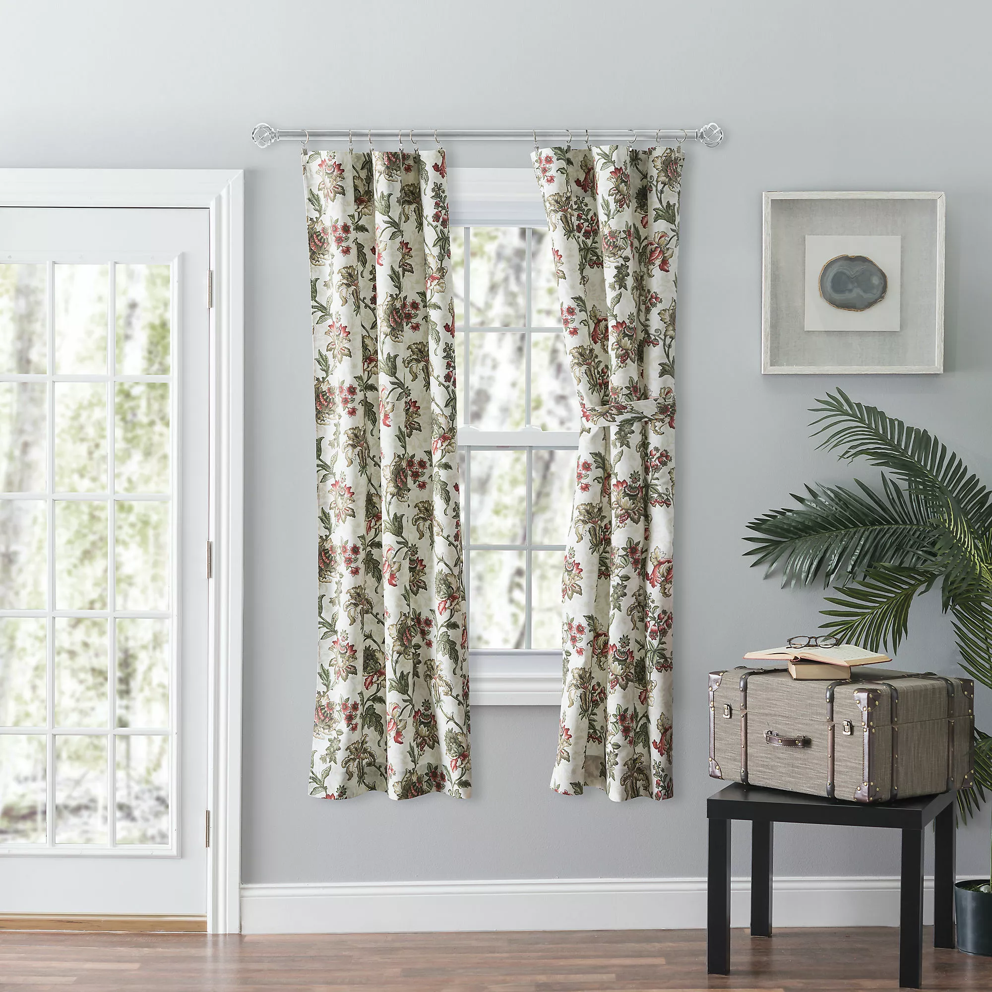 Make a colorful, stylish statement in any room with this rich and beautiful floral. The tailored panel pair is constructed using 50-percent polyester/50-percent cotton duck fabric that creates a smooth draping effect, soft texture and easy maintenance. Each curtain panel is constructed with a 1.5-inch header and 1.5-inch rod pocket. Two tiebacks are included for a different look. Width is measured overall 56-inches (both 28-inch panels together), while length is measured at 84-inches. For wider windows simply add multiply panels together.Â