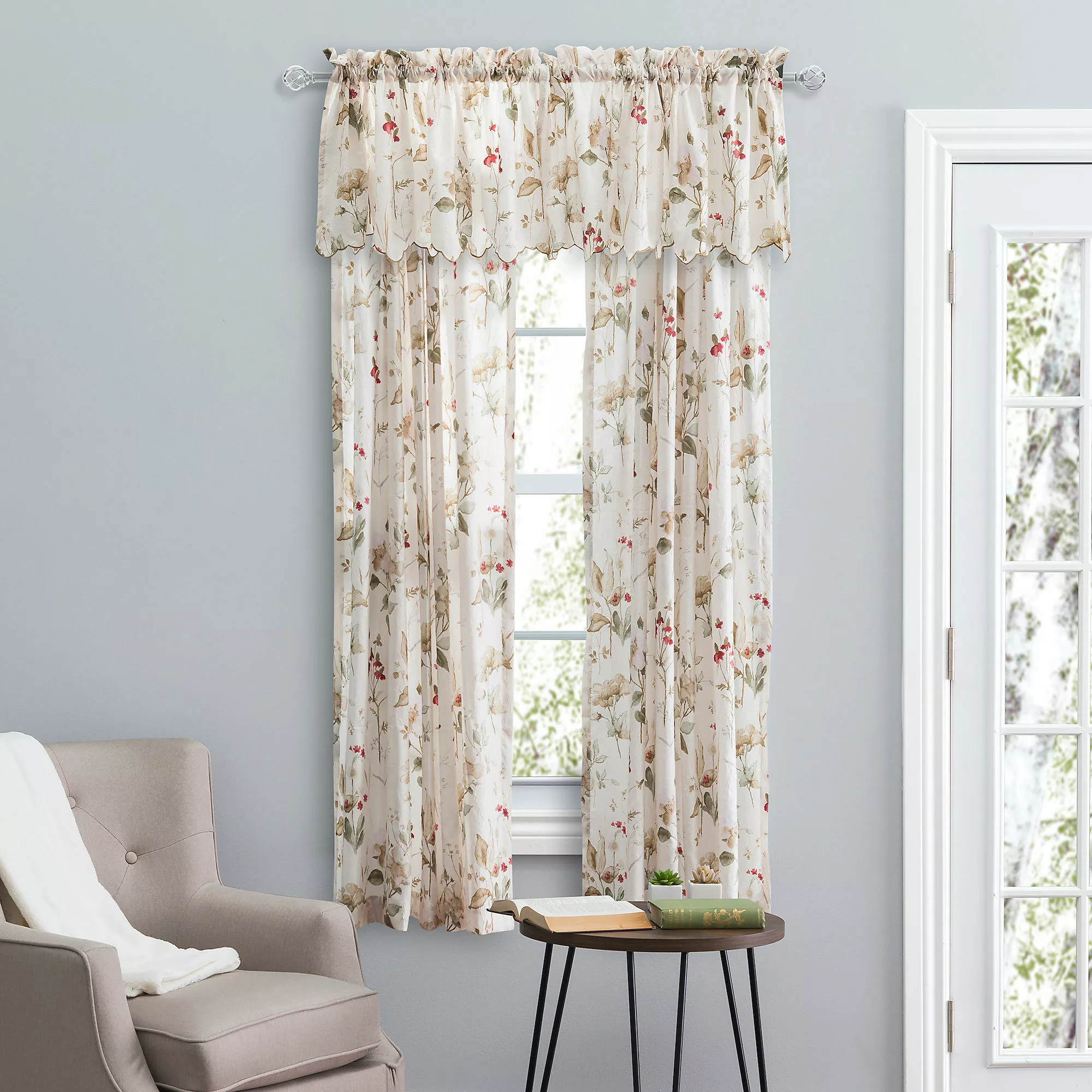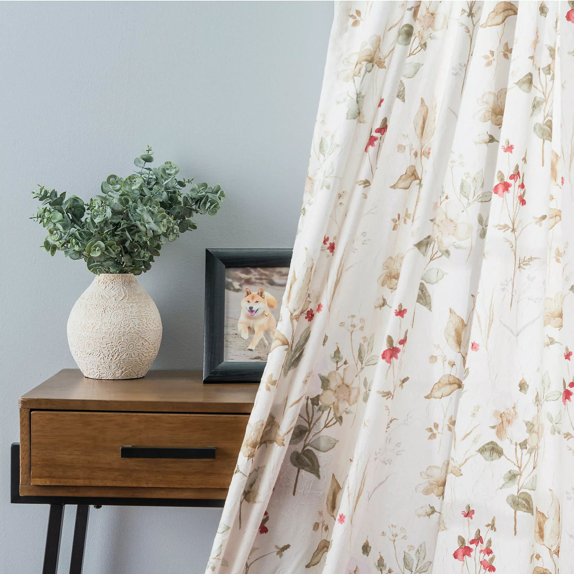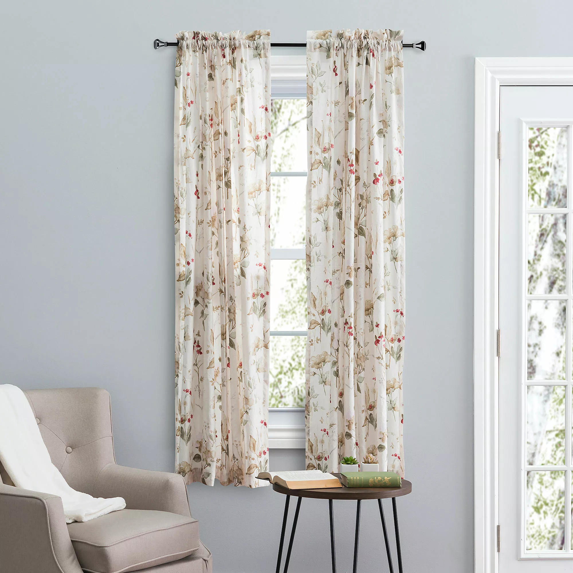 Colorful florals dance across this breezy panel. Crushed taffeta fabric creates a nicely textured, translucent look to bring a breath of fresh air and subtle sunshine into any room. Made of 100% polyester crushed taffeta. The tailored panel is sold as a single panel measuring 48-inches wide. For wider windows use multiple panels.
