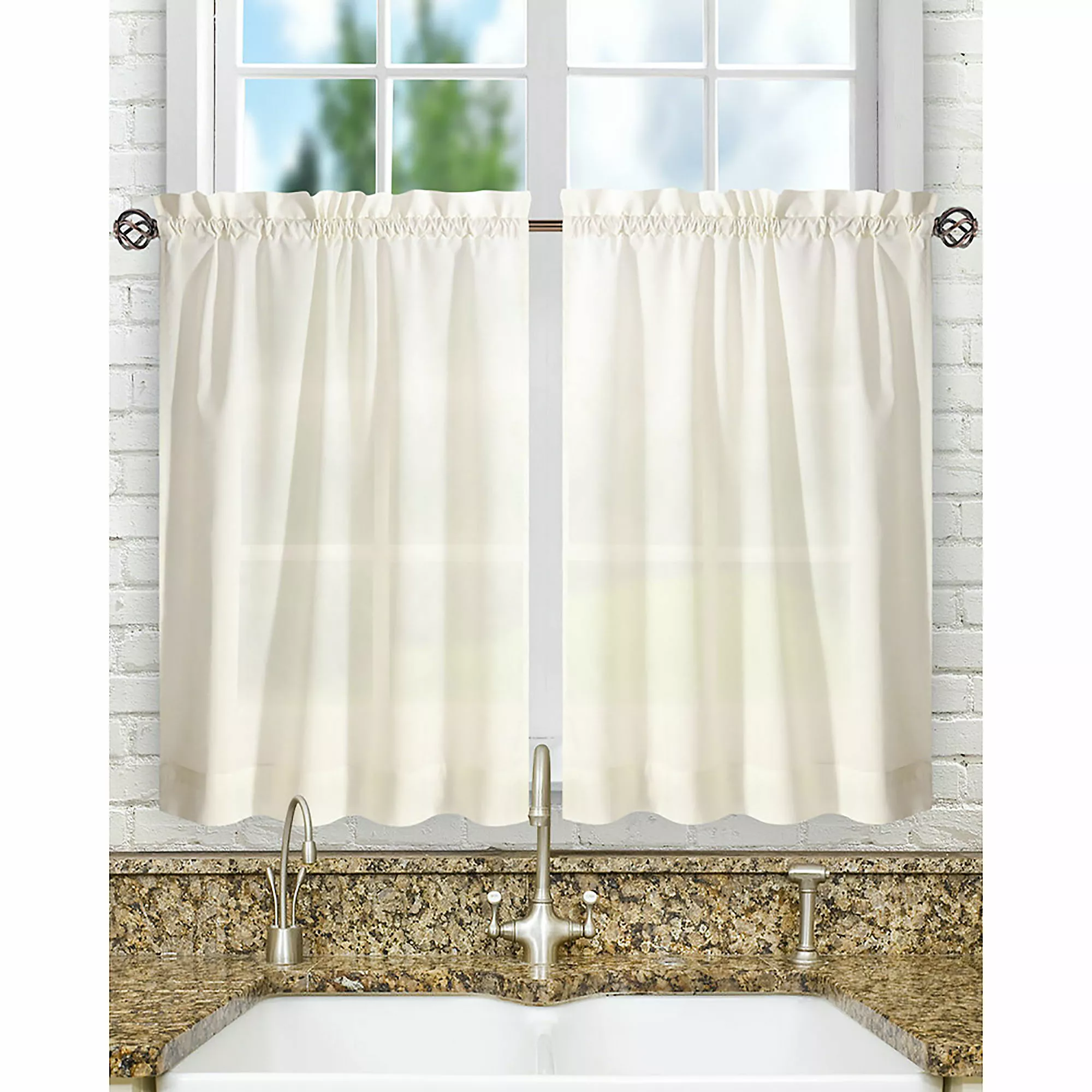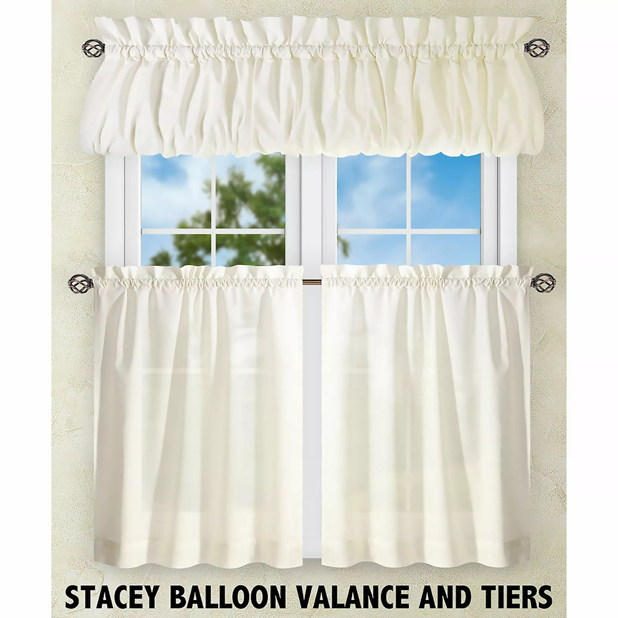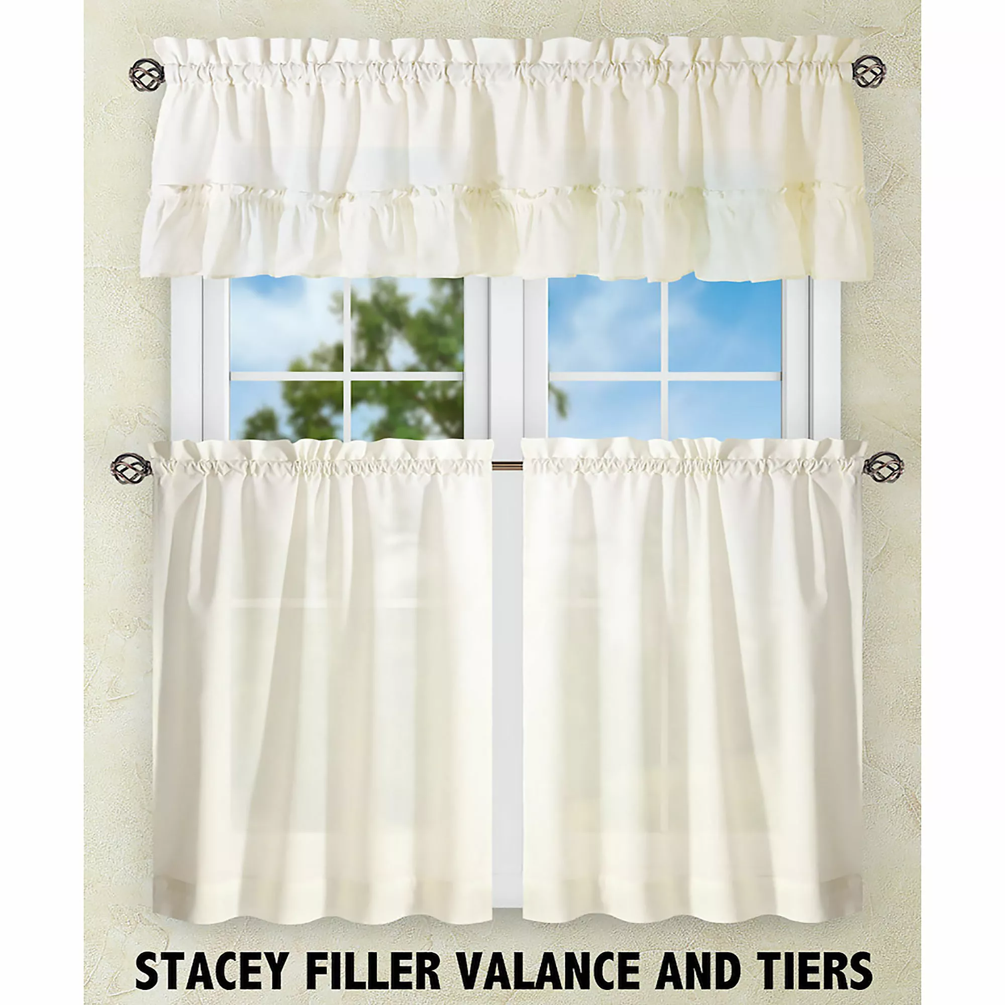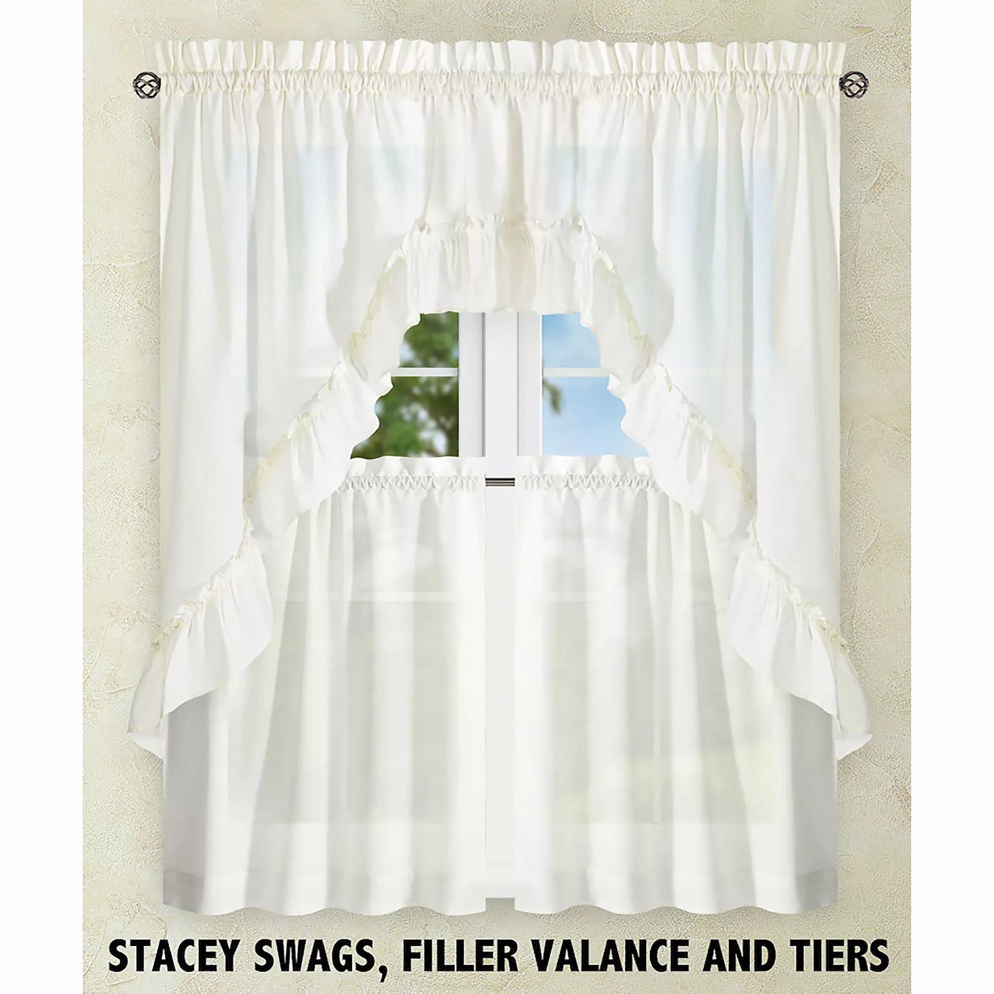 Bring beauty and a brand new look into your home decor with the Stacey curtain program. The popular solid colors coordinate easily with a variety of other solids, checks, plaids and stripes without over powering them. The Stacey tailored Tier curtains are engineered form a lighter fabric that is designed to allow some light in while providing privacy. Tailored Tier curtains are used to cover the lower portion of your windows or used alone on shorter length window. Made with 70-percent polyester/30-percent cotton fabric creates a smooth draping effect, soft texture and easy maintenance. Each curtain panel is constructed with a 1.5-Inch rod pocket, 1.5-Inch header and 3-Inch bottom hem. Sold in pairs (2 panels) width is measured overall 56-Inch per pair of panels (both 28-Inch panels together) length is measured overall from header top (ruffle above the rod pocket) to bottom of panel. For wider windows simply add multiple panels together. Stacey tailored Tier curtains can be combined with coordinating valances and swags.