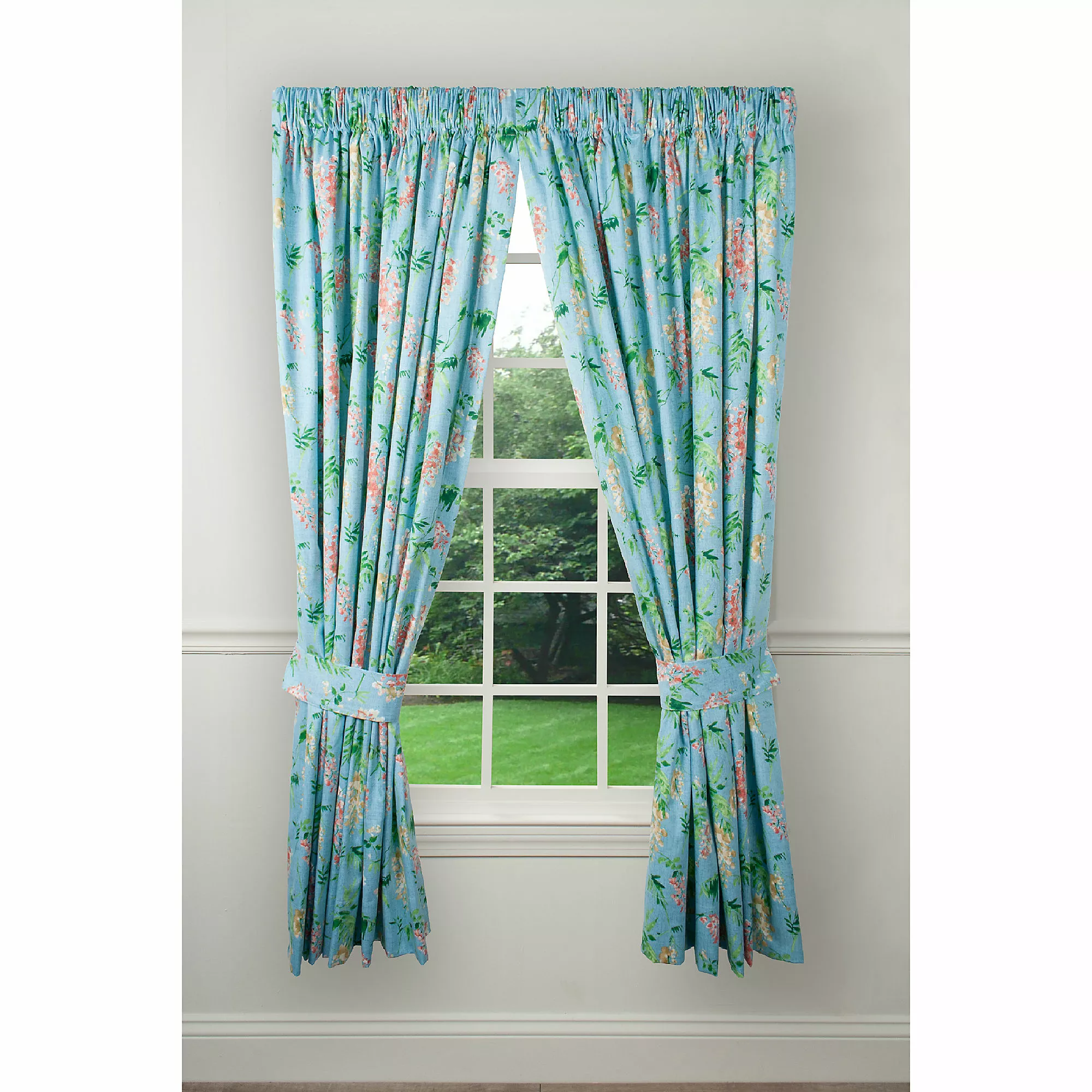Bring the gorgeous sights of spring indoors. Dress your window in blooms of bright color and give a fresh seasonal feeling to your home. Made from 100% cotton that creates a smooth draping effect. Each panel is constructed with a 3-Inch rod pocket and has a sewn in natural colored liner for additional light blocking. Width is measured overall 50-inches.Â