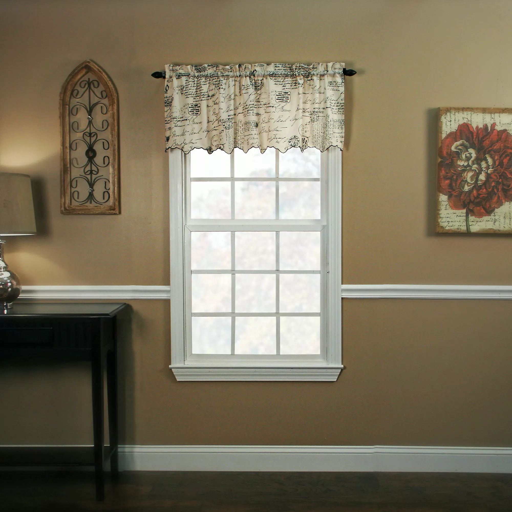 Simplicity is the ultimate sophistication. Classic script writing and Postal stamps will bring old world charm with a mix of high fashion to your decor. This classic pattern and coloration marries perfectly on the light weight textured semi sheer fabric. Each valance is constructed with a 1.5-Inch rod pocket, decorative 1.5-Inch header and a beautiful embroidered bottom hem. Width is measured overall 48-Inch, length is measured overall 15-inch from the seam above the rod pocket to bottom of valance. For wider windows or a fuller look simply add multiple valances together for a customized look and fit.
