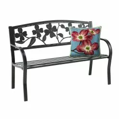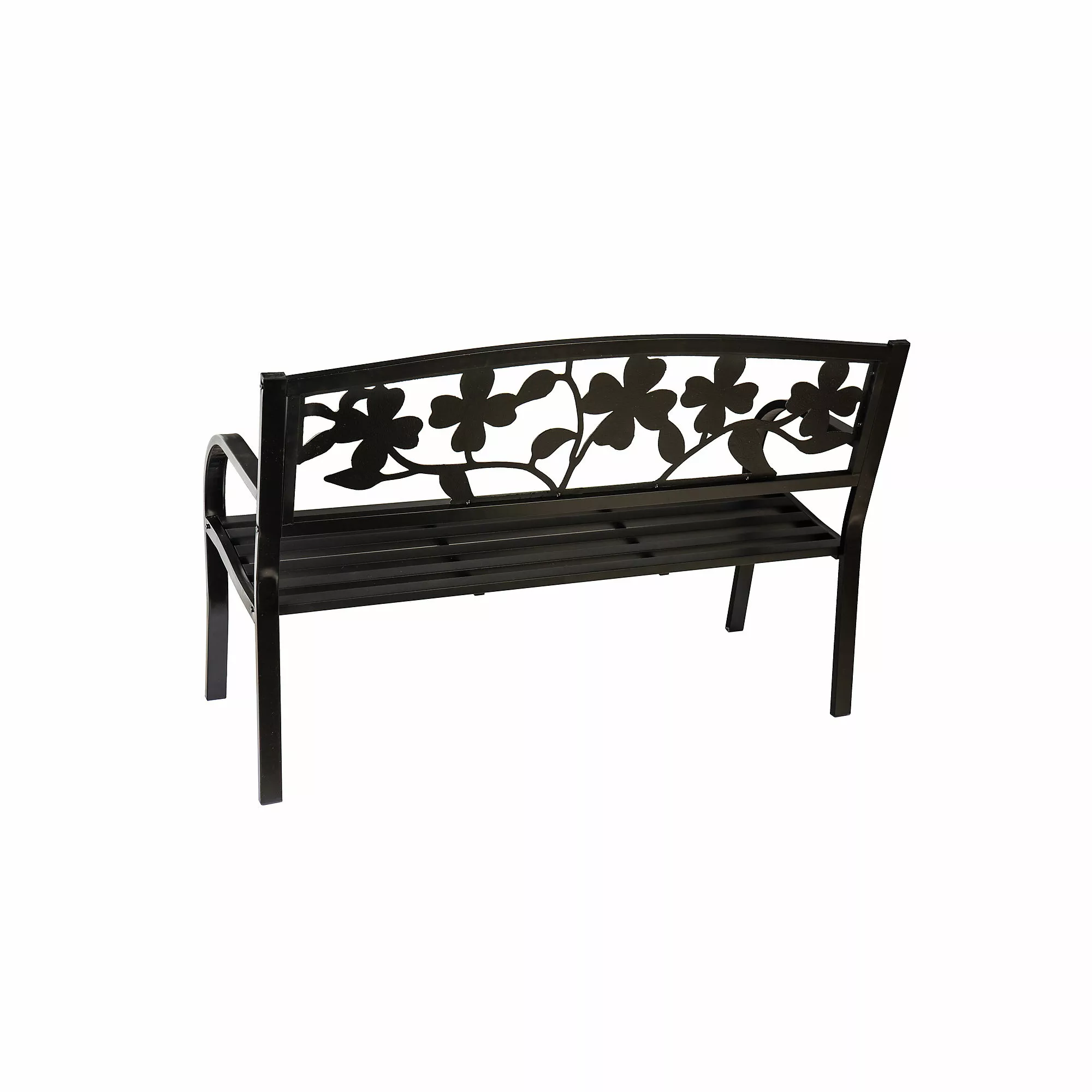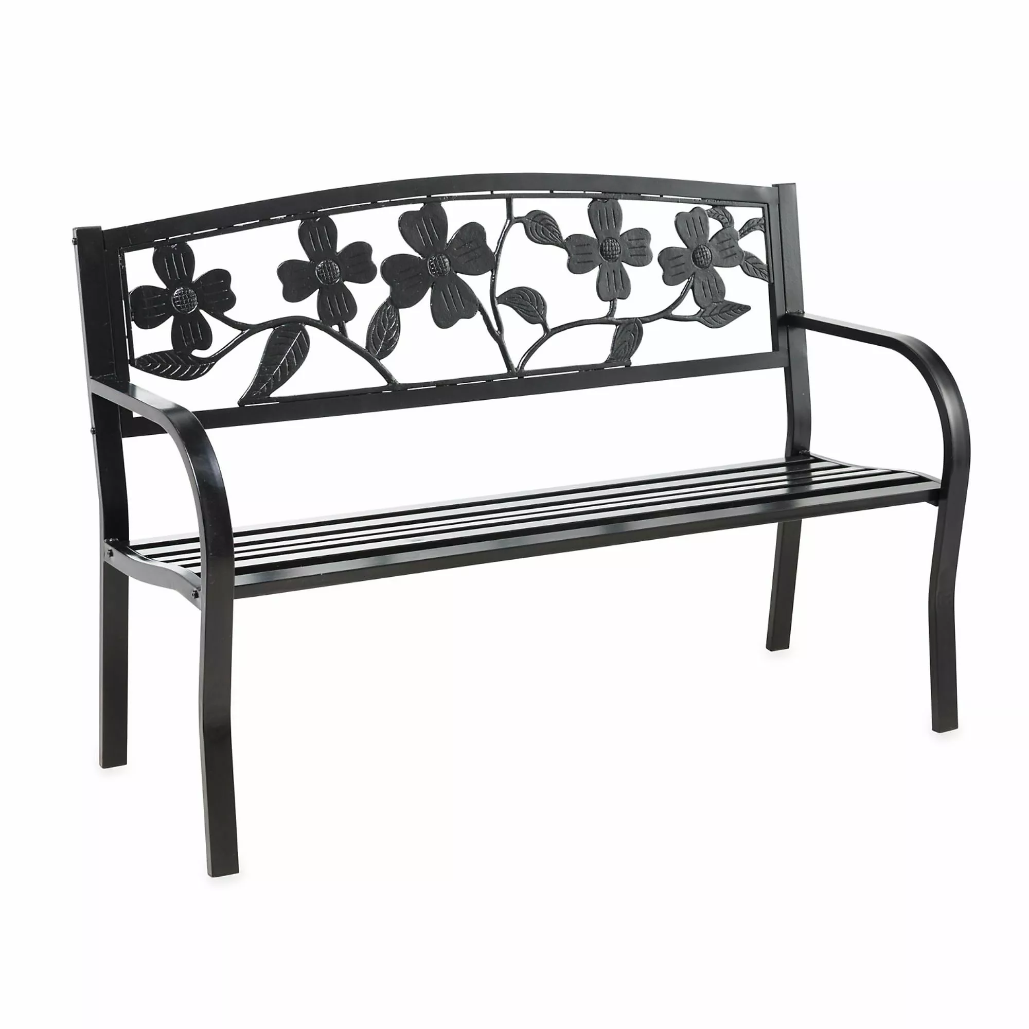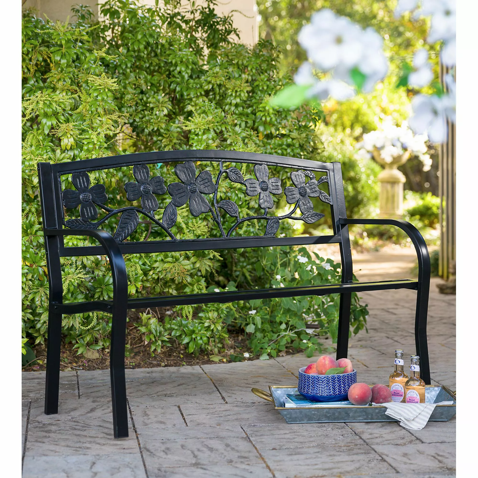 This all-weather steel-frame garden bench features a cast-iron back design with branches of dogwood flowers. The classic black finish with brushed highlights lends a timeless look. Slatted seat, curved arms and an arched back.