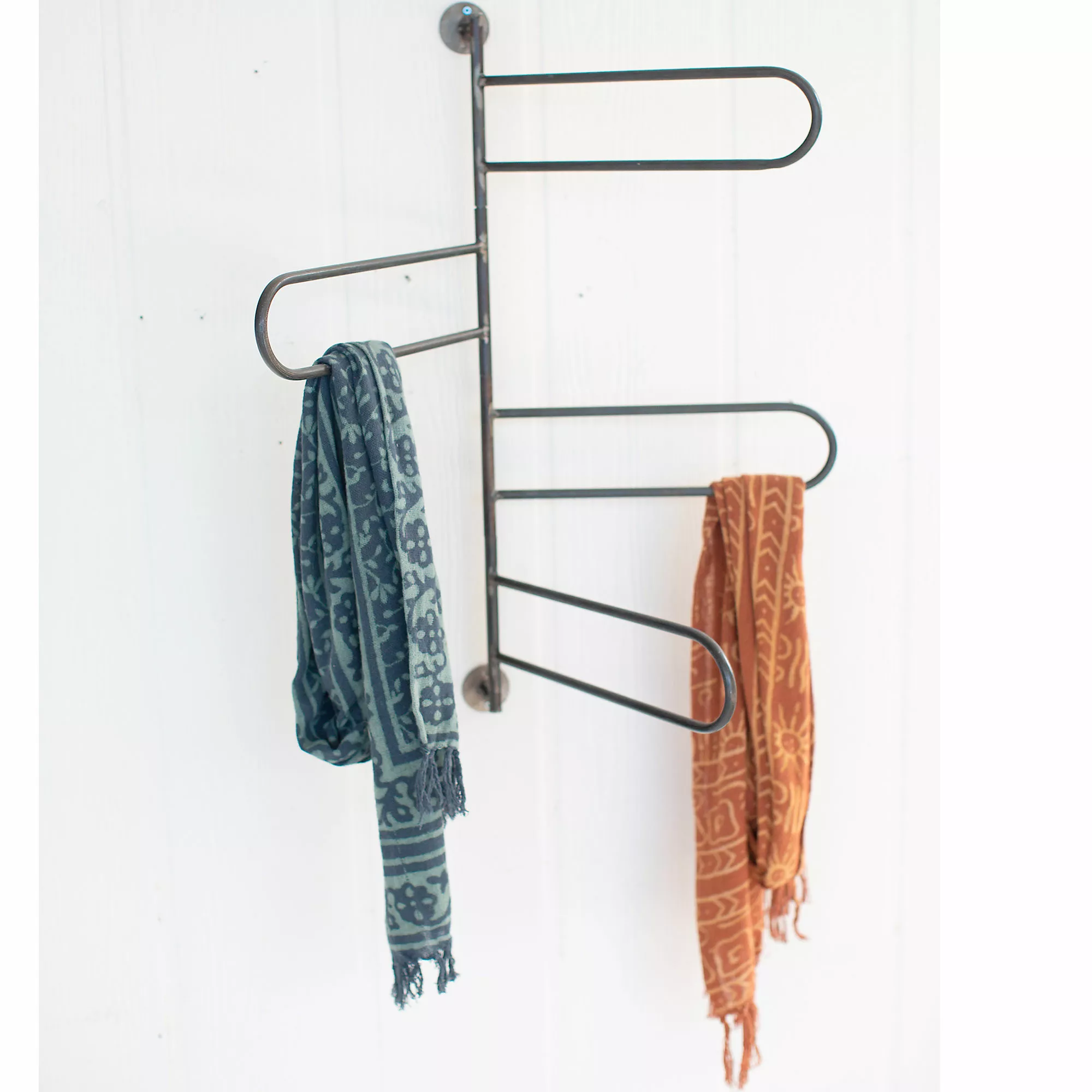 Form meets function with this chic piece. This sleek towel rack is a great bathroom filler but can also be used to hang scarves or other garments.
