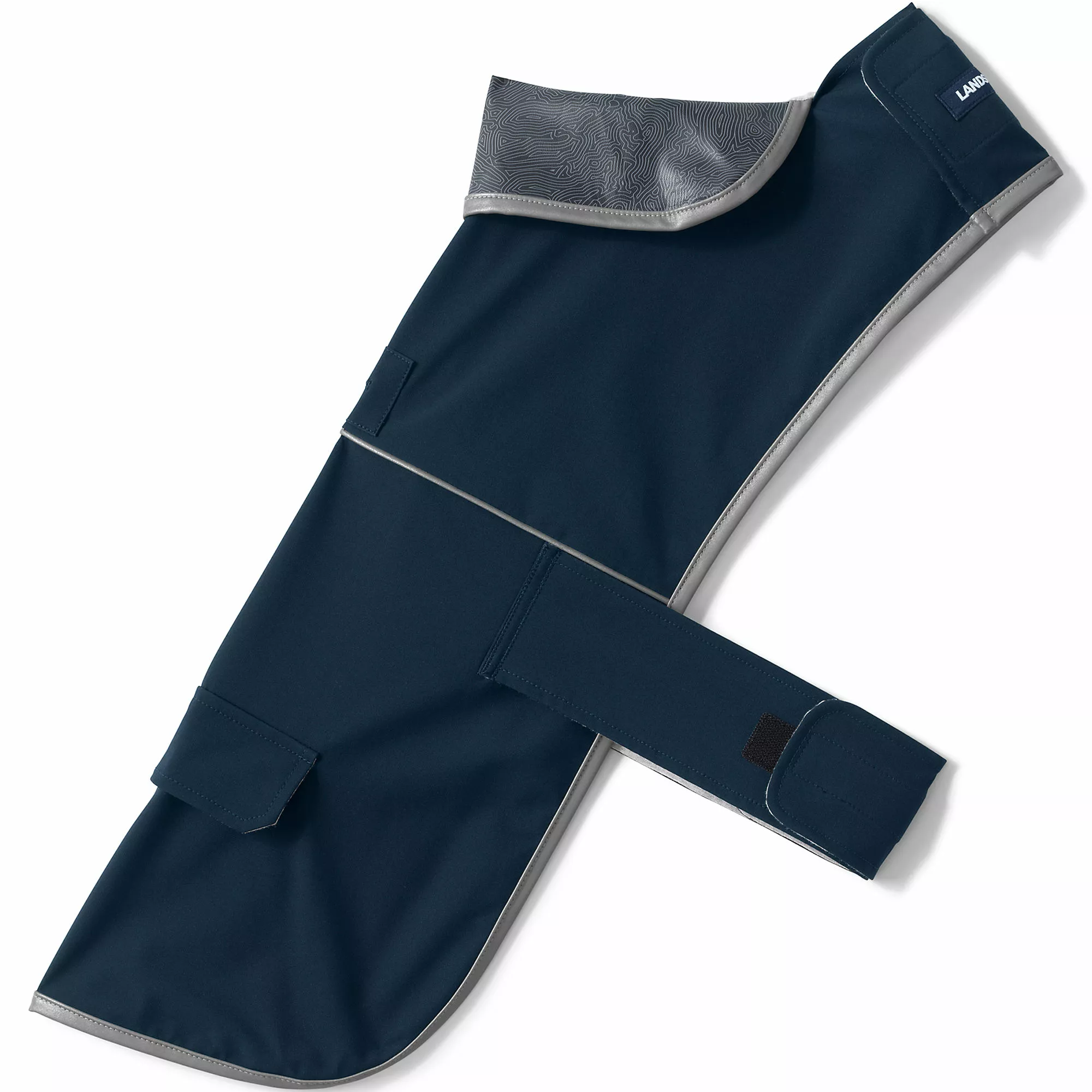 Wouldn’t rainy day walks be a little more bearable if you just had to dry off Buddy’s feet – and if he didn’t make a wet mess by shaking off all that water? Get him a Dog Rain Jacket! It’s an ideal barrier against stormy weather, made with a water-resistant nylon outer shell for protection against wind and rain. The soft cotton jersey knit lining is comfortable without being too warm. Reflective nylon trim and cording detail help drivers see your best friend on nighttime walks. Fun details like a handy back pocket and woven interior name label – which you can fill in with your dog’s name – complete the package. Adjustable hook and loop closures for easy on and off.