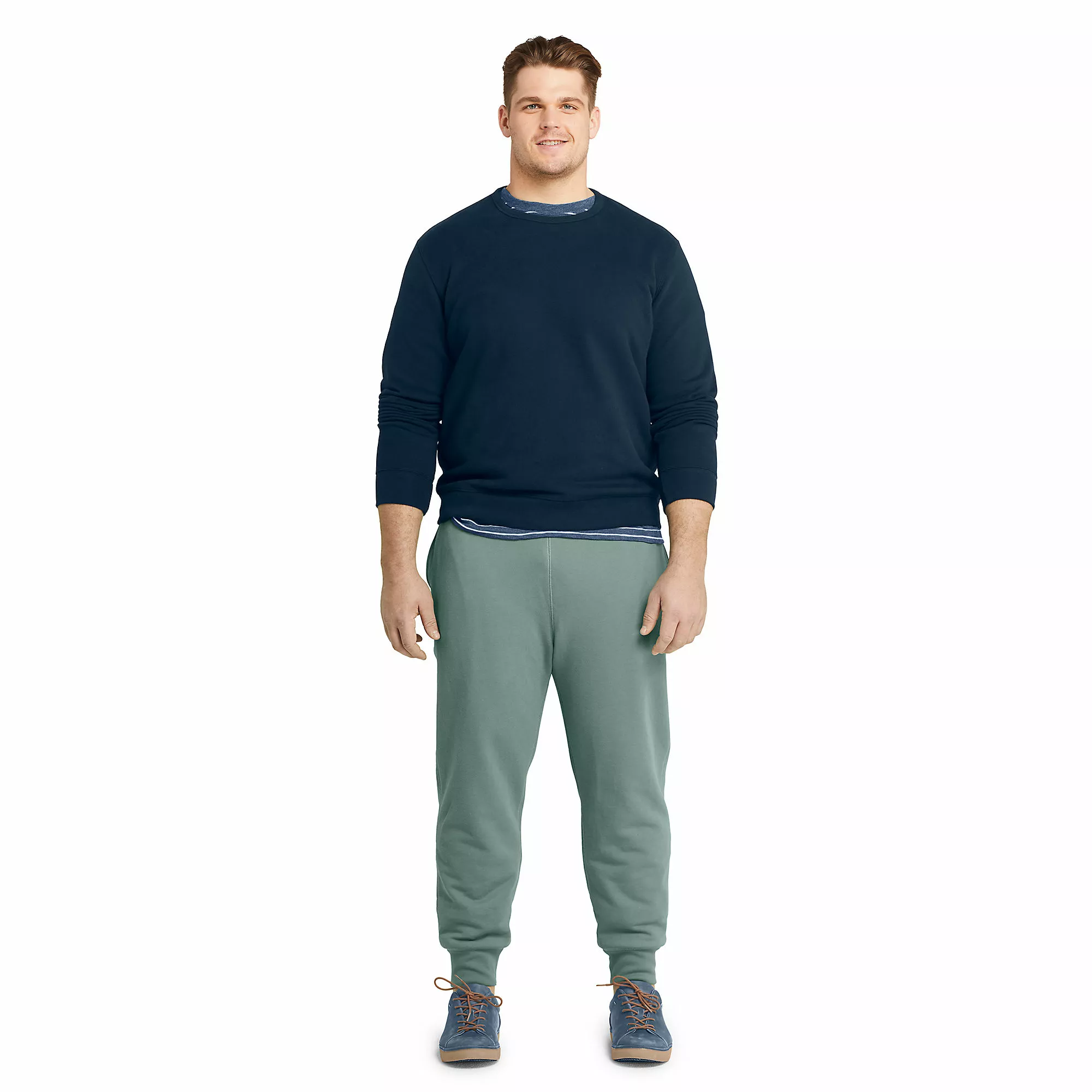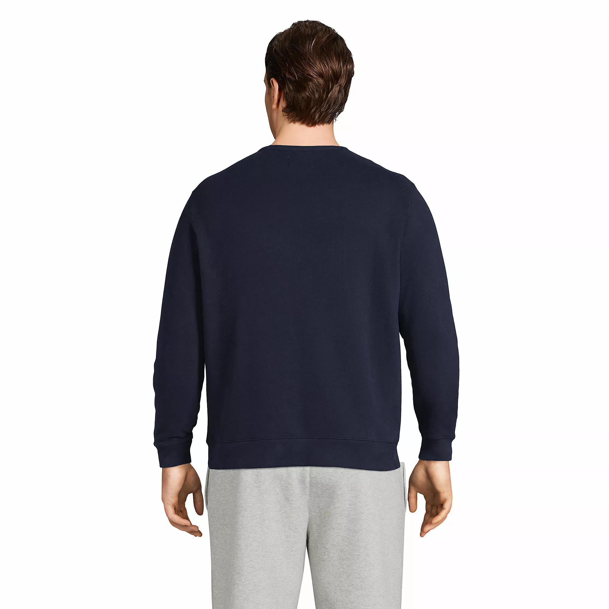 If you could see our crewneck stacked side by side with those cheaply made ones you’d see how much thicker and more substantial it is. We call it the “plush factor.” It’s what makes this crew’s fleeced interior more inviting after a workout or snuggling into after a long day at work. As for shrinkage, mild garment washing takes care of that, so just order your regular size. The fabric is our very soft 72% cotton/28% polyester blend.