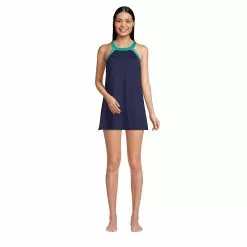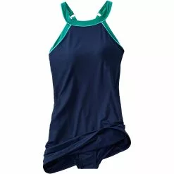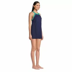 Here’s the swim dress that combines everything we know and love about tunics and great-fitting swimsuits. A high neckline provides sun coverage and puts the spotlight on your shoulders. The flattering tunic length, colorful piping and adjustable straps are perfect finishing touches. Underneath, of course, there’s a comfy, one-piece swimsuit. Plus, chlorine-resistant fabric keeps this swim dress in tip-top shape, season after season.