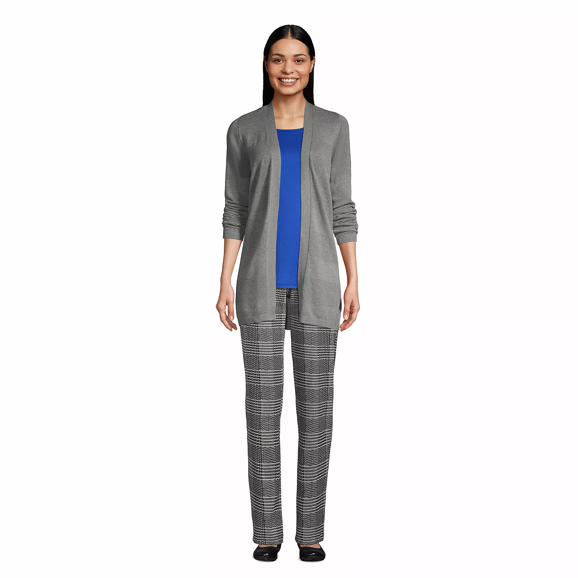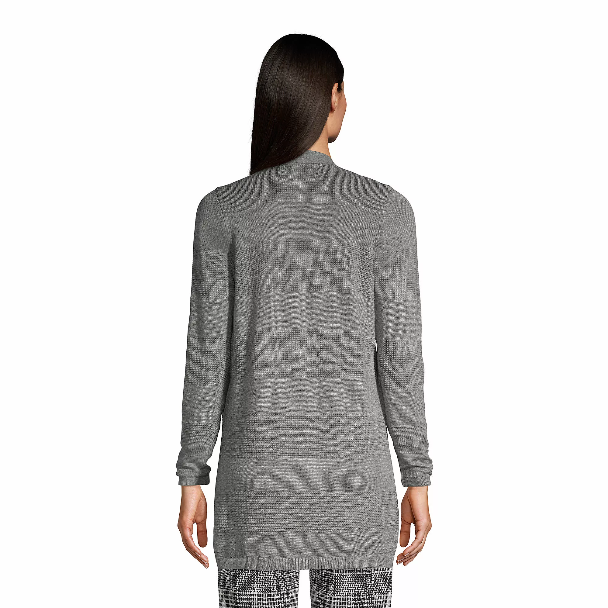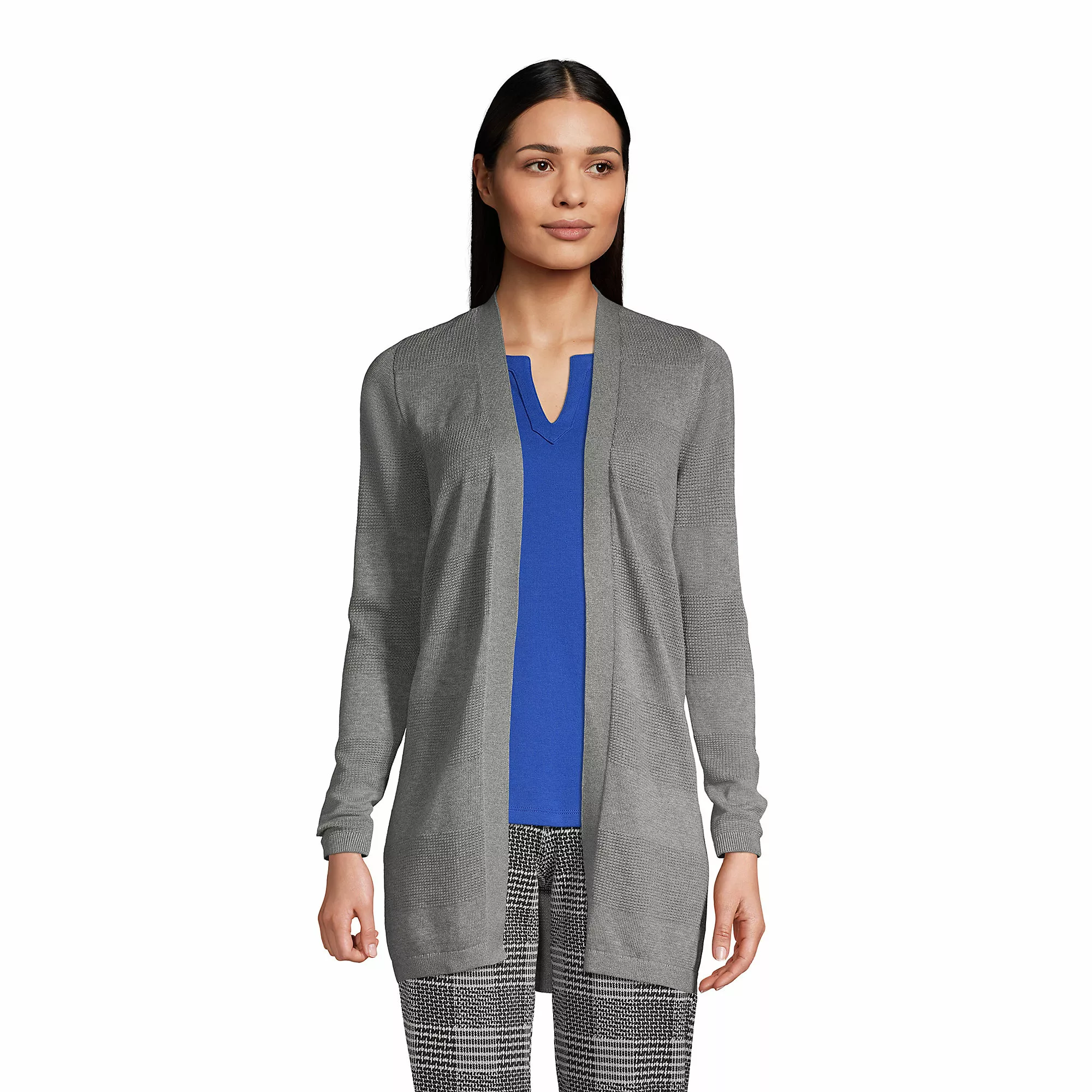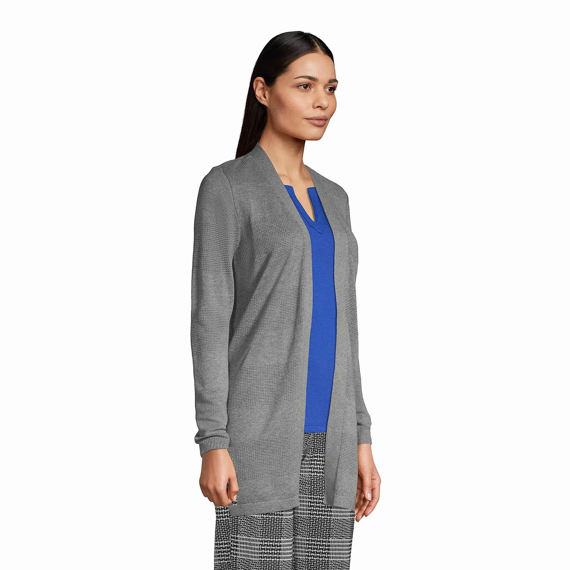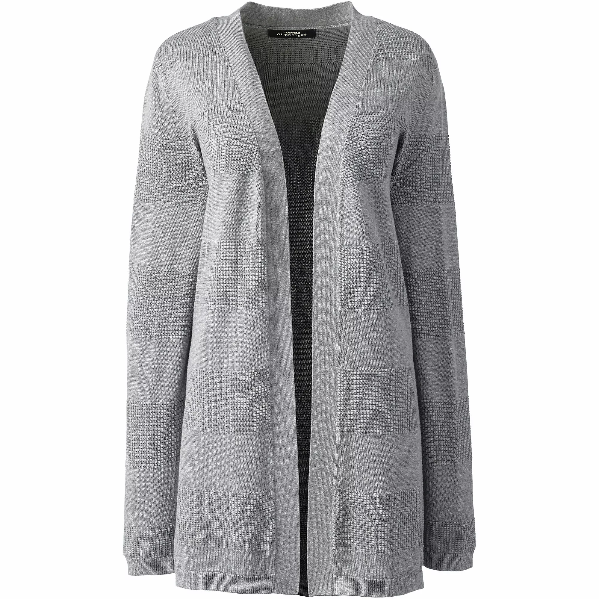Our textured drape cardigan works perfectly in the office and easily stands in for a more formal jacket. The fabric blend is made to keep its shape and color after numerous wash and wear cycles.