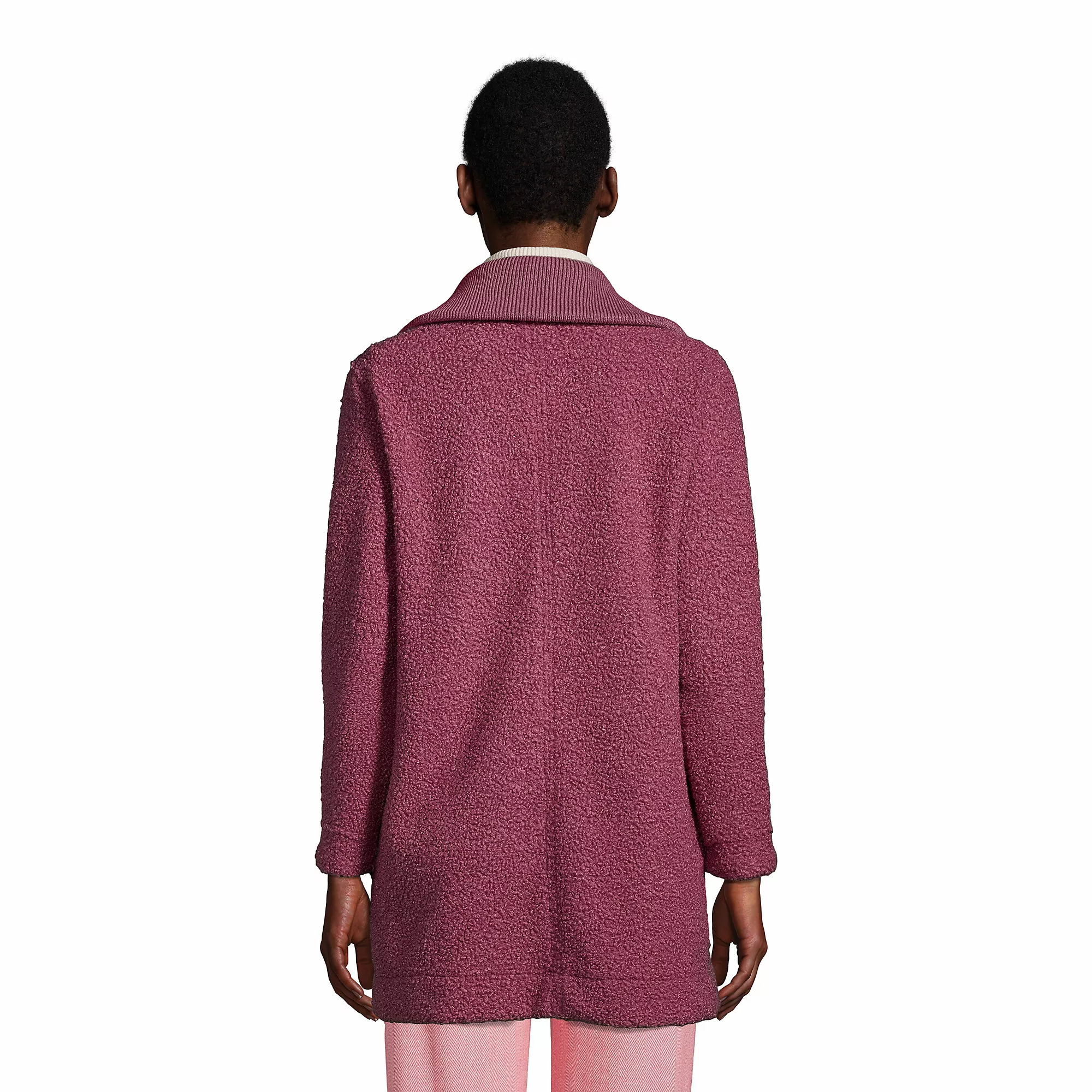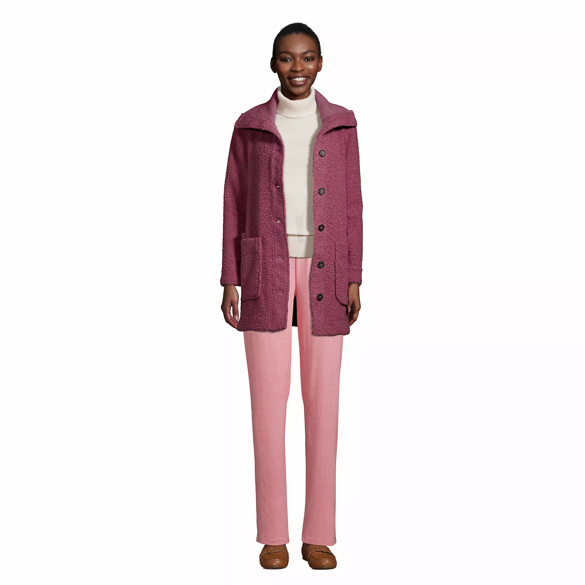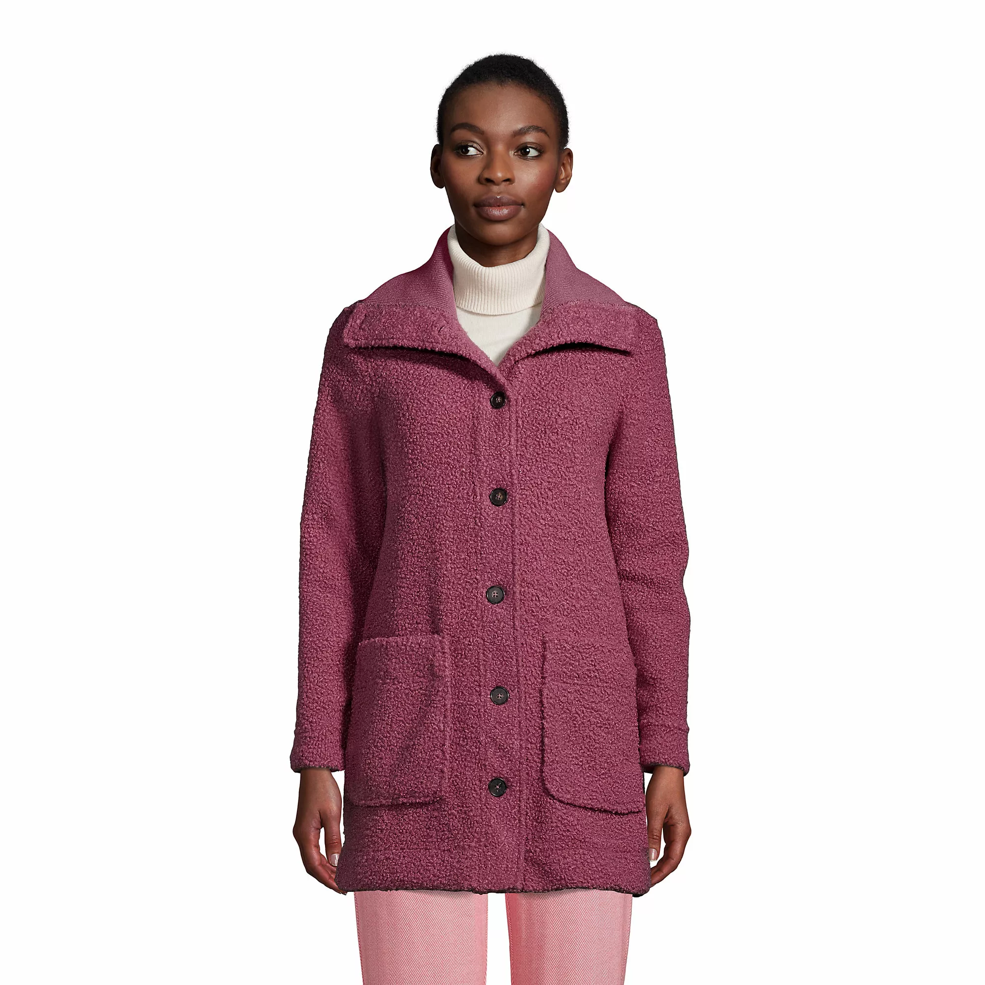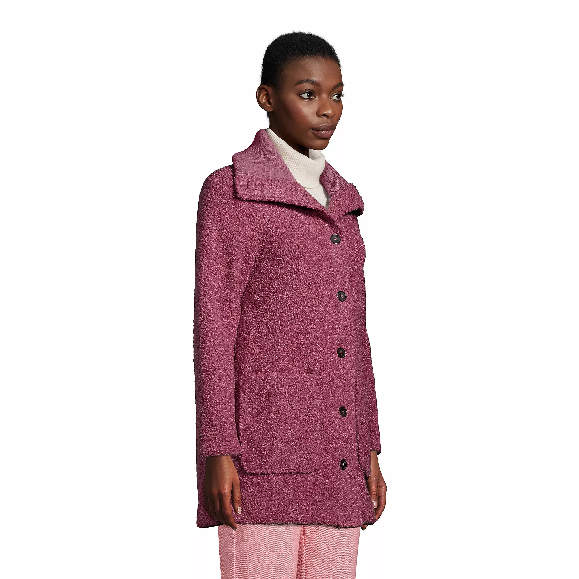 Snuggle inside our wooly boucle winter coat for soft and stylish warmth. Its looped fabric looks and feels like wool, and the collar buttons luxuriously right up to your chin. The long-lasting boucle fleece is soft and warm and resists pilling. Wear this coat out and about with jeans and boots, or at home with leggings, perfect whenever you want a comforting hug.