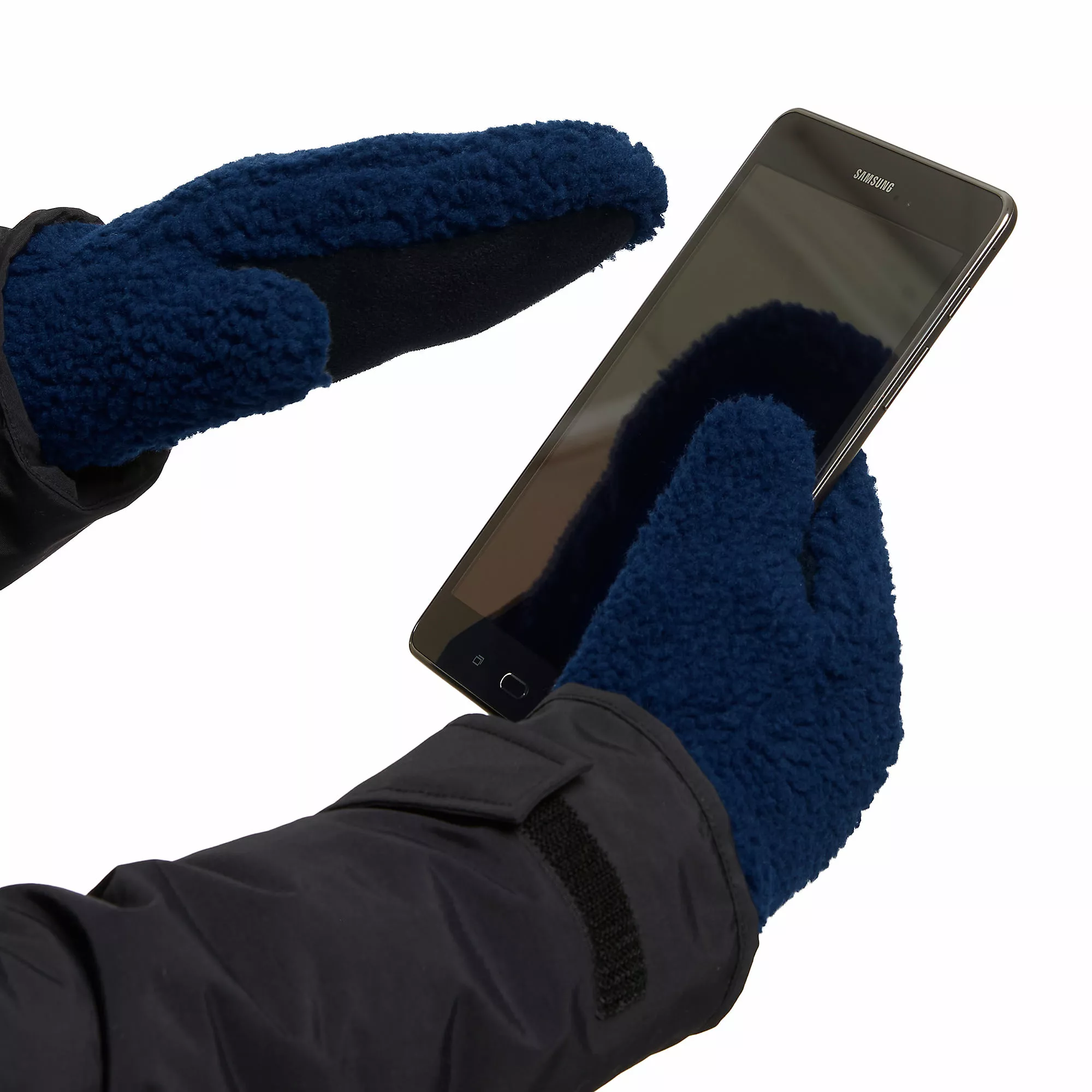 Wrap your hands in a hug with this pair of classic, sherpa mittens. The soft, cozy fleece protects against unwanted chills and cold; and features a contrasting rib-knit cuff for a stylish look. The added EZ touch thumb tip has been designed to work with touchscreens making it easier to use your phone to take those treasured family photos over the holidays.