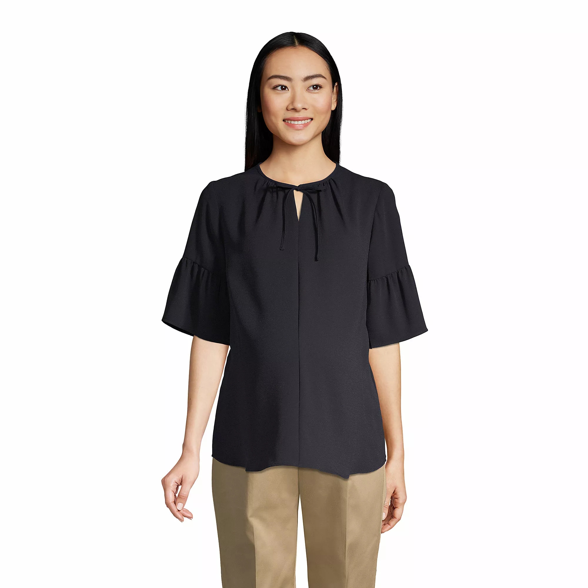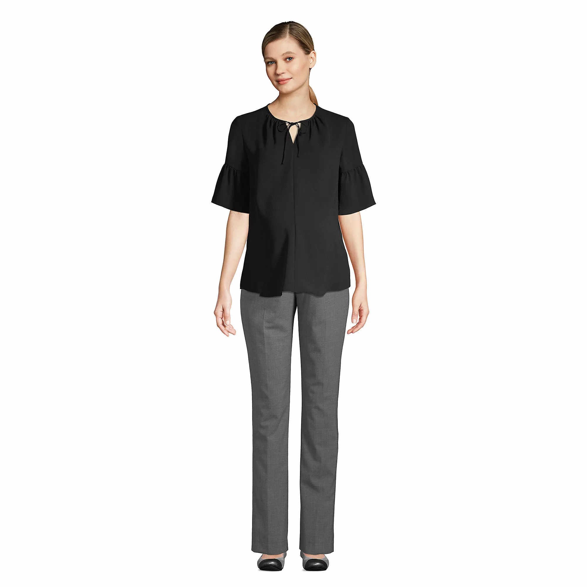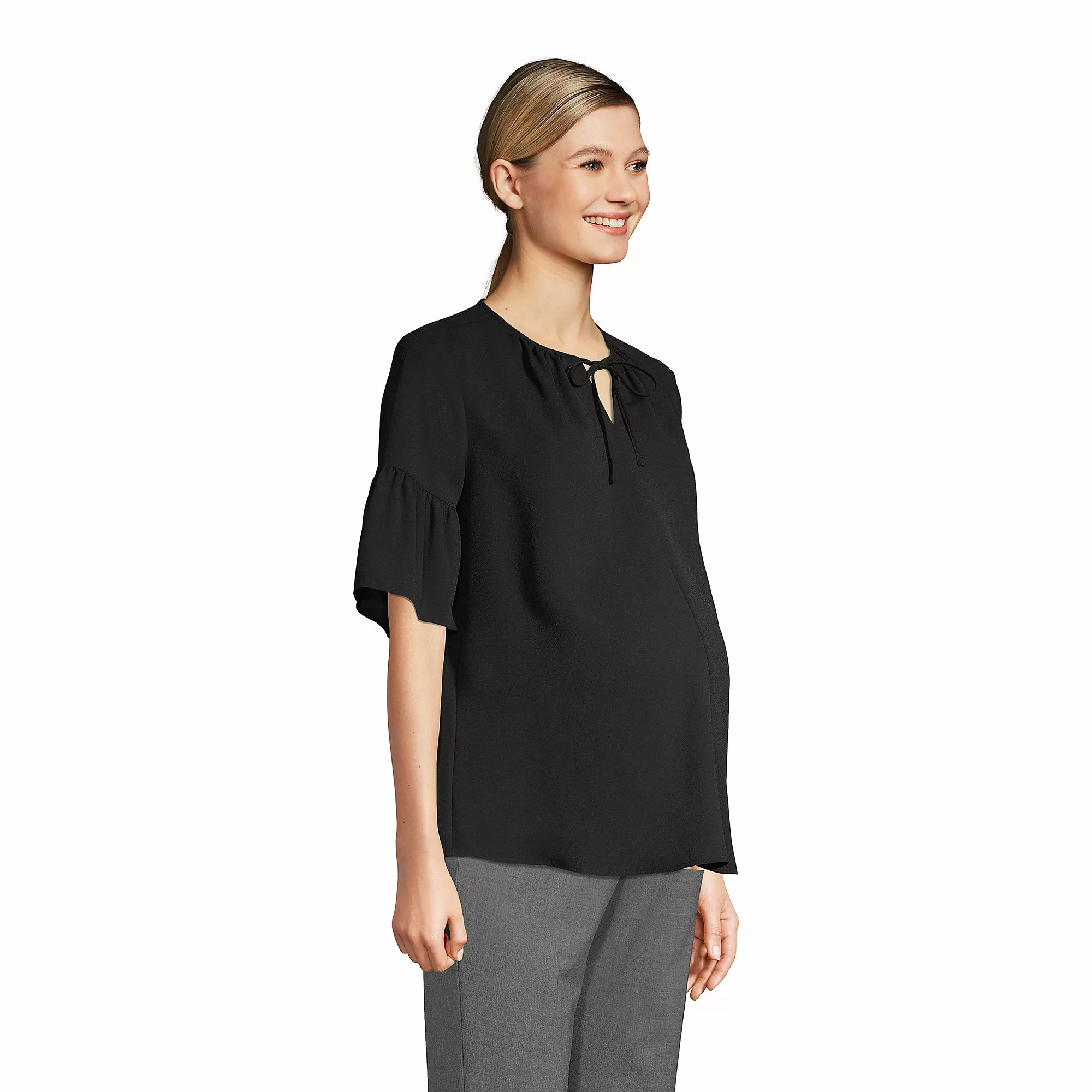 This maternity top is both graceful and professional, offering a generous but style-conscious silhouette. Made from a lightly textured crepe that feels very soft and drapes gracefully.