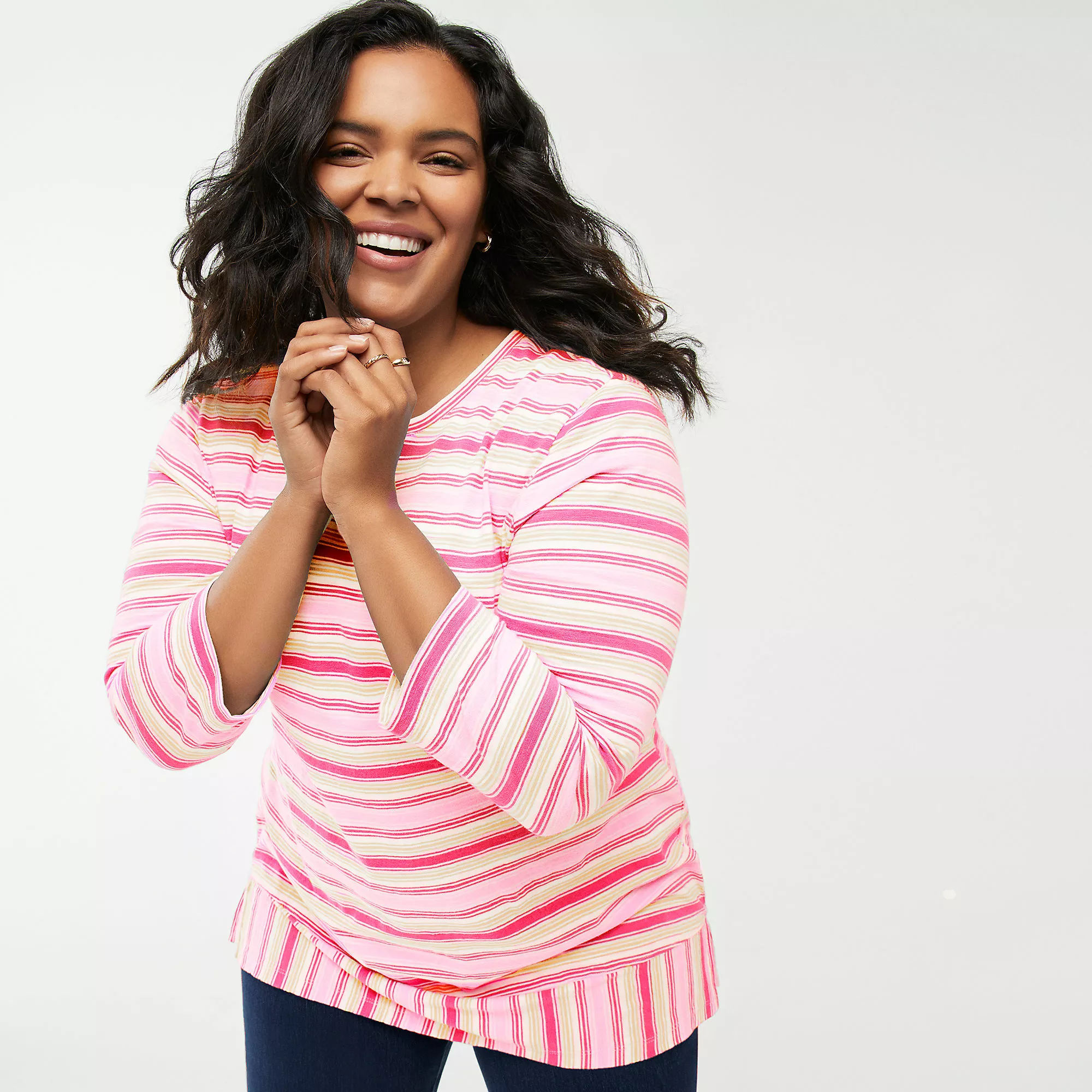 We must tell you about this tunic. It’s comfortable, flattering and oh-so versatile. The fabulous slub fabric and flattering silhouette come together to give you a perfectly comfortable fit that not only feels great but looks great too. Transitional three-quarter length sleeves give you the option to layer with a jacket or wear it on its own. And the flowy swing body makes this tunic perfectly versatile to wear with any bottoms, from jeans to dress pants and even leggings. We don’t want to get ahead of ourselves, but it just might be your new favorite tunic.