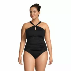 While the stylish high neck style gives you sun coverage, the adjustable shoulder straps offer you the option to wear it as a one-shoulder one day and as a halter the next, so you never get bored! The flattering shirring along the midsection and all-around bra with sewn in cups allow you to feel supported and confident in and out of the water.