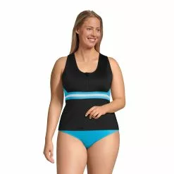 Trending: Zip-front swimwear with a modern, sporty vibe. Take a closer look at this tankini top. Start with the attractive scoop neck and that zip front, it’s more than just a fashion statement – it allows for easy-on, easy-off styling. The finishing touch: chlorine resistance that helps this suit stay in top shape season after season.