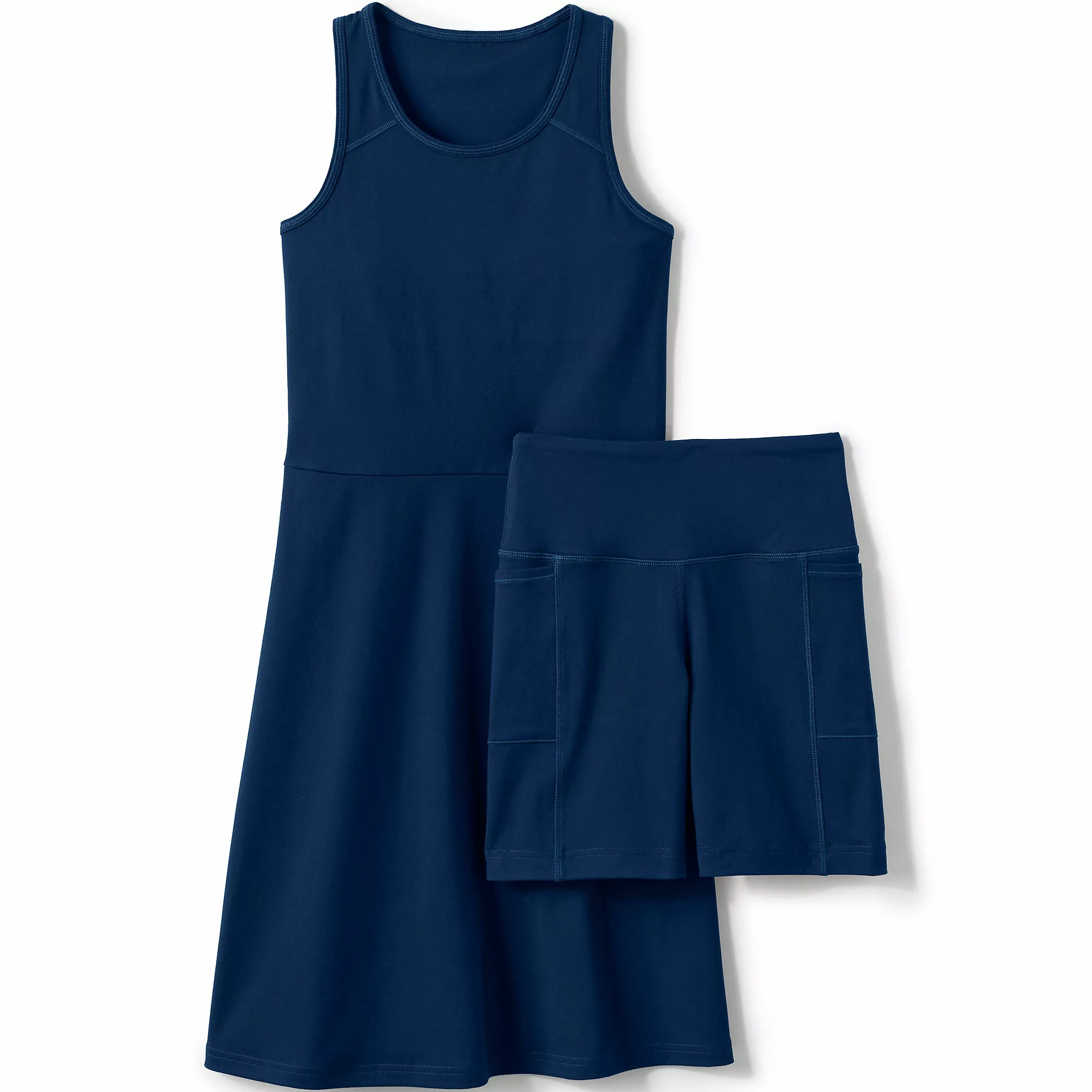 Love two piece sets? Well, here you go. A racerback dress plus bike shorts have you covered and ready for wherever the day takes you. The fabric is flexible and made with a moisture-wicking finish so nothing will slow you down. The racerback straps and built-in shelf bra will keep you supported and the contoured waistband helps prevent roll down.Â
