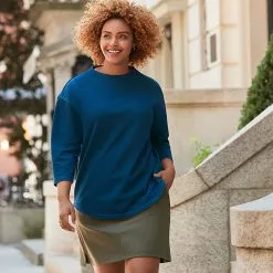 Our Serious Sweats are thicker and more substantial than the others and extra fleecy inside, so you know this funnel neck top is going to feel especially cozy and comfy. Fashionable (and easy) three-quarter sleeves and a circular hem in a flattering low-hip length give this sweatshirt a whole new level of style. At home or around the town, here’s your go-to in any season.