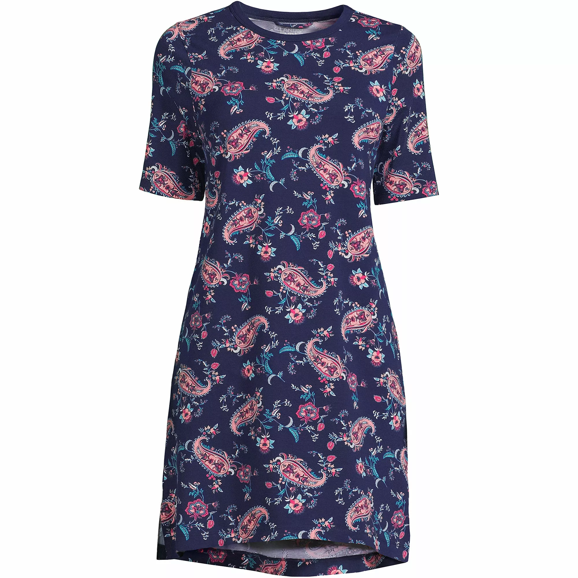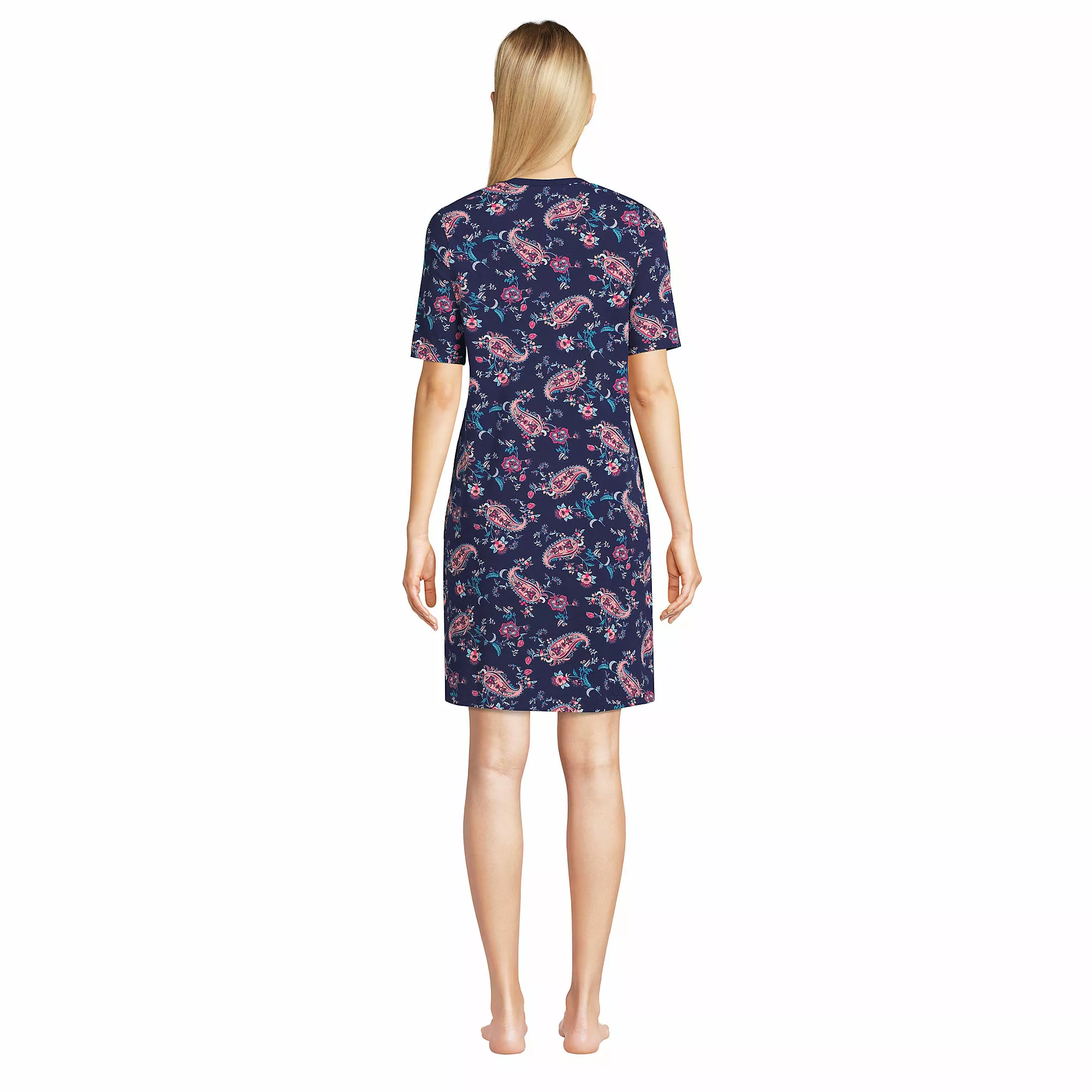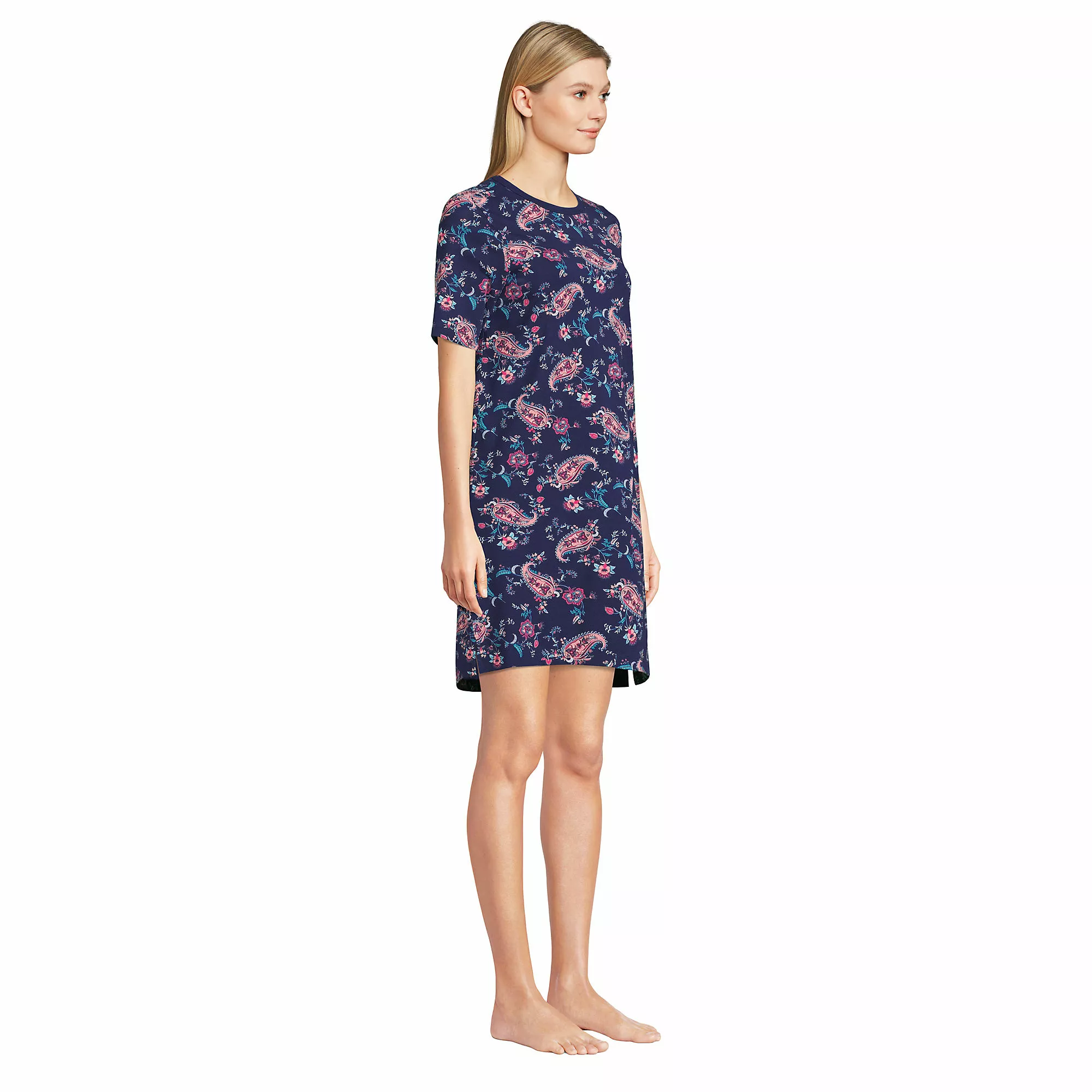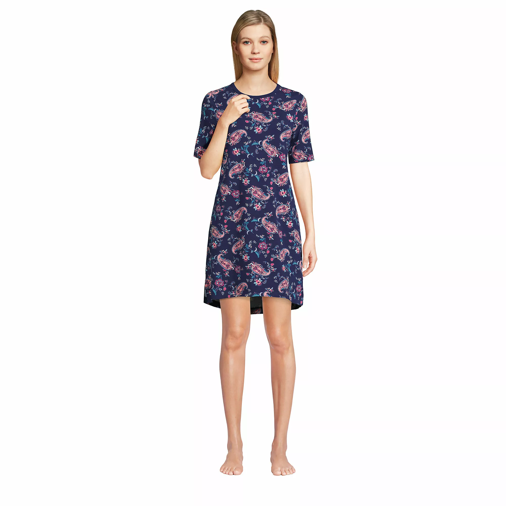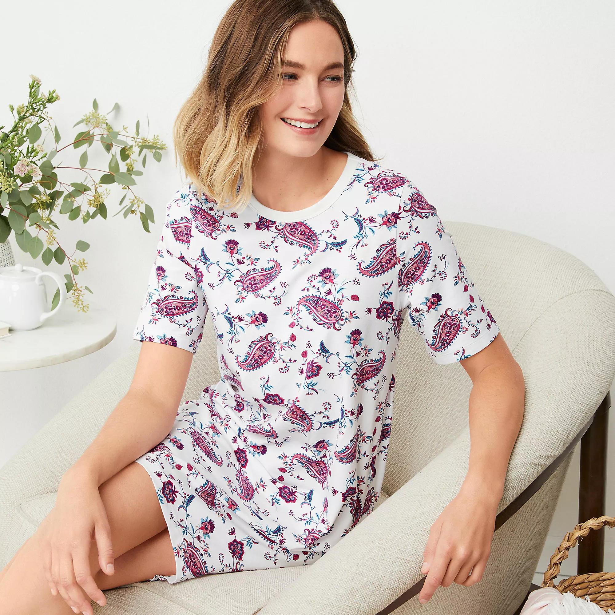 You’ll love to slip into this soft and effortless sleep gown at the end of a long, hard day. In an easy t-shirt style, it features short sleeves, a modest crew neck and a longer back hem to provide extra coverage.  Â