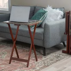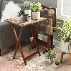 The Faux Marble Rectangular TV Table Set has a distinctive look with its sturdy wood construction and faux marble top. This set includes foldable TV trays and one storage stand. The handle on the top of the stand makes it easy to transport the entire set from one room to another. A true home furnishings staple.