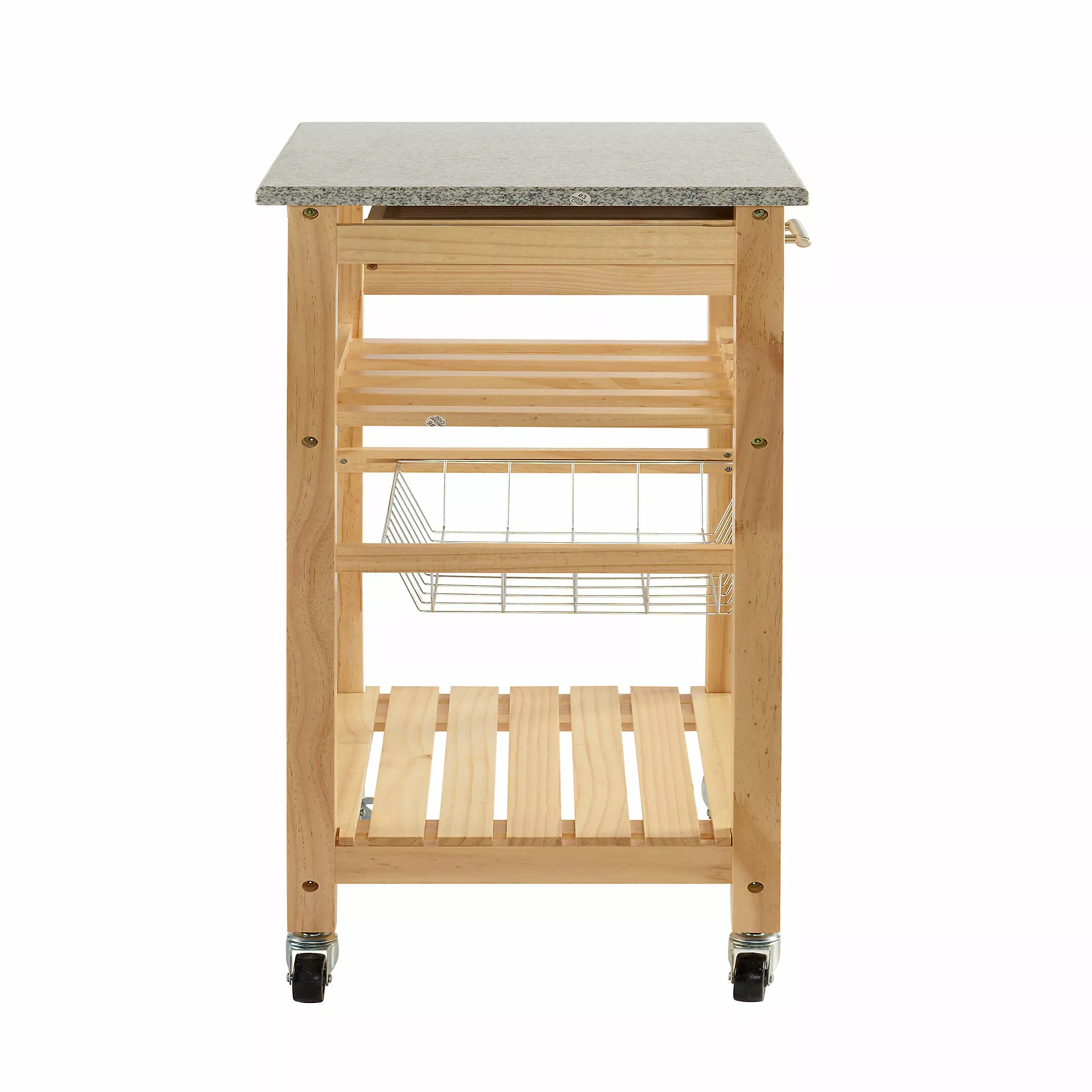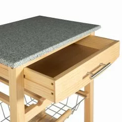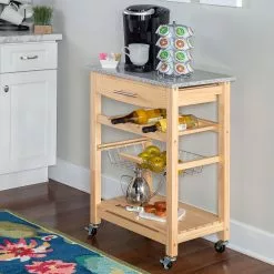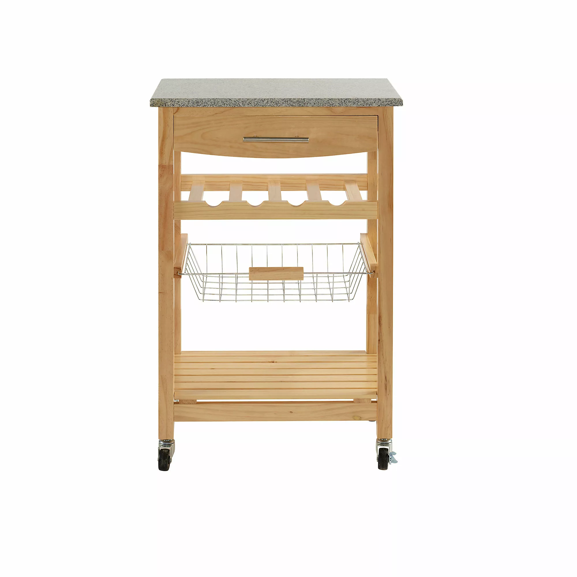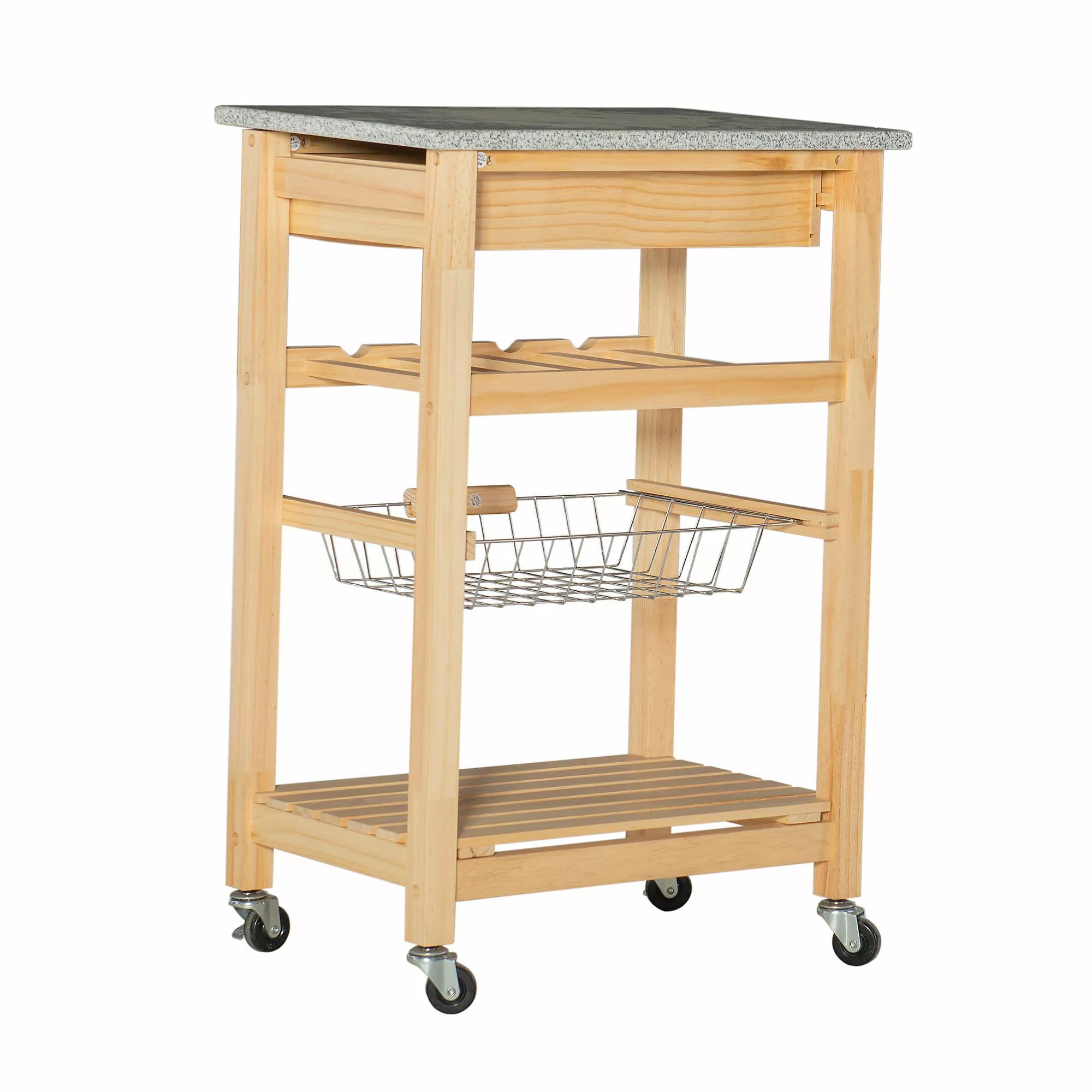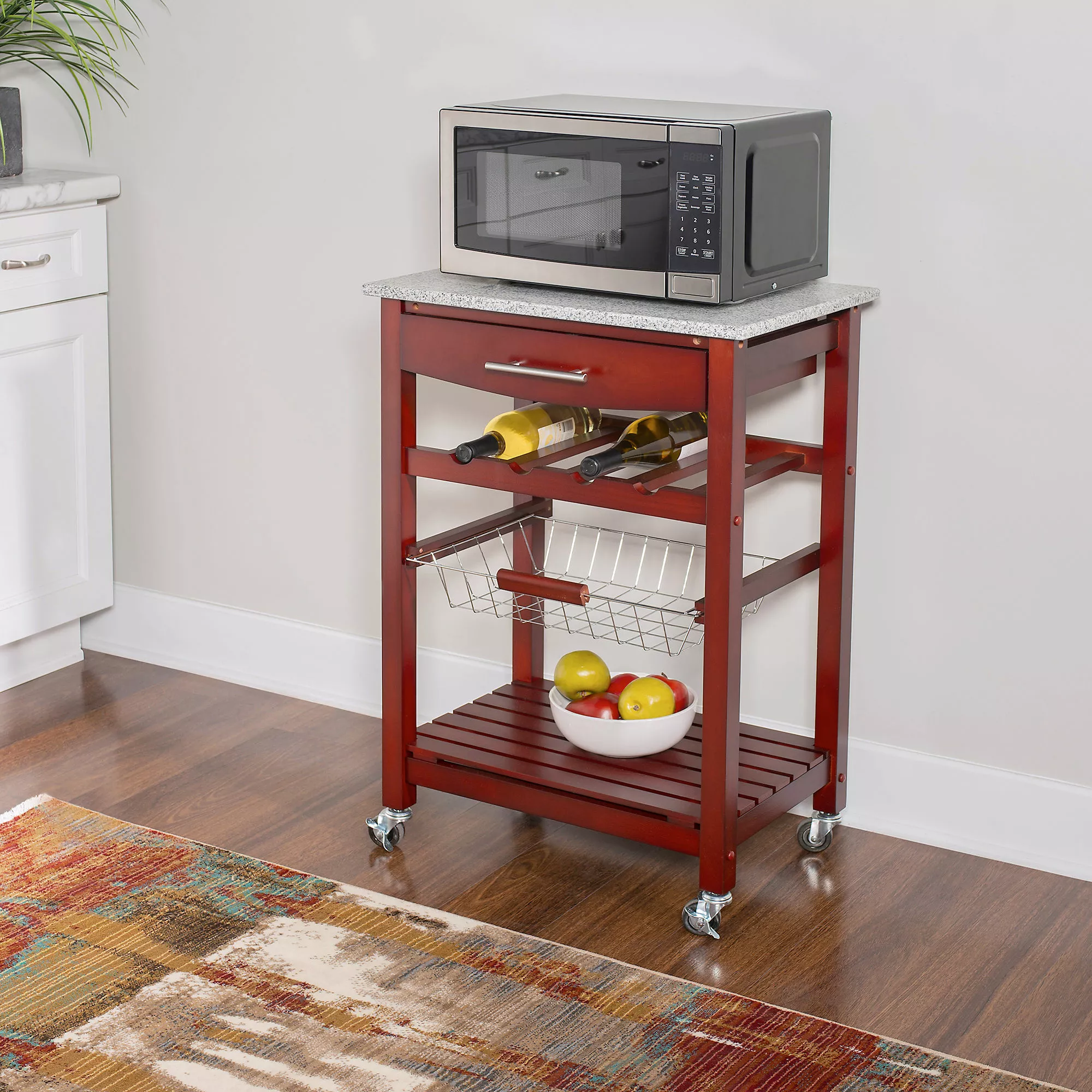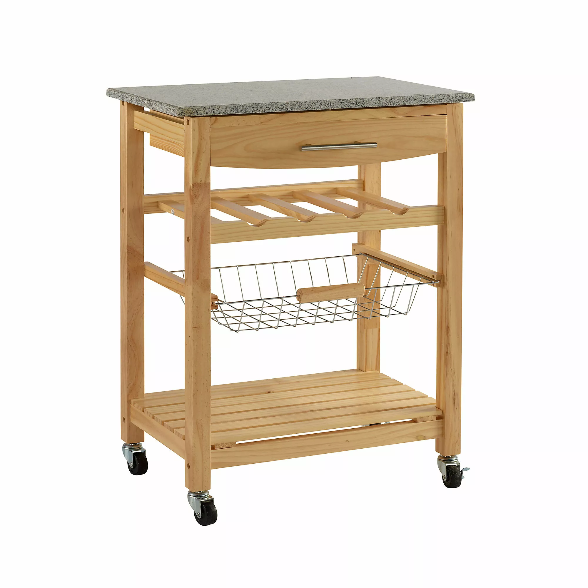 A contemporary take on storage and display, this efficient Kitchen Island expands your kitchen work space in a compact silhouette. Equipped with a fixed shelf, pull out drawer and slide-out basket overtop locking caster wheels, you can easily keep cooking and cleaning essentials within reach, making this kitchen cart perfect for prepping large meals. Store your favorite champagne options in the 4-bottle wine rack with ease, and after using the granite top as a cutting board, simply clean it off to make it the perfect display tabletop. Can accommodate compact microwave ovens.