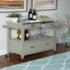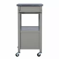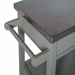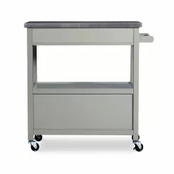Classic, convenient and easy to stow away, the spacious Kitchen Cart perfectly outfits your kitchen or food prep area. Cast in a soothing gloss white finish, one large and two small drawers open smoothly to revel ample storage for everything from utensils to pots and serving ware. The food-safe stainless steel top is easy to clean after meal prepping, so your guests can enjoy this chic kitchen island as they drink wine or indulge in hors d’oeuvres. A large middle open shelf area is great for displaying wine glasses, cook books or collectables. Large wheel casters make moving the island a breeze and they lock for stability. Can accommodate full size microwave ovens and coffee makers.