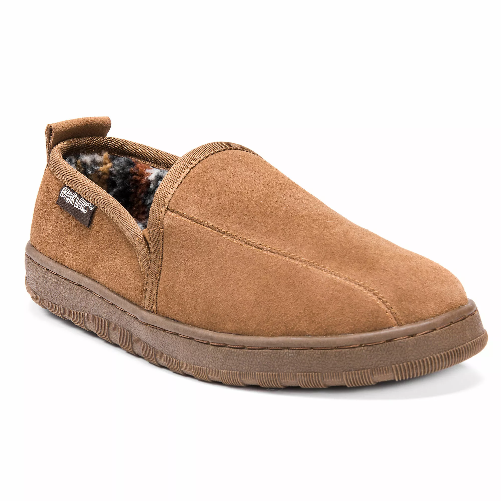 Slip into MUK LUKS® Men’s Eric Printed Berber Suede Slip on Slippers for long lasting comfort. A relaxed fit and soft faux fur insole will keep you warm while the durable sole lets you relax indoors or outdoors.Â