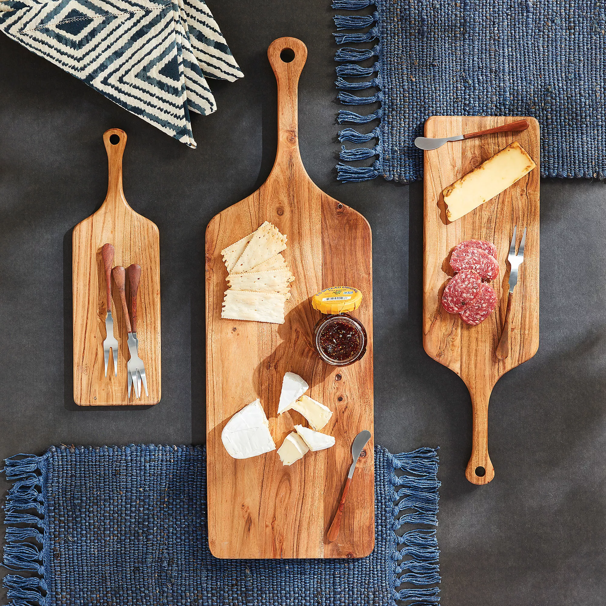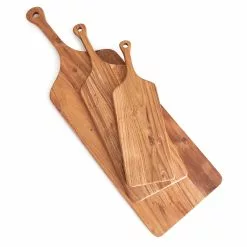 Charcuterie anyone? These serving boards are food safe and ready to dazzle your guests. Made of a solid acacia wood, they are as sturdy as they are beautiful. The only thing missing is your culinary creations!