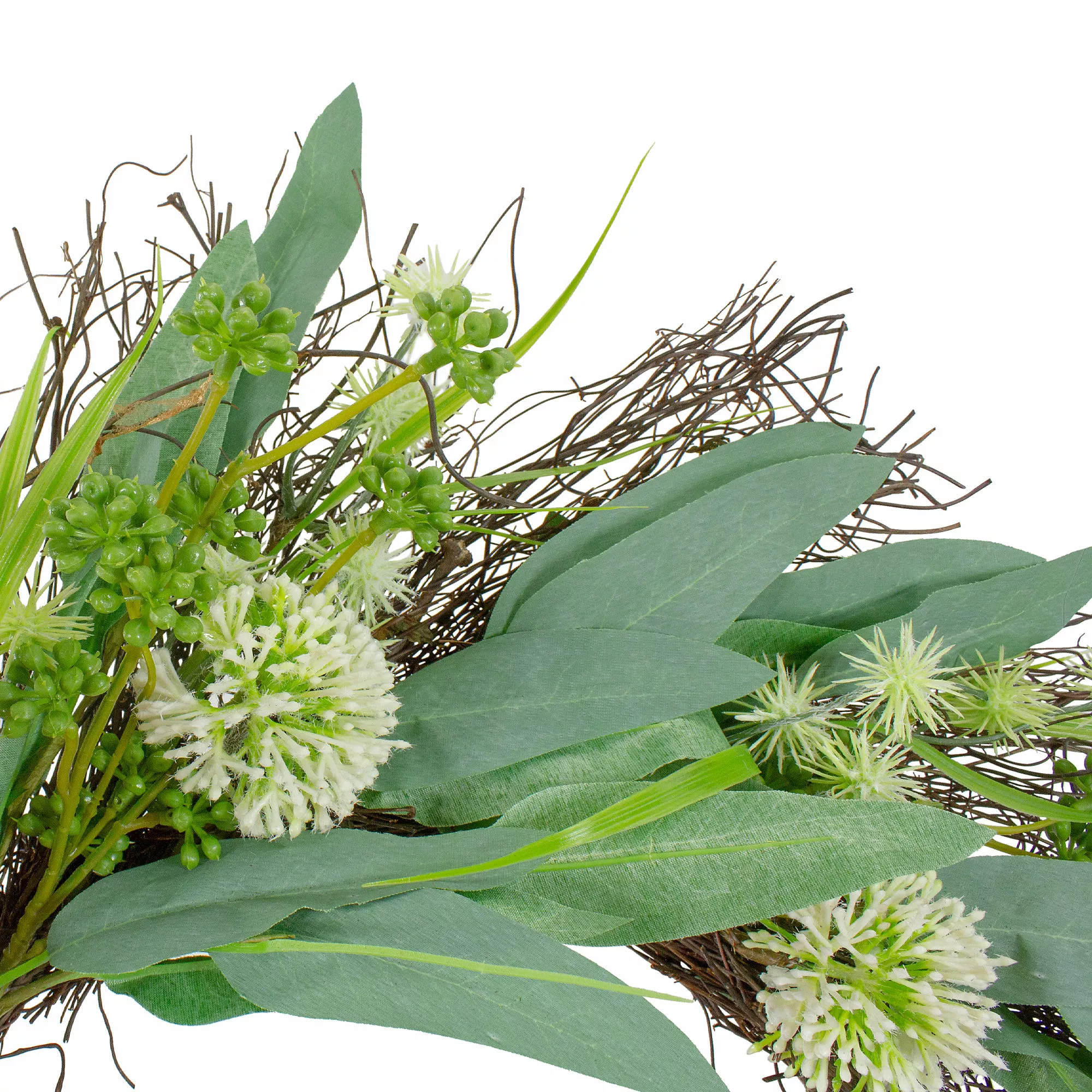 Add a touch of nature to your home with this olive leaves wreath. Featuring realistic green foliage intertwined with a natural grapevine base what better way to welcome guests and spring to your home.Â