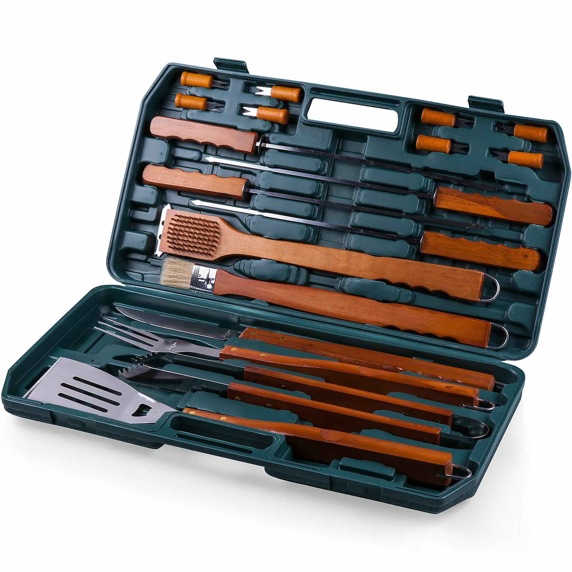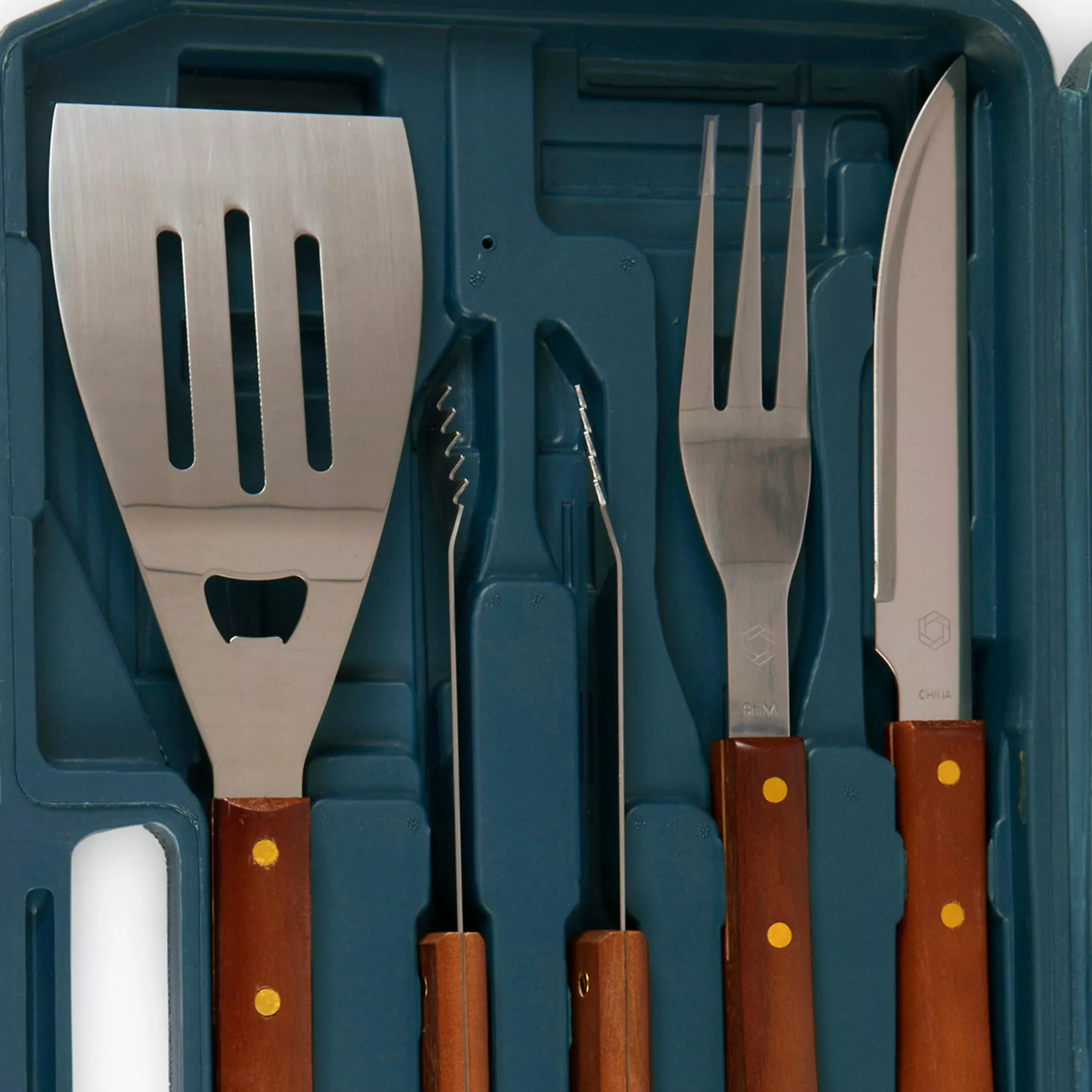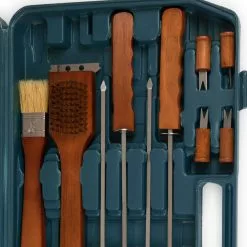 For the grill master in your life, the Picnic Time 18-Piece BBQ Set is the perfect all-in-one bbq tools set conveniently secured in a highly-portable and lightweight molded-plastic tote. All grilling utensils are stainless steel with lovely wooden handles, looped at the ends for easy hanging on the bbq. Grilling tools include: one spatula with built-in bottle opener, tongs, one fork, one knife, one basting brush, four shish kabob skewers with sliding medallions to remove food with ease, eight corn cob holders, and one grill brush with scraper. Fire it up!
