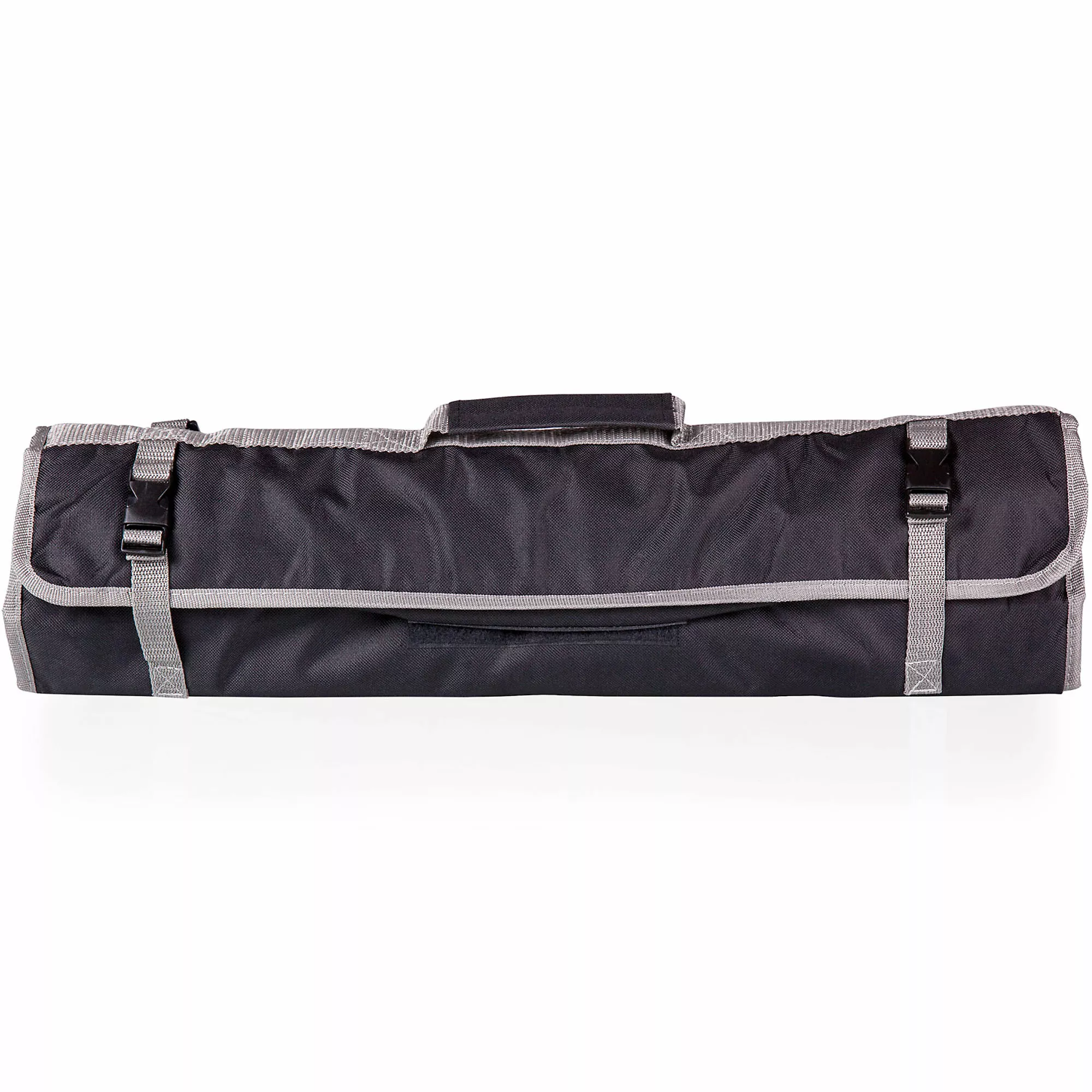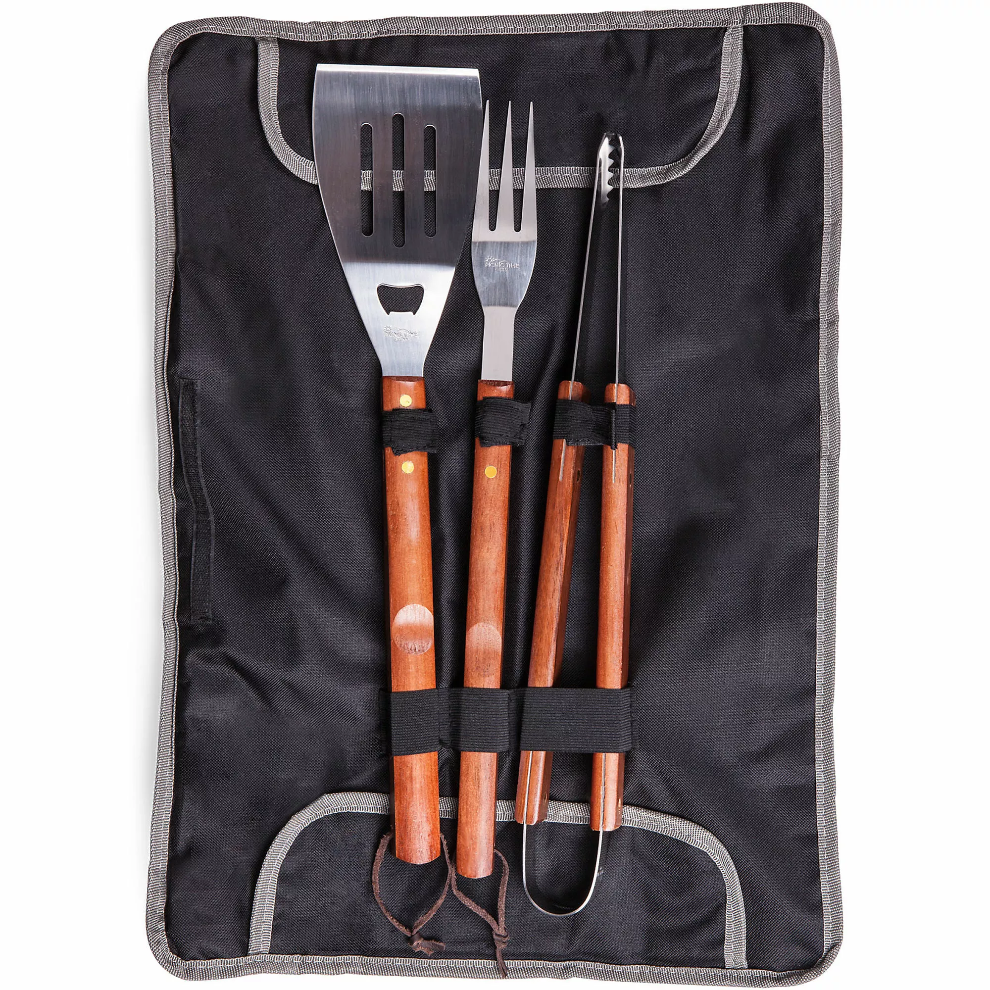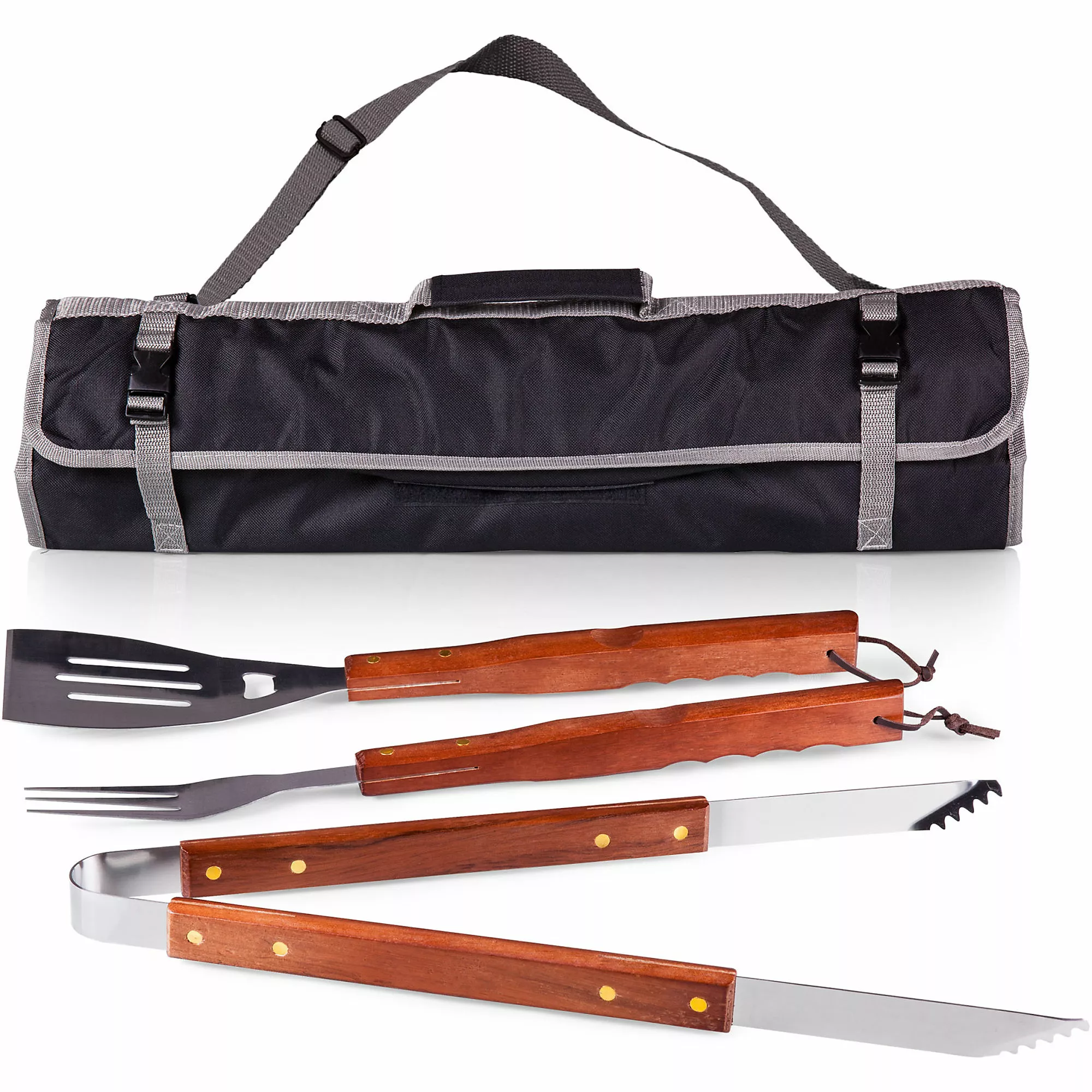 The Picnic Time 3-Piece BBQ Tote is a sleek and stylish barbecue set in a roll-up polyester bag with an adjustable shoulder strap. This highly portable bag securely holds all the stainless steel grilling tools you need for the job: one large spatula with an integrated bottle opener, one bbq fork, and tongs. The perfect gift for the grill master in your life, the tools have extra-long, beautiful wooden handles to keep your hands away from the flames, and metal loops at the ends to hang on the bbq. Fire it up!