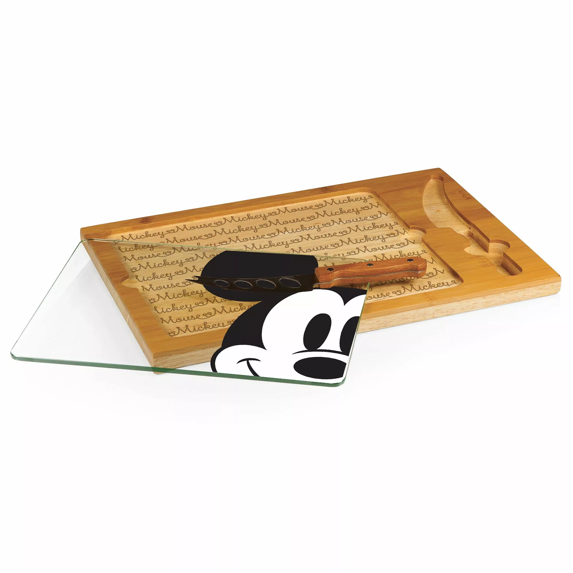 Celebrate Mickey and all things Disney with the Mickey Mouse Icon Glass-Top Serving Tray & Knife Set, a beautiful rectangular glass cutting board made from rich parawood and bamboo with a tempered glass tray and a carved-out section to snugly secure the included stainless steel fork-tipped cheese knife with a wooden handle. The removable glass tray features an adorable Mickey Mouse graphic and the cutting board is adorned with a stylish, wood-burned tapestry formed by the repeating words, “Mickey Mouse,” in cursive. You can also use this lovely cutting board as a cheese board or serving tray.