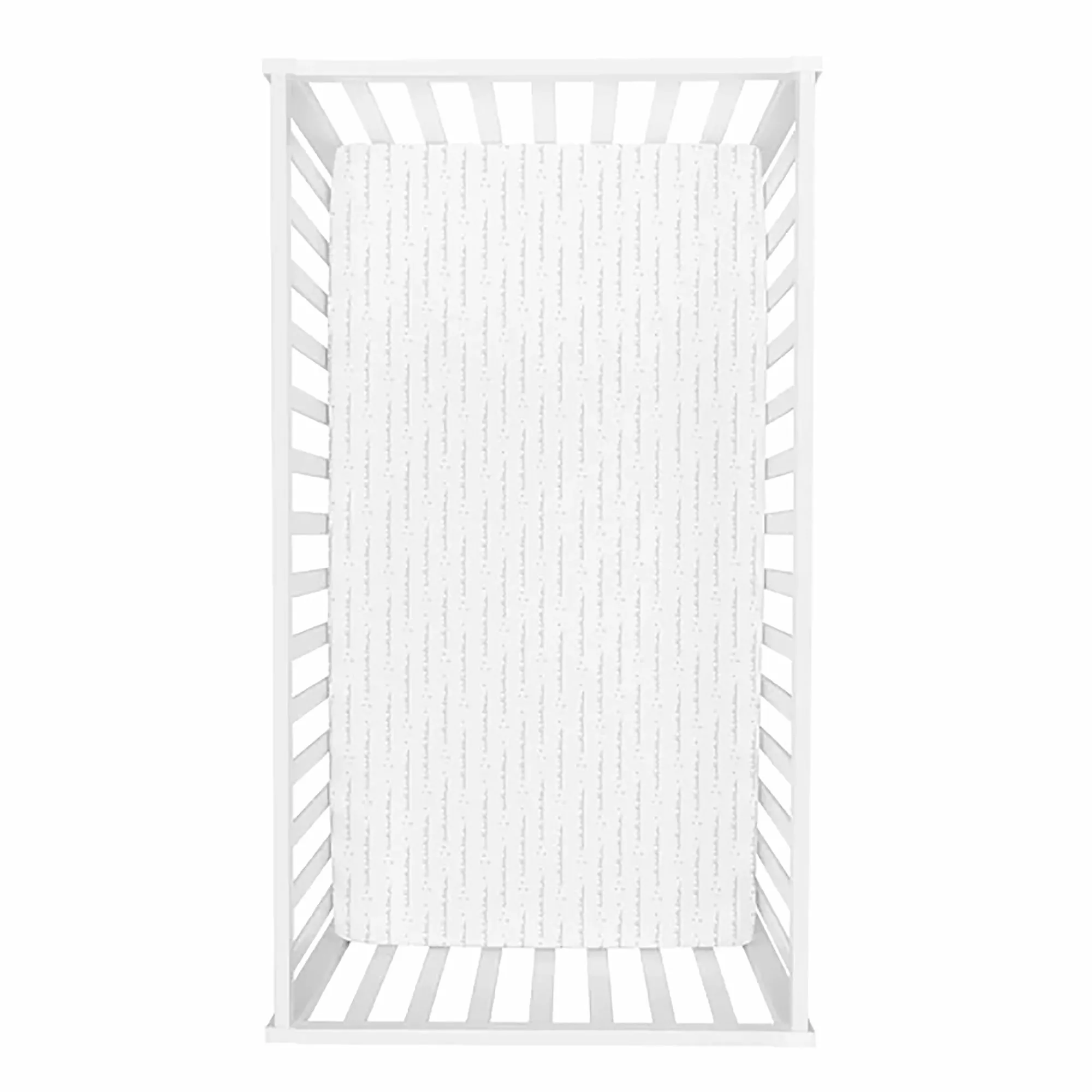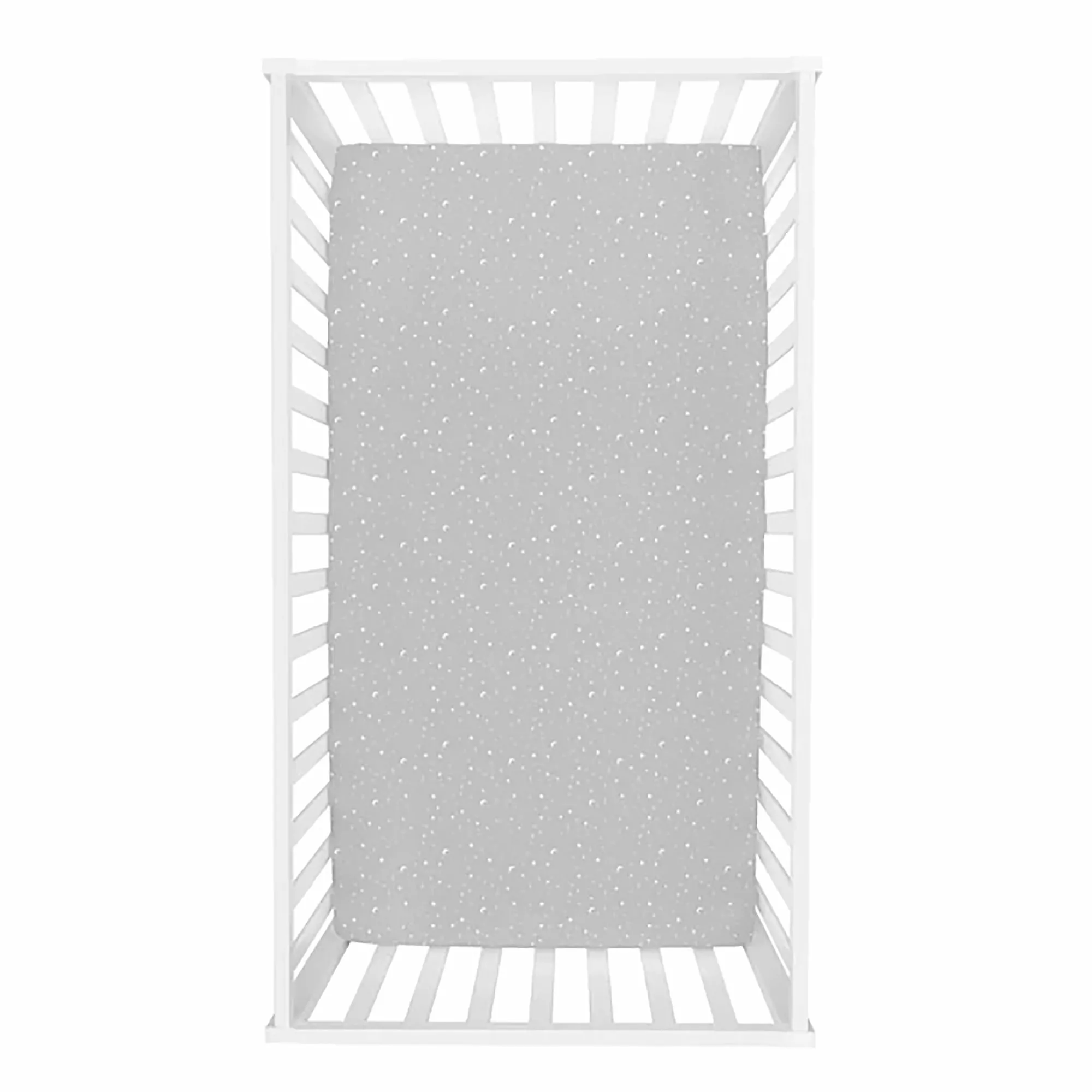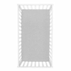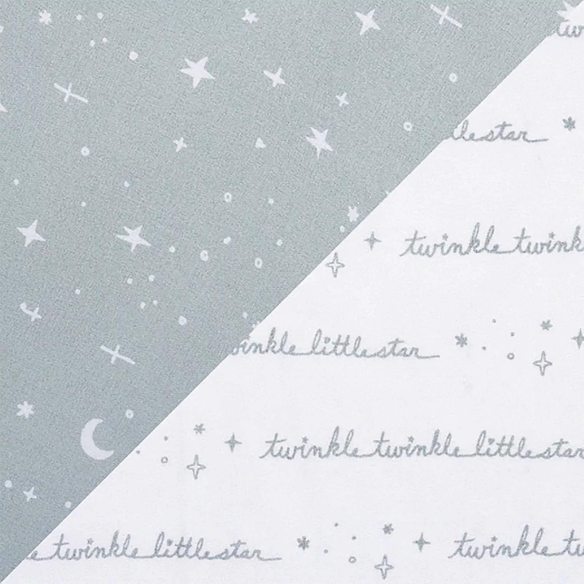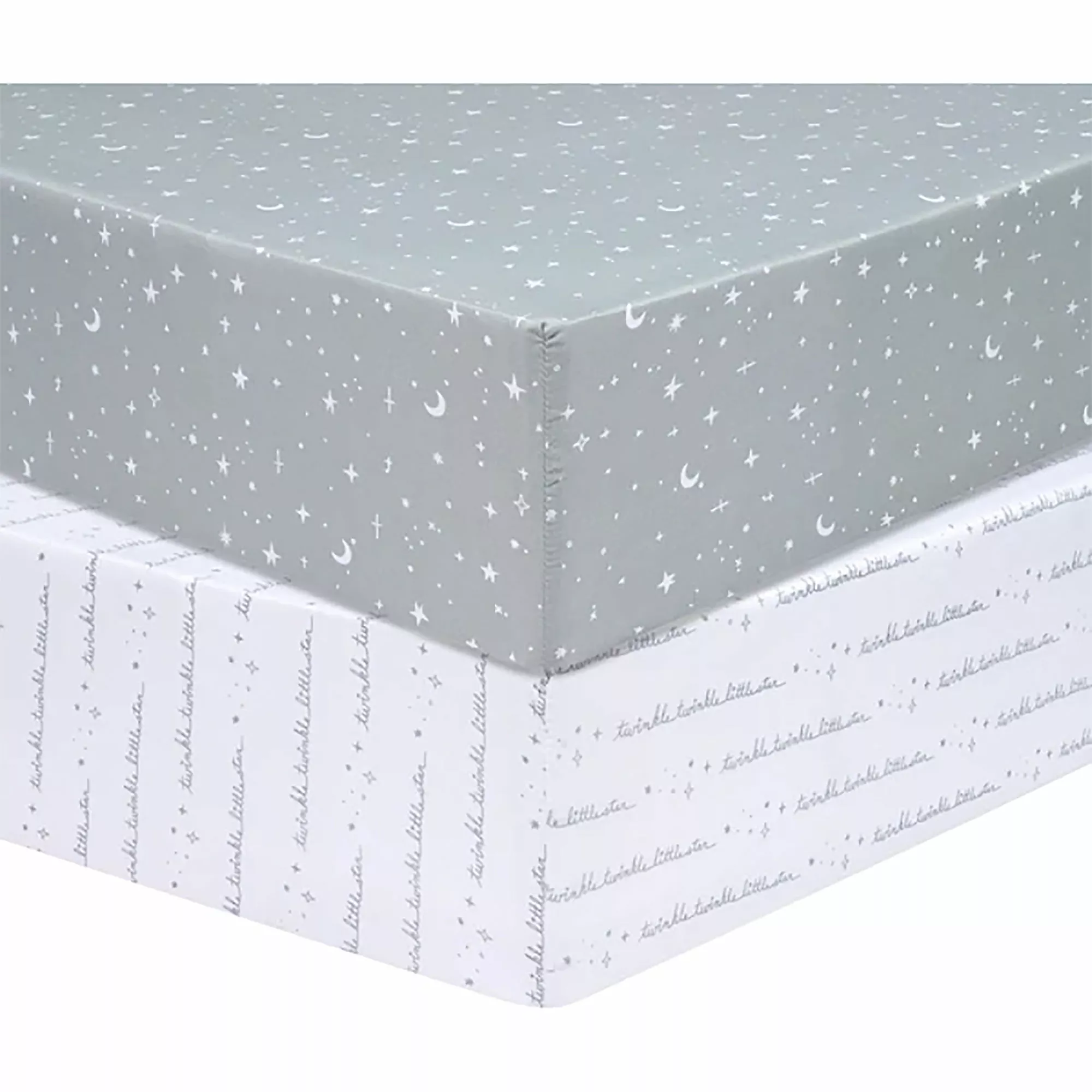 The Celestial 2-Pack Microfiber Fitted Crib Sheet Set by Sammy & Lou® features a white moon and stars print on a gray background and a “twinkle, twinkle little star” script print in gray on a white background. Crib sheets fit a standard 28 in x 52 in crib mattress with 8-inch deep pockets and elastic surrounding the entire opening ensuring a more secure fit. Additional coordinating Sammy & Lou® Crib Bedding Separates sold separately.